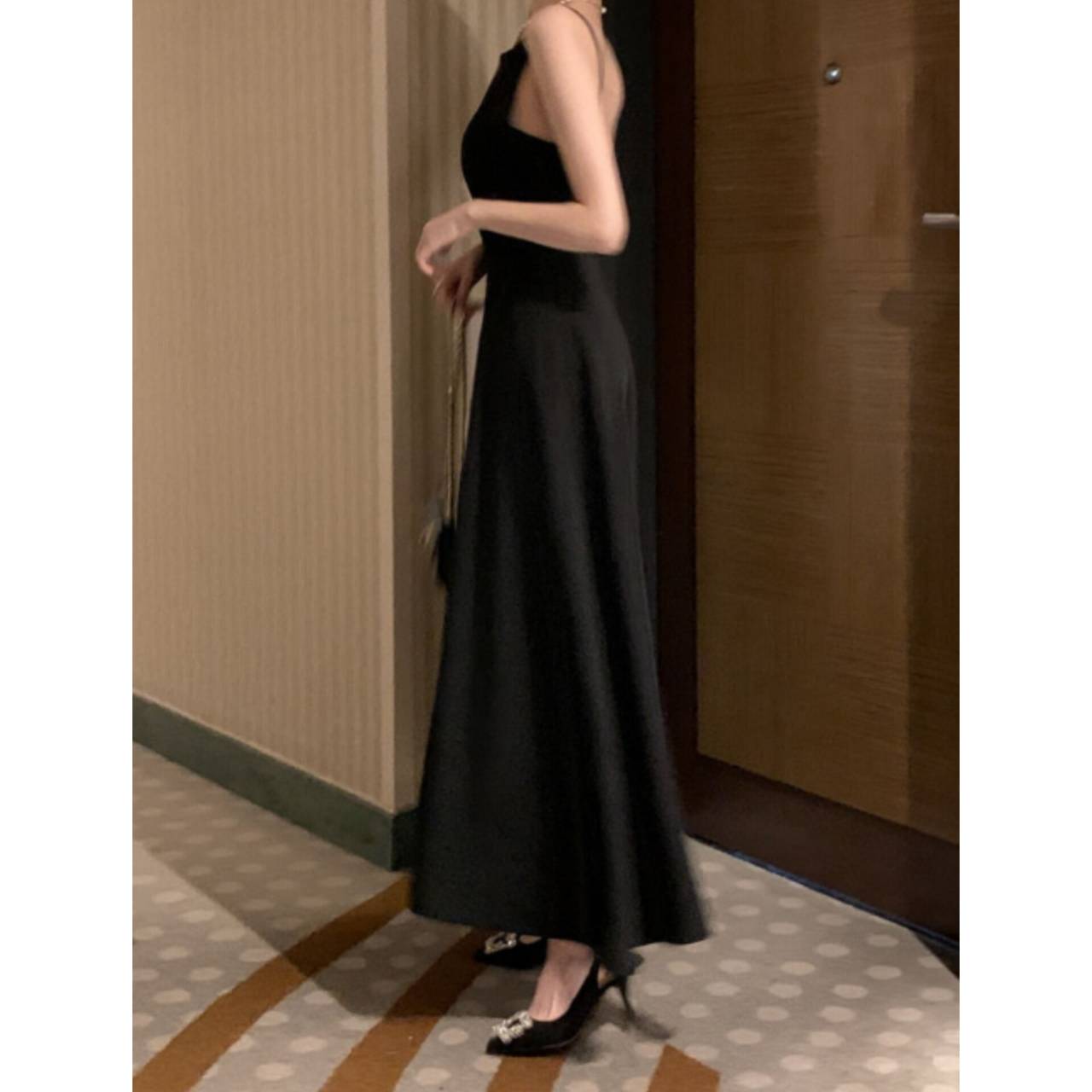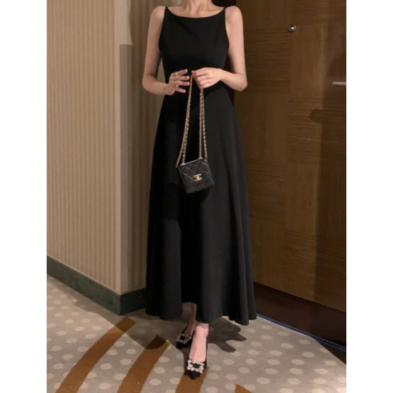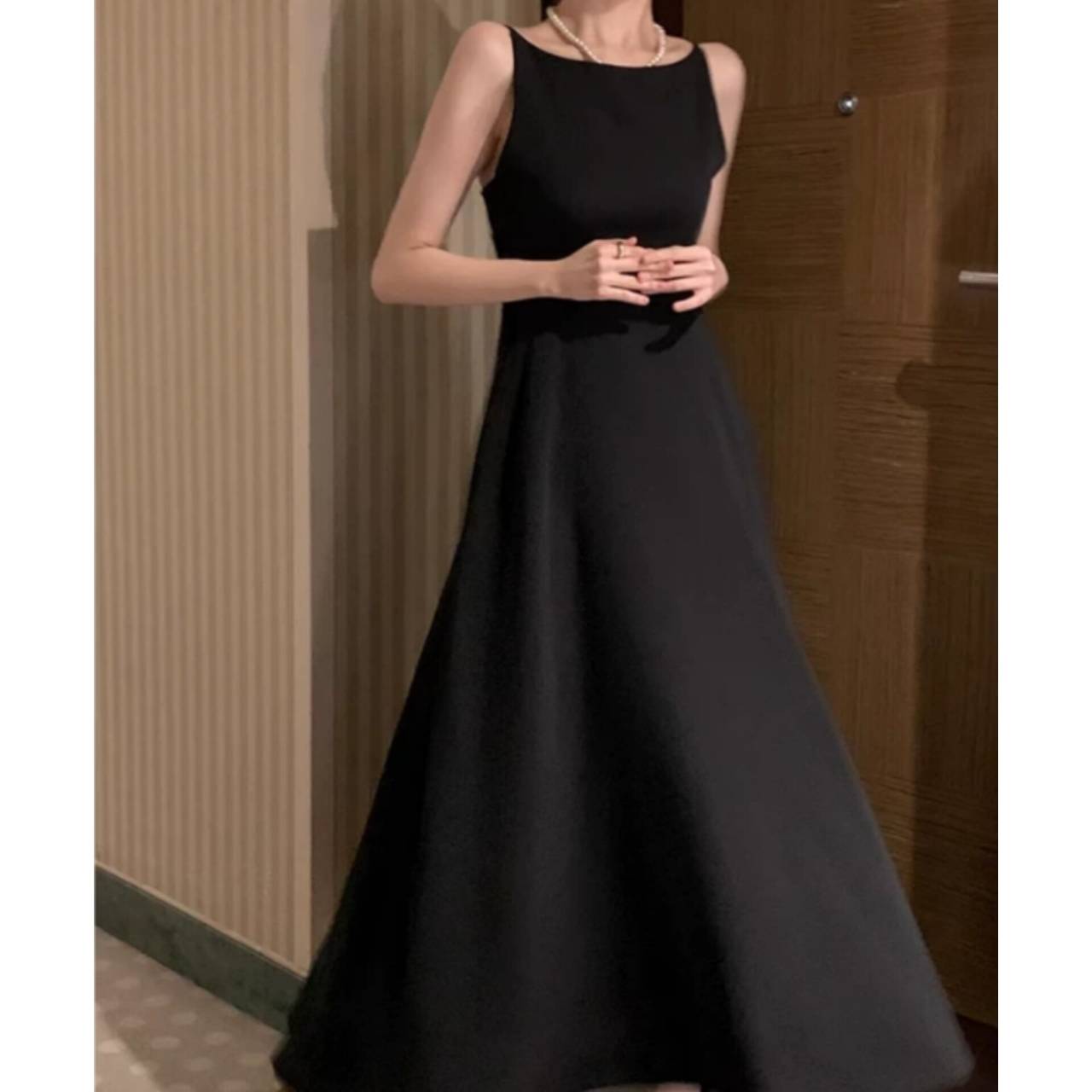 全3色 ワンピース ドレス 韓国ワンピース ワンピ キャミドレス ノースリーブ スパゲティストラップ ボートネック バックレス ハイウエスト フレア Aライン マキシ丈 ロング エレガント 体型カバー S/L 韓国【K7897】