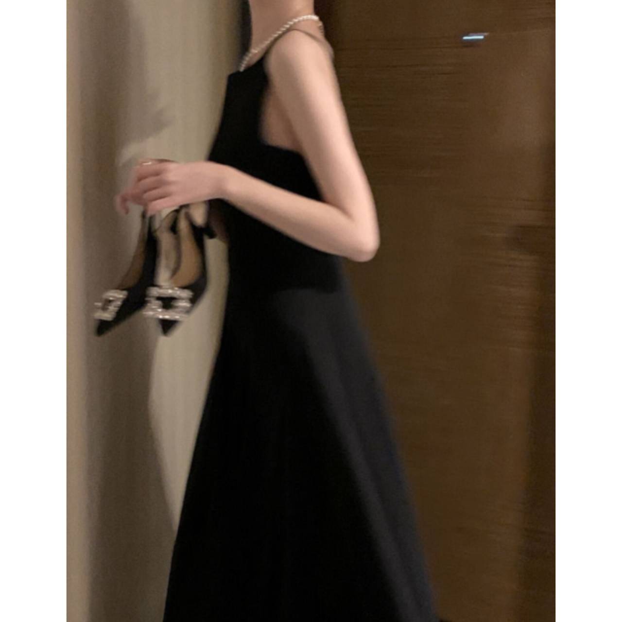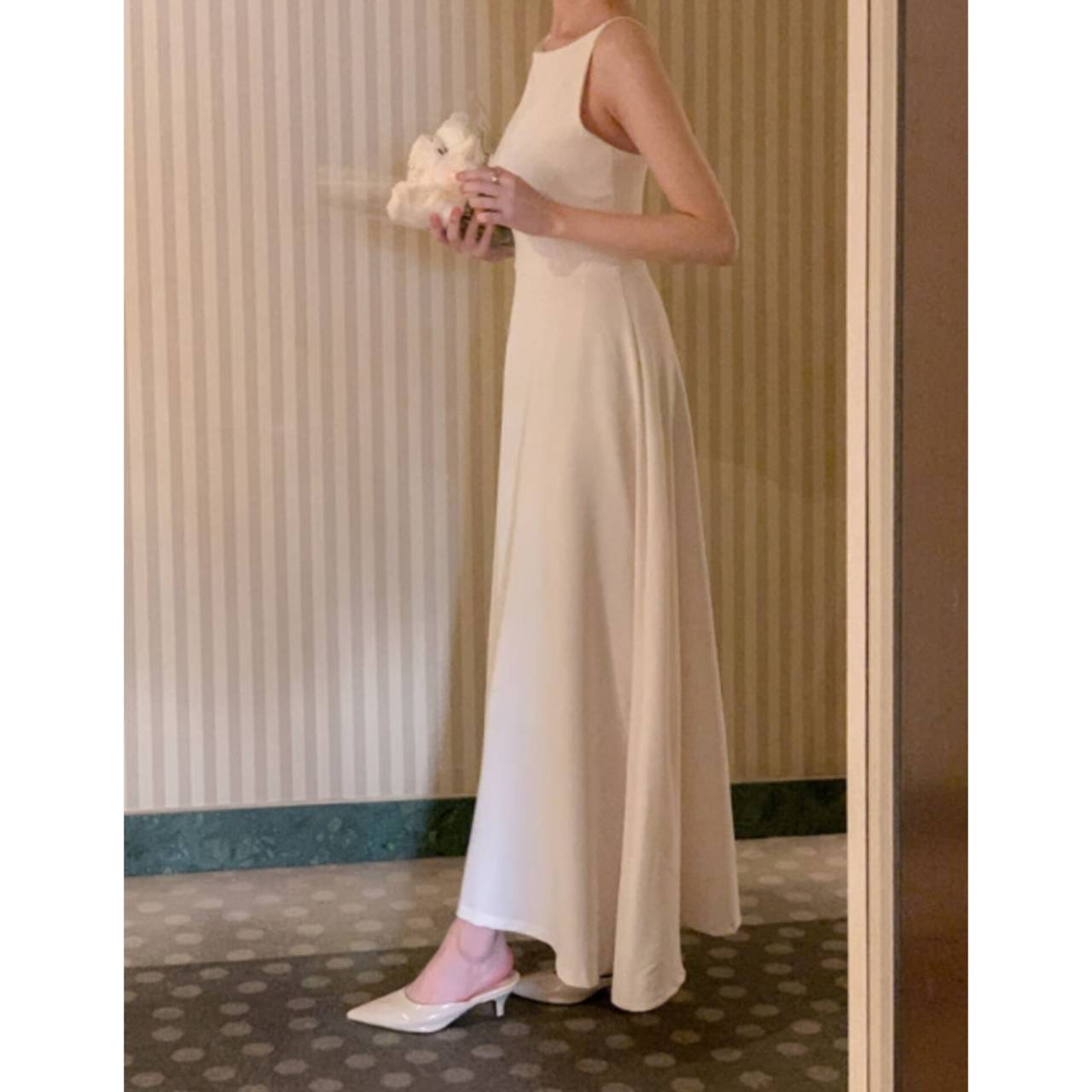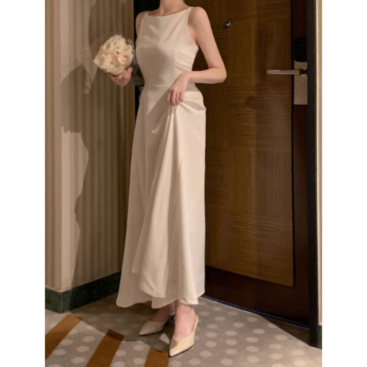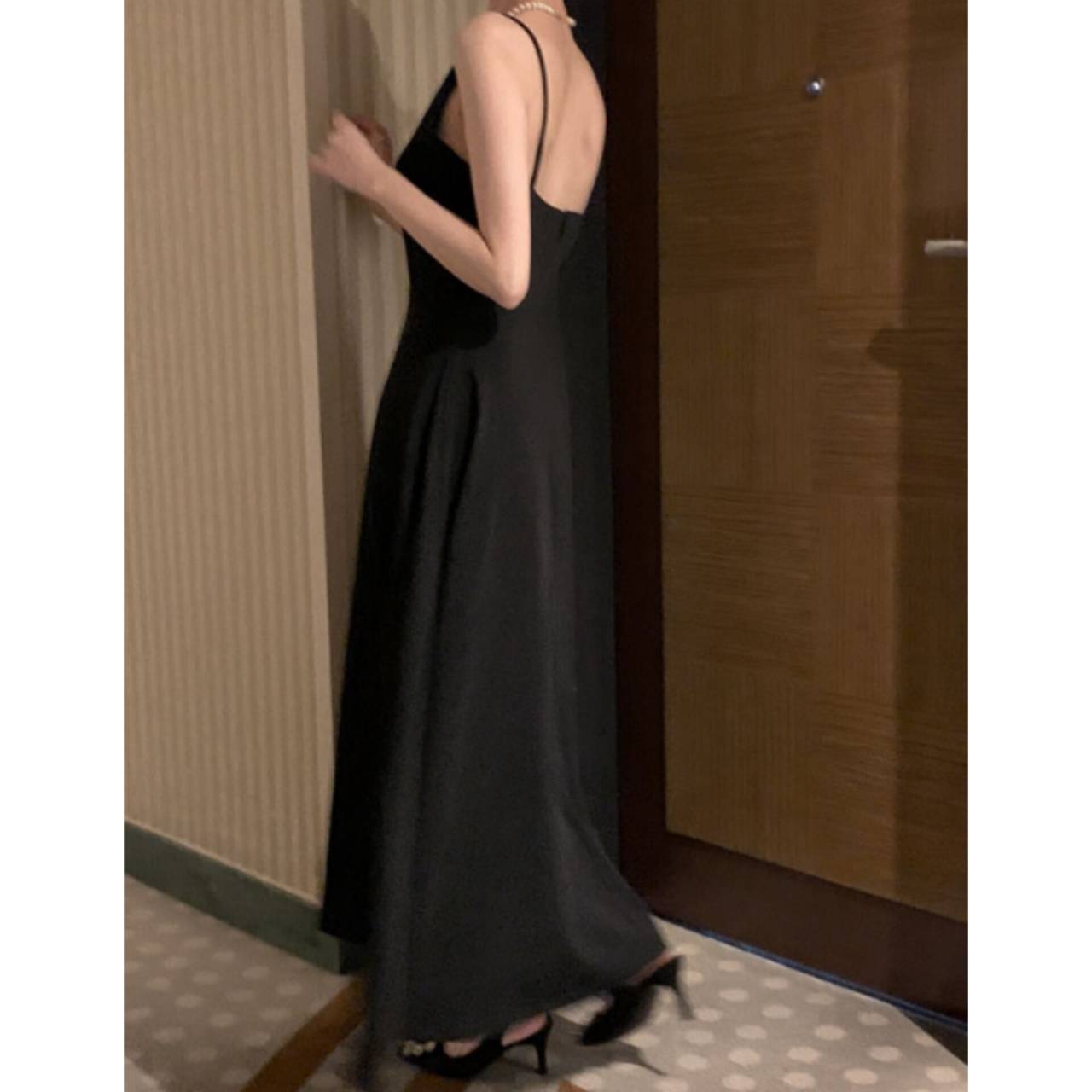 全3色 ワンピース ドレス 韓国ワンピース ワンピ キャミドレス ノースリーブ スパゲティストラップ ボートネック バックレス ハイウエスト フレア Aライン マキシ丈 ロング エレガント 体型カバー S/L 韓国【K7897】