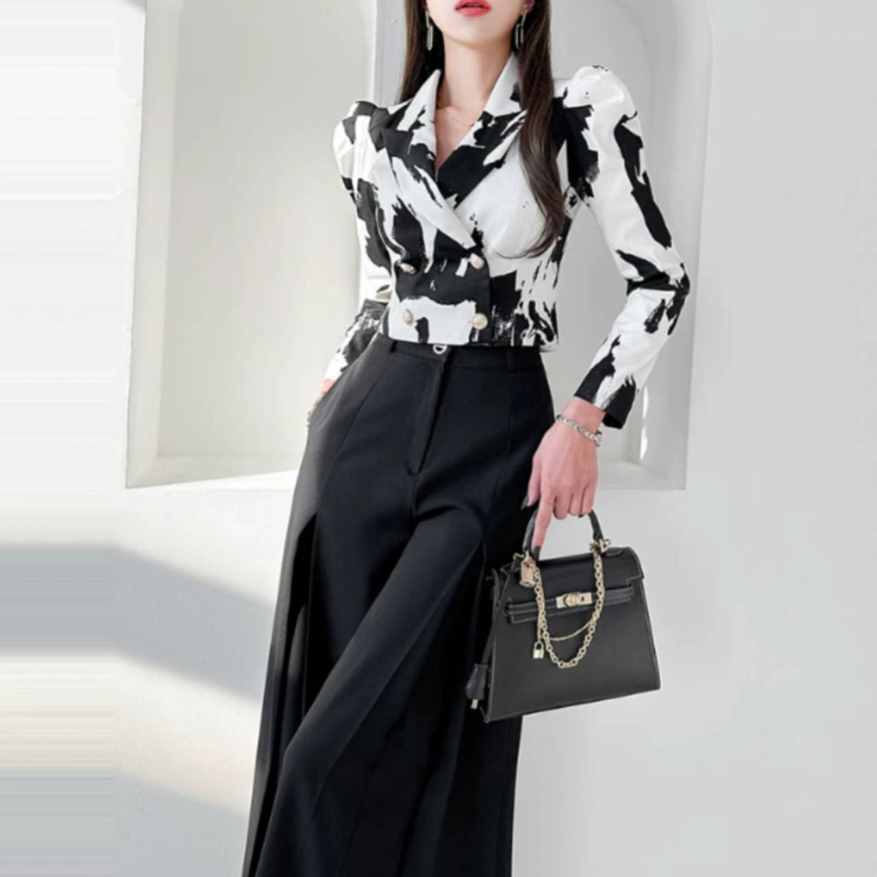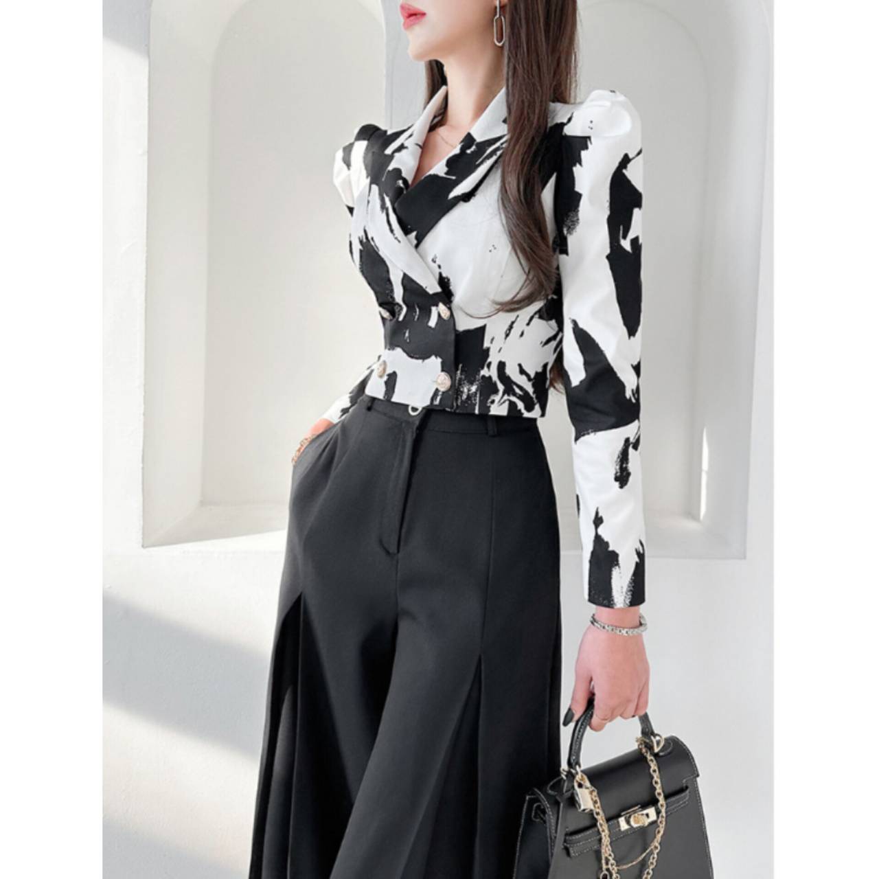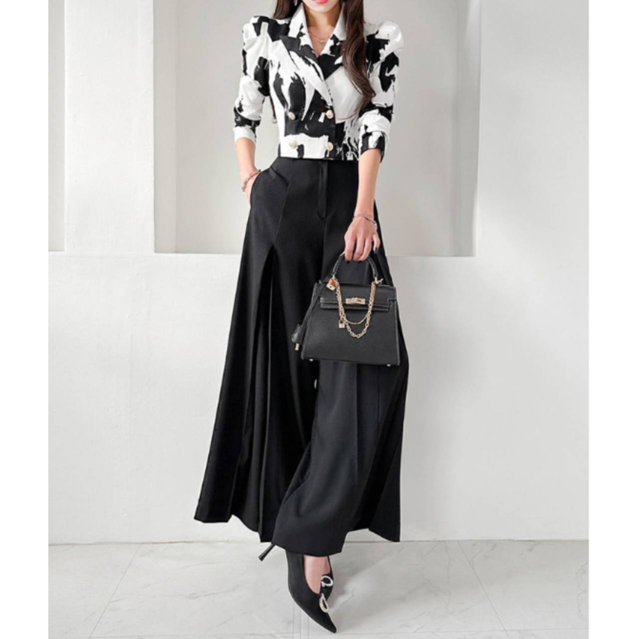 セットアップ パンツドレス セットアップドレス 韓国ドレス パンツスーツ クロップド丈ジャケット ショート丈ジャケット 長袖 パワーショルダー パワショル ロングスリーブ 金ボタン ゴールドボタン フロントボタン ワイドパンツ ハイウエスト ワイドレッグ ロング タック入り 2ピース モノトーン バイカラー スタイリッシュ エレガント S/XL 韓国【K10633】