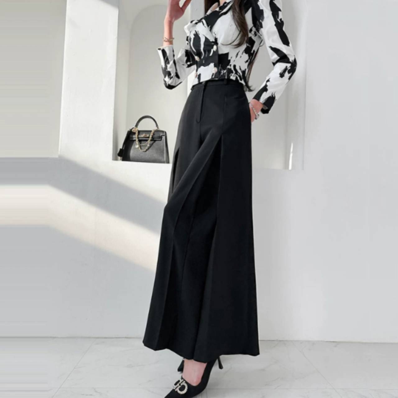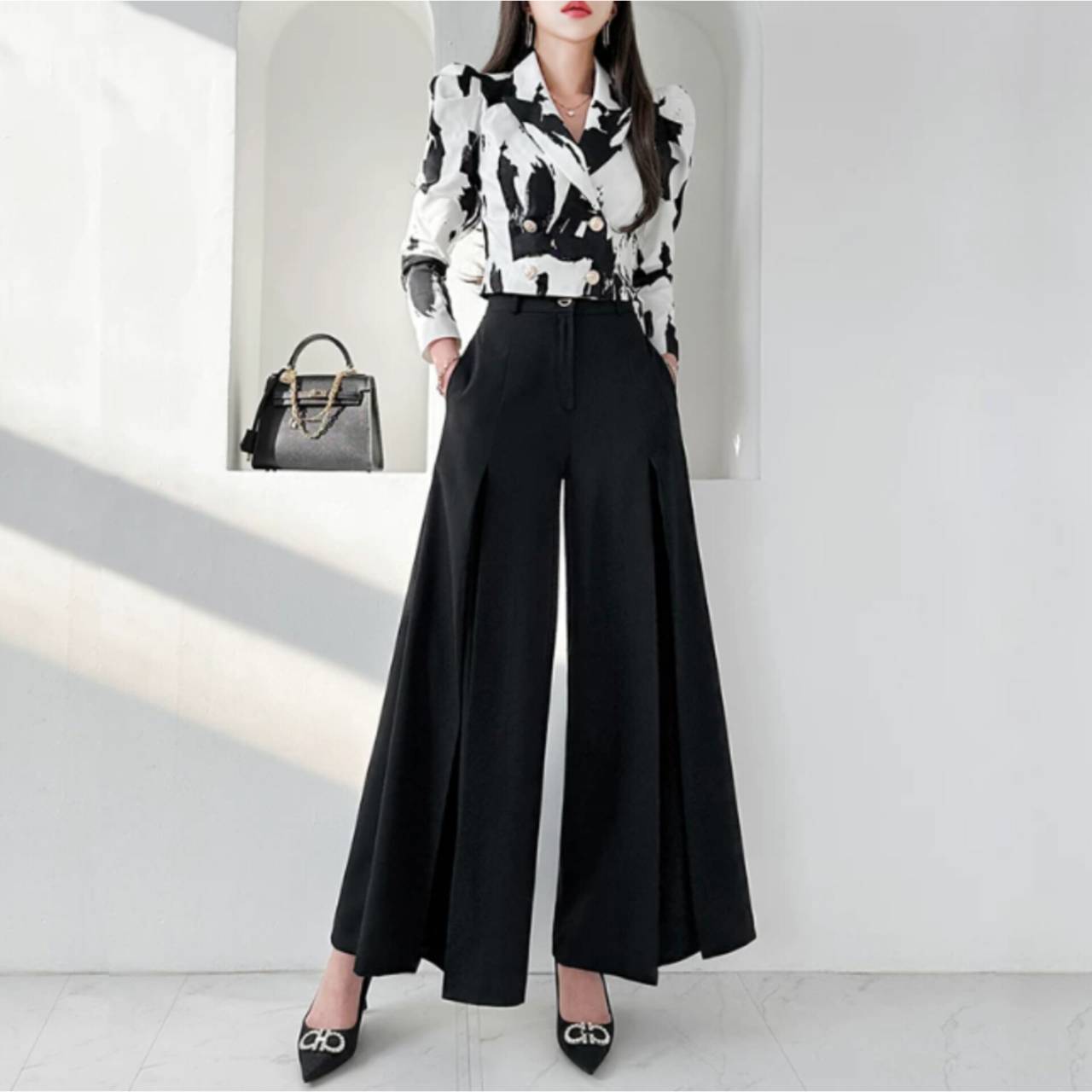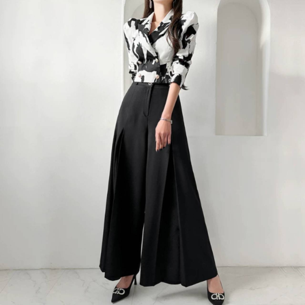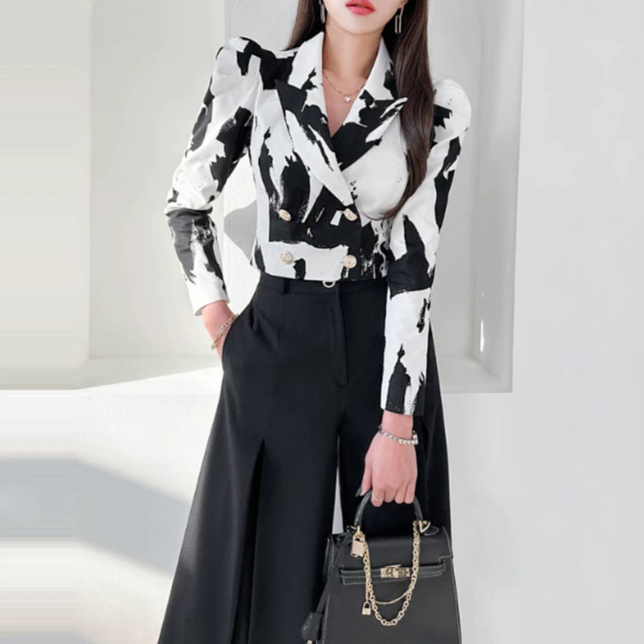 セットアップ パンツドレス セットアップドレス 韓国ドレス パンツスーツ クロップド丈ジャケット ショート丈ジャケット 長袖 パワーショルダー パワショル ロングスリーブ 金ボタン ゴールドボタン フロントボタン ワイドパンツ ハイウエスト ワイドレッグ ロング タック入り 2ピース モノトーン バイカラー スタイリッシュ エレガント S/XL 韓国【K10633】