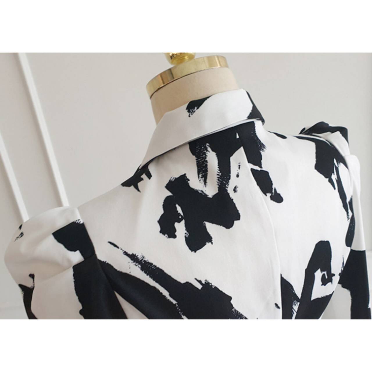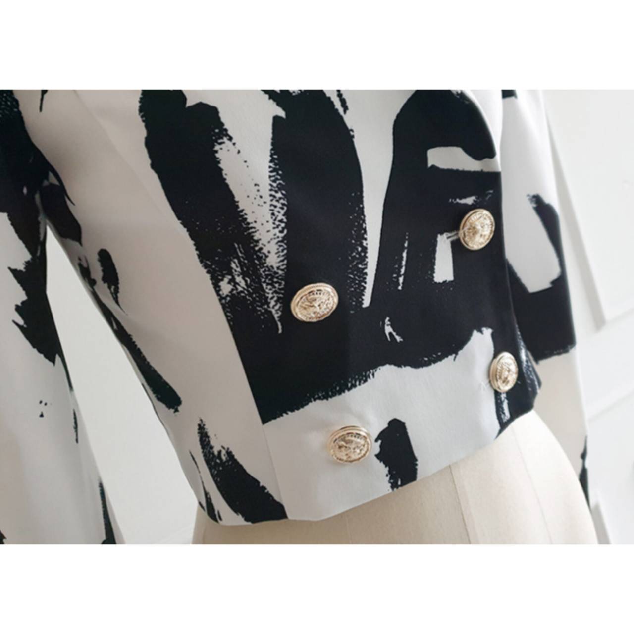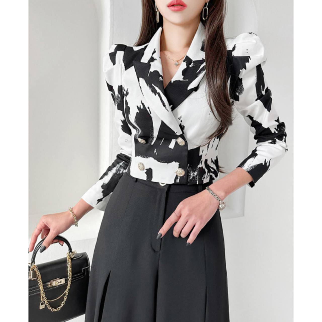 モードなモノトーン柄のショートジャケットは、ダブルボタン仕様でウエスト位置を高く見せ、自然にスタイルアップ。