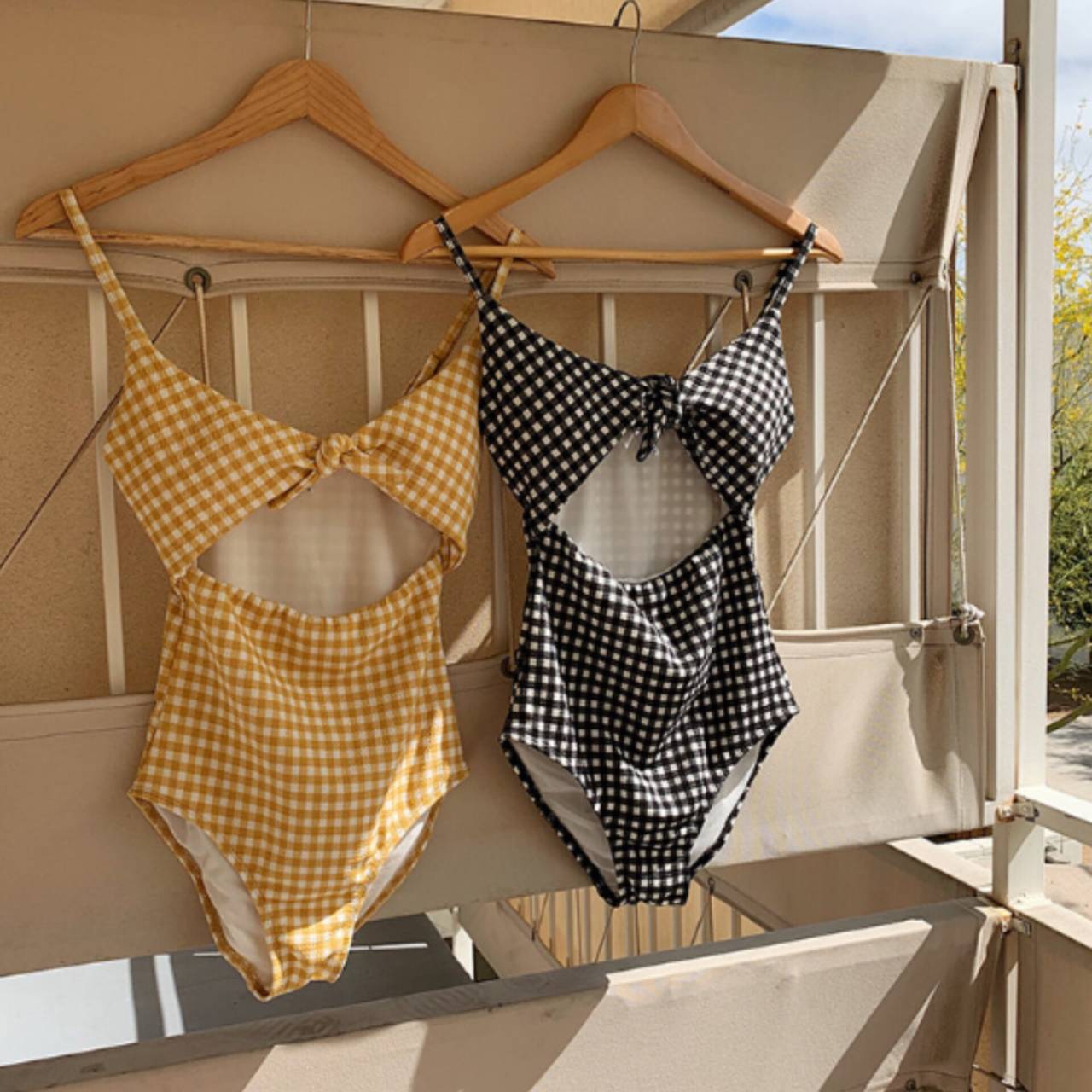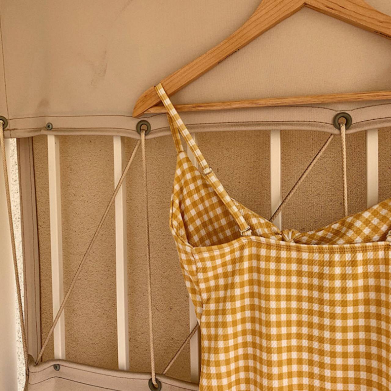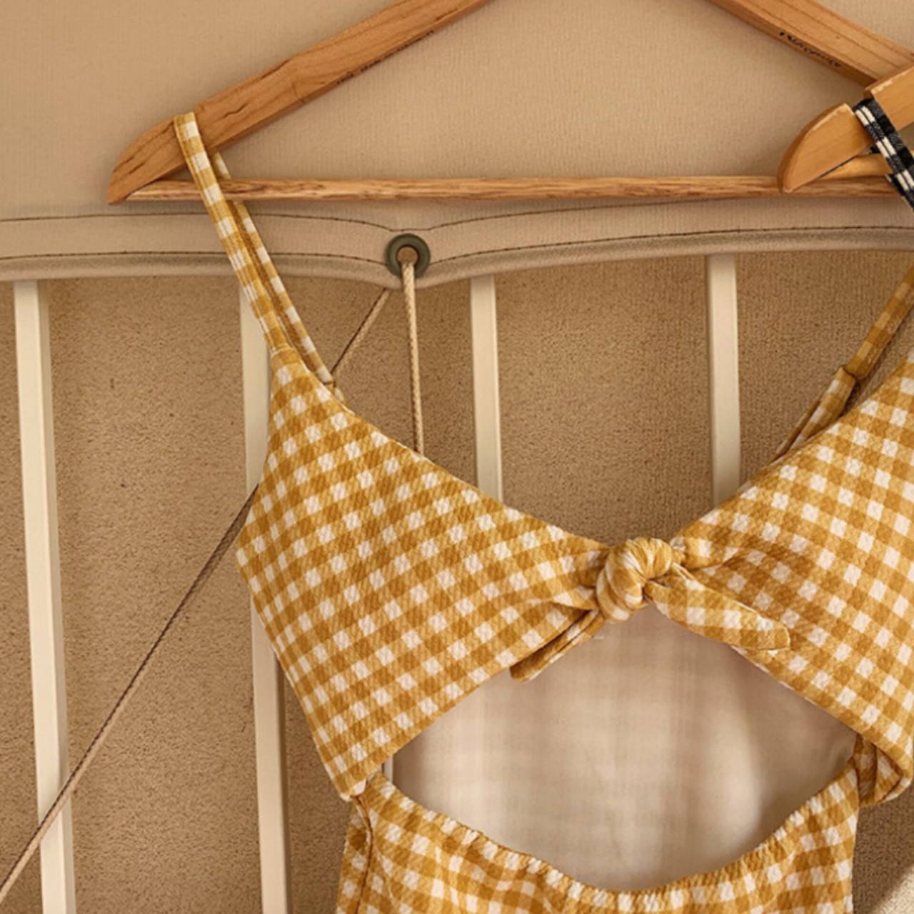 背中は程よい開きで、露出しすぎず大人の抜け感を演出します。カラーは爽やかで肌映えするイエロー×ホワイトのギンガムチェック。