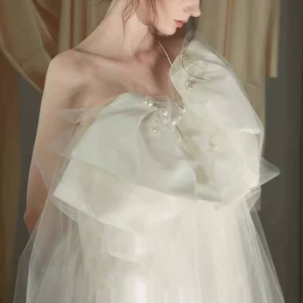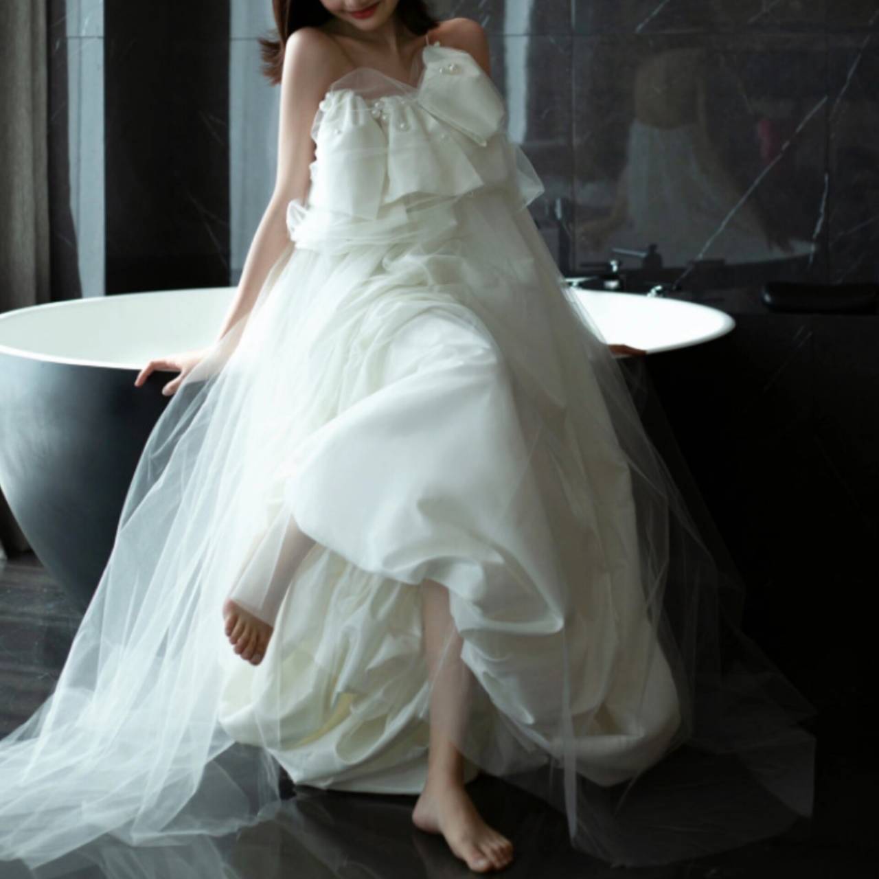 ビスチェ風 ウェディングドレス 韓国ドレス 胸元フリル 多層フリル 立体フリル サテン パール シアー チュール ロング フレア 体型カバー フェアリー XS/2XL 韓国【K11542】