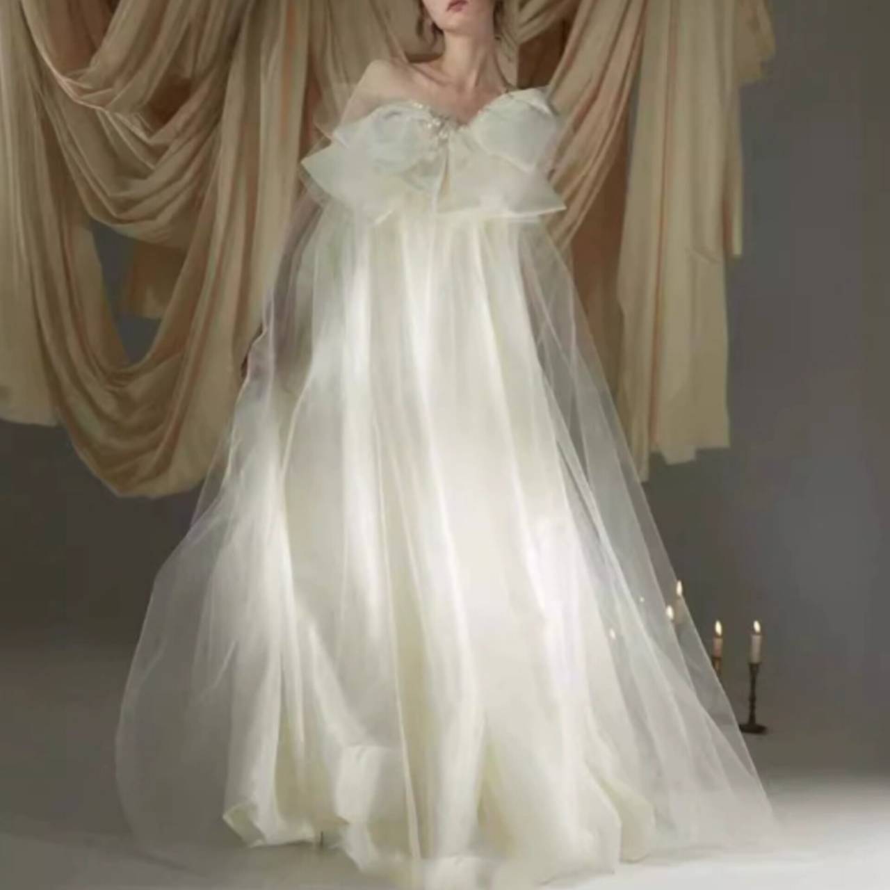 サイズ:XS〜2XLまで幅広く対応し、小柄花嫁から高身長の方まで安心してお選びいただけます。このドレスを纏った瞬間、鏡に映るのは“可愛い”だけではない、大人の余裕と透明感を併せ持つ花嫁の自分。