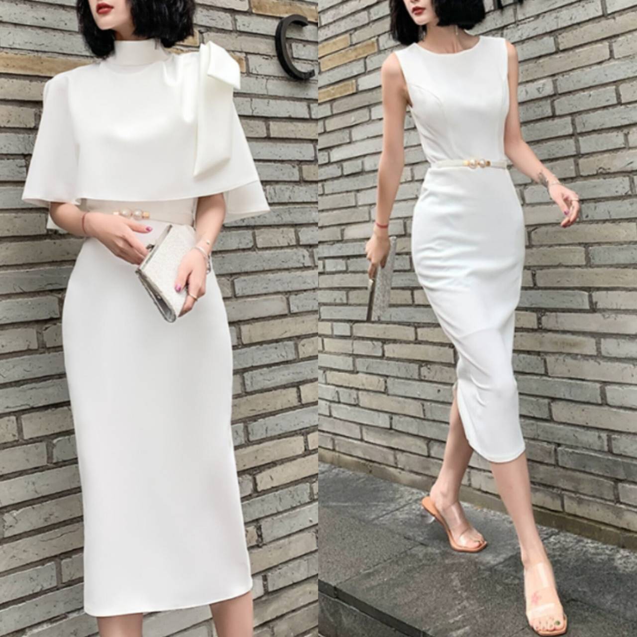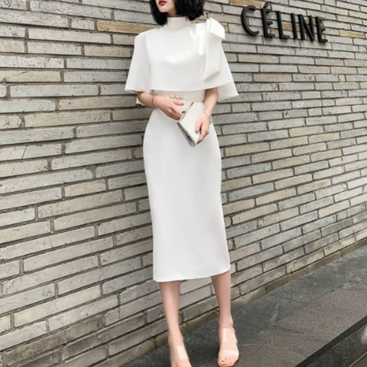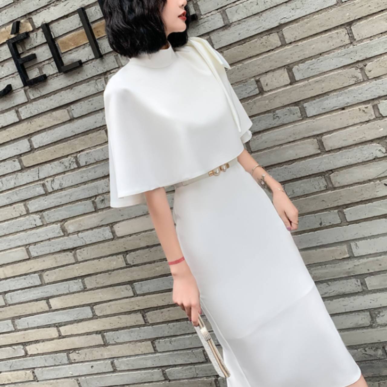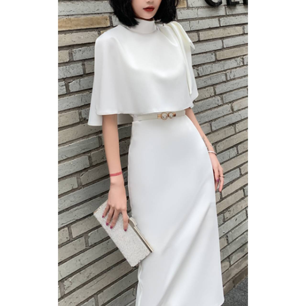 全3色 セットアップ ドレス イブニングドレス 韓国ドレス ケープ付き ハイネック 肩リボン ショルダーリボン アシンメトリー タイトドレス クルーネック ノースリーブ ハイウエスト ベルト付き ウエストマーク パール ミディアム丈 ミモレ丈 バックスリット ツーピース エレガント 大人 XS/3XL 韓国【K11443】