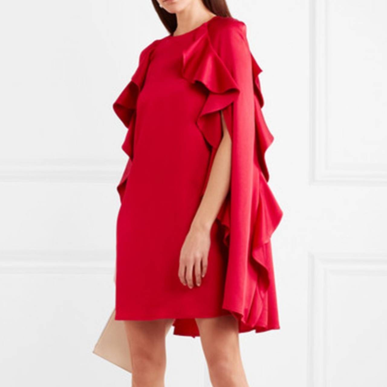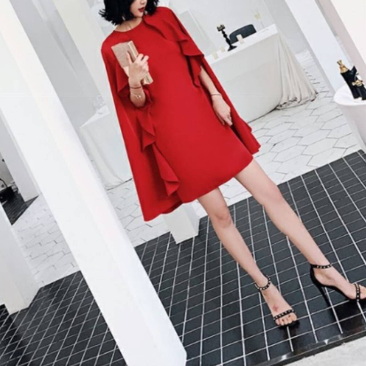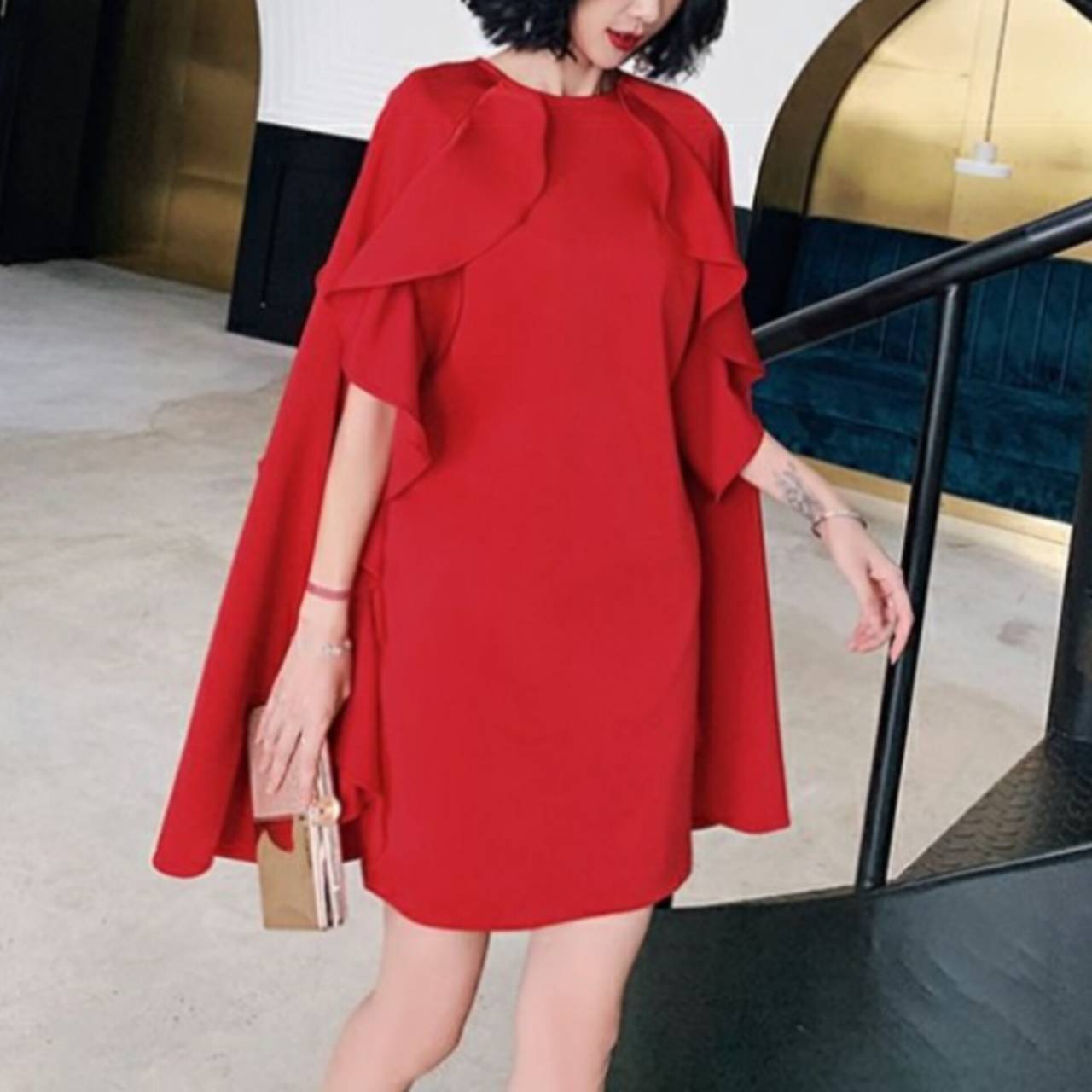 全2色 ドレス 韓国ドレス クルーネック マントスリーブ ケープスリーブ フリル ミニ丈 ショート丈 ラッフル 体型カバー 個性的 脚長効果 美脚効果 XS/3XL 韓国【B7846】