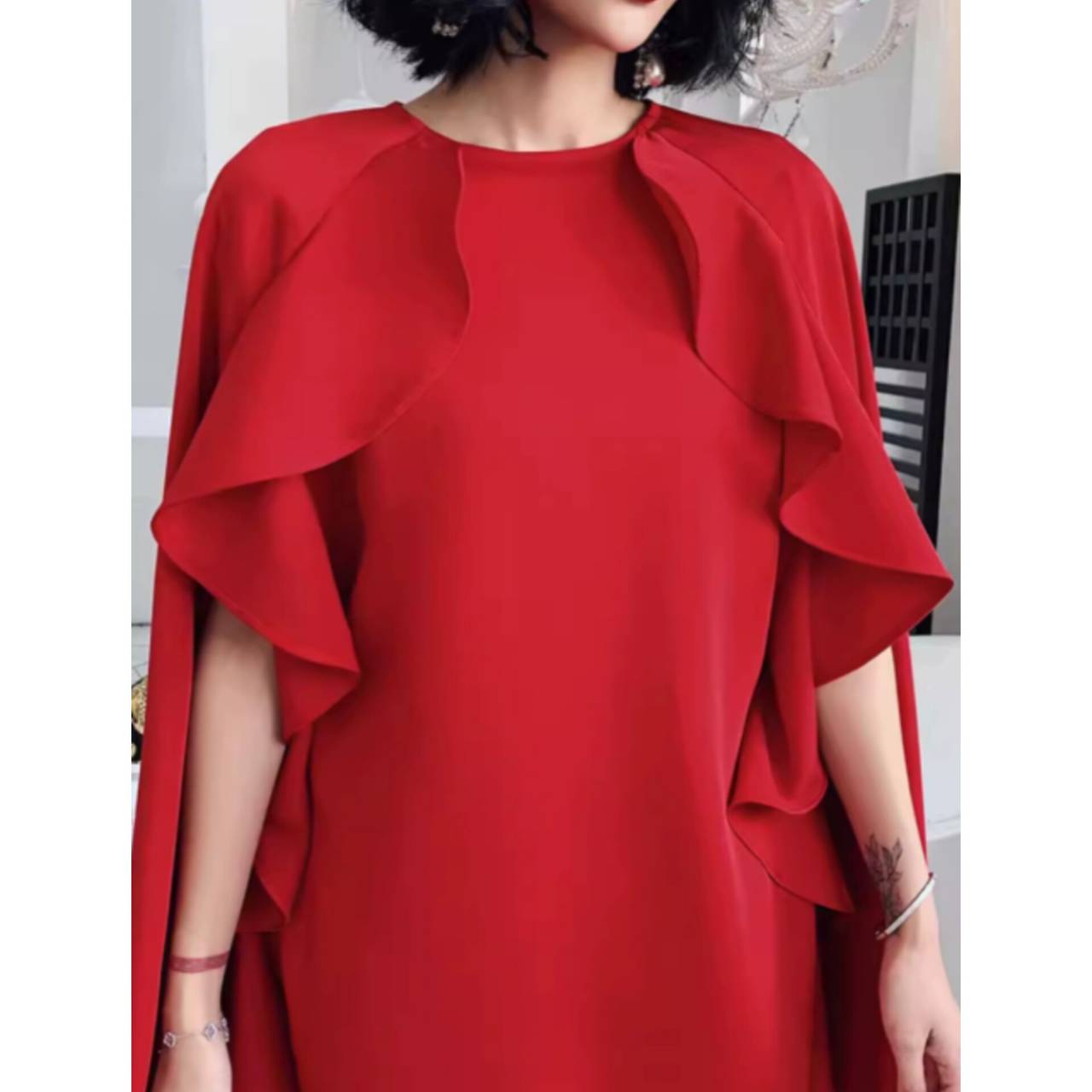 肩から流れるように広がるケープデザインは、二の腕を自然にカバーしつつ、体のラインを拾わないストレートシルエットで、どの角度から見ても美しく映える設計です。前から見るとシンプルで洗練されたワンピース。