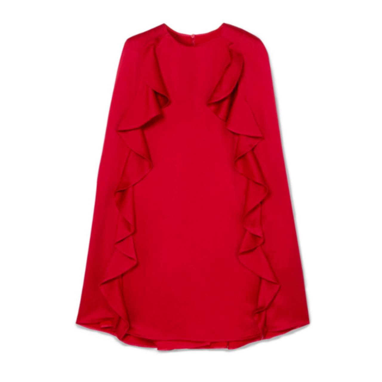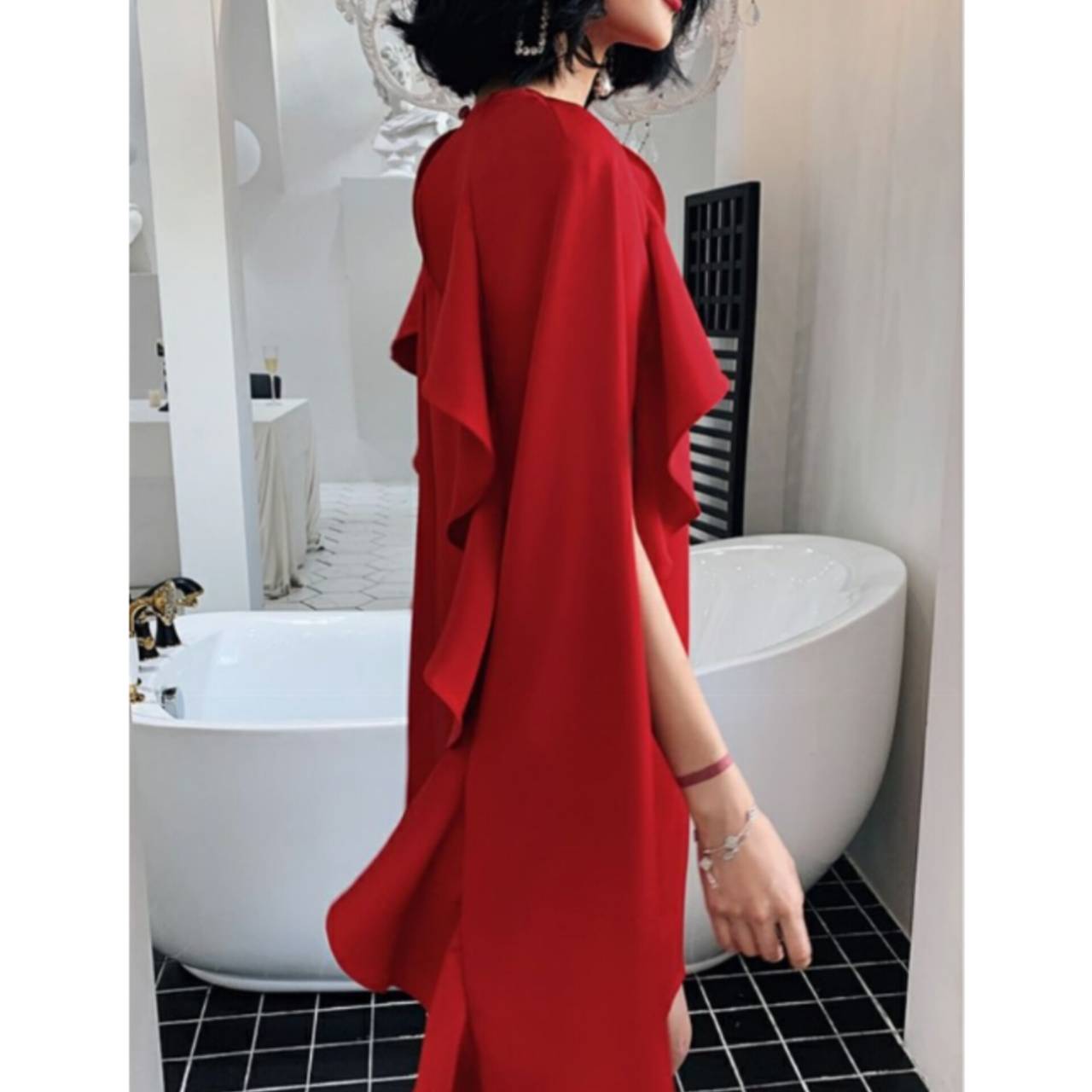 このケープドレスは、上質なとろみジョーゼット素材を贅沢に使用し、動くたびにエアリーに揺れる立体的なフリルケープが華やかさを演出します。