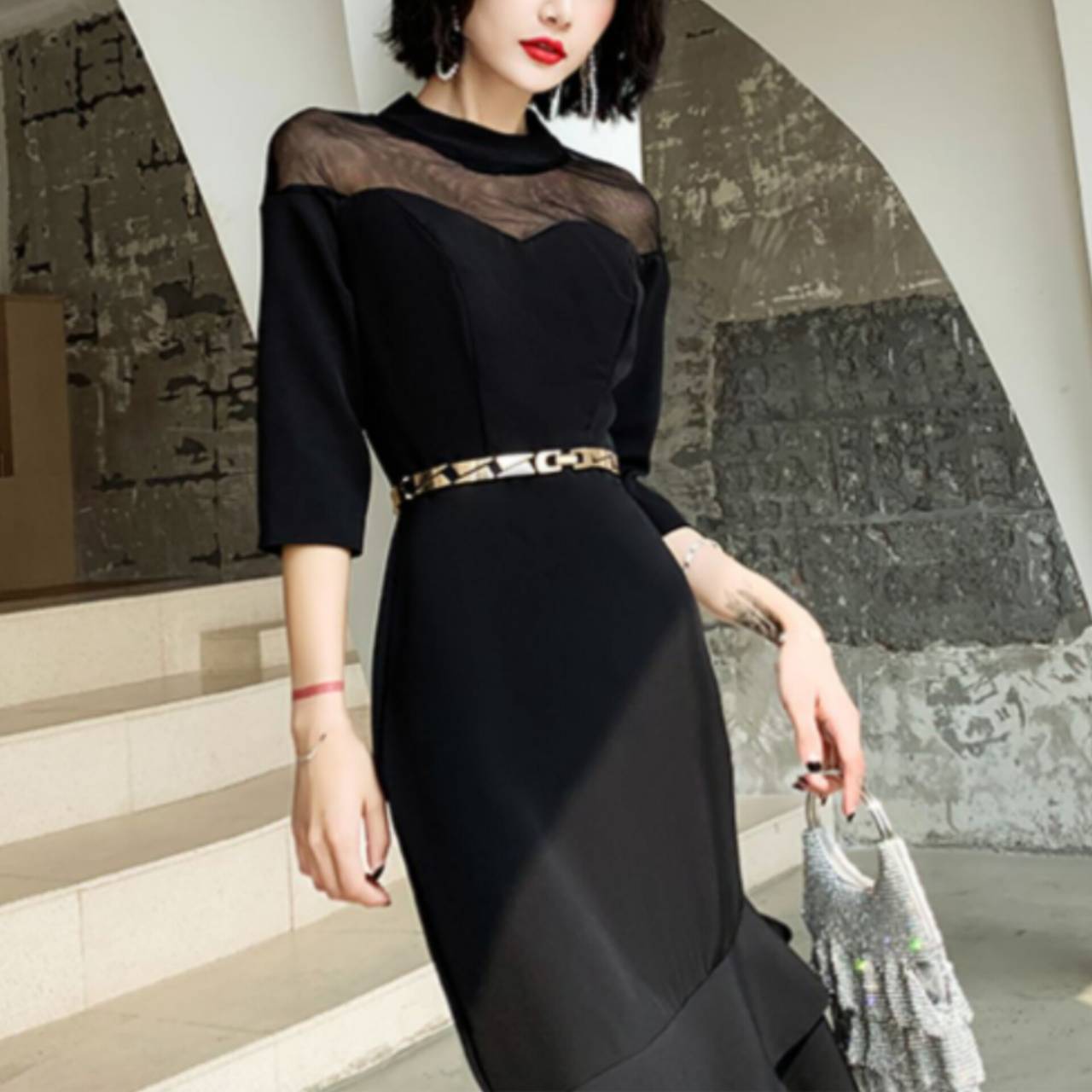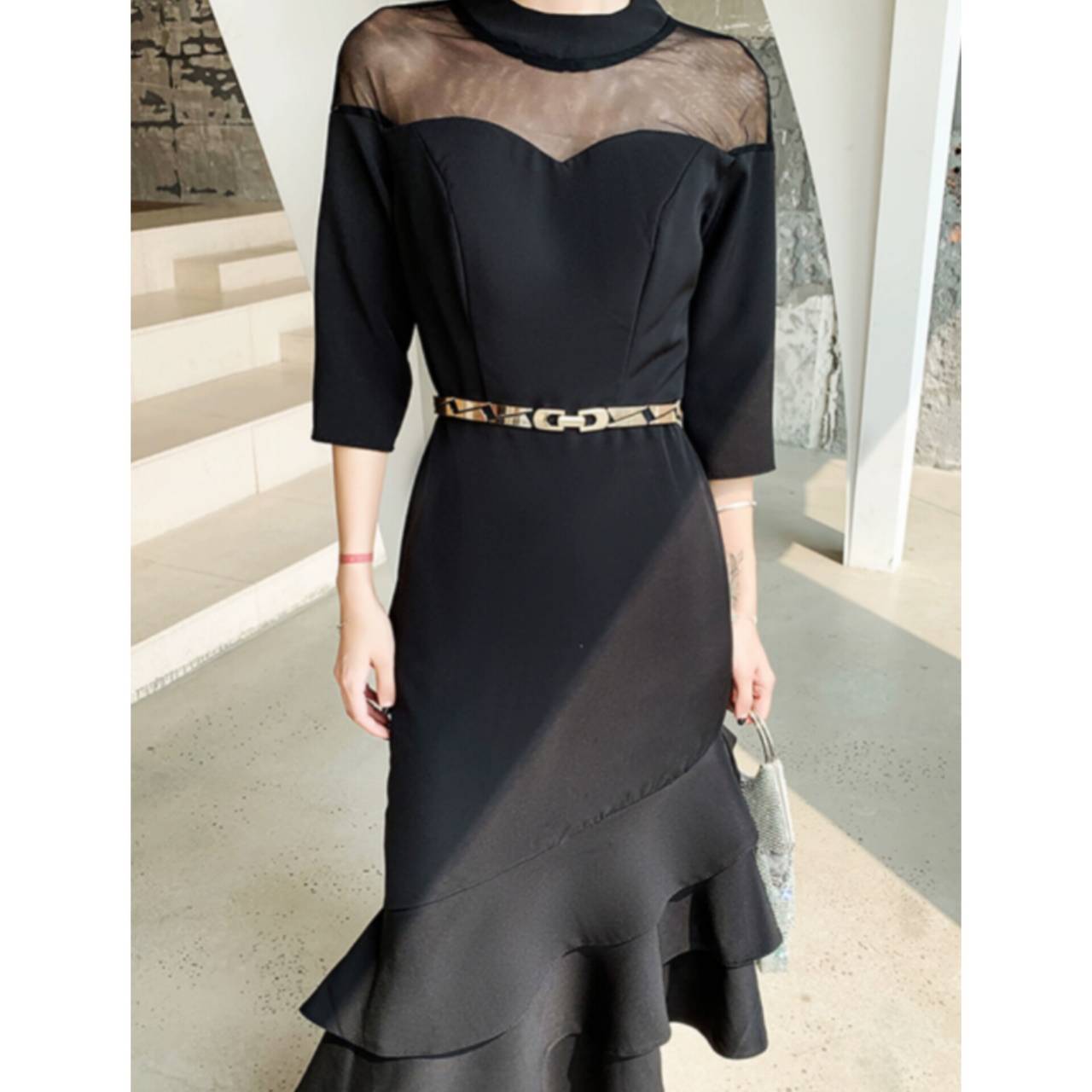 7分袖 ドレス イブニングドレス 韓国ドレス スタンドネック 肩元シアー ハイウエスト ウエストマーク ベルト付き マーメイド フリル ハイローヘム ロング マキシ丈 アシンメトリー ブラック XS/3XL 韓国【K3430】