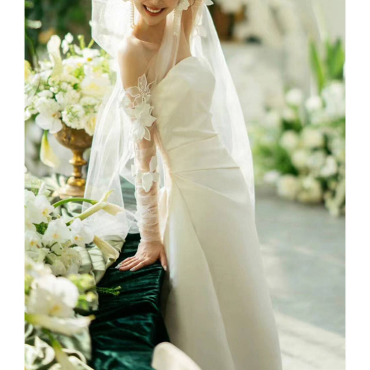 甘すぎない透明感で、洗練を纏う大人花嫁のための一着。上質なマットサテンをベースに、肩から腕にかけては繊細なチュール×立体フラワーモチーフを贅沢にあしらった、エフォートレスで洗練されたウェディングドレス。