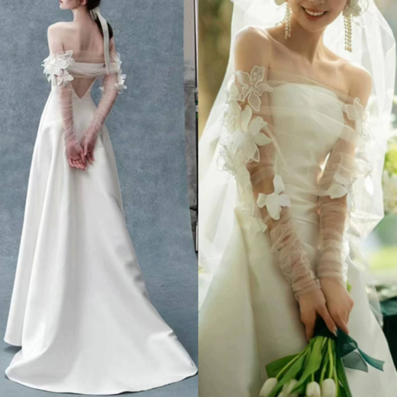 オフショルダー ウェディングドレス 韓国ドレス オフショル 3Dフラワー 立体フラワー お花 レース シアースリーブ 長袖 ロングスリーブ シースルー バックレス ハイウエスト Aライン ロング 異素材ミックス エレガント 体型カバー S/XL 韓国【K11110】