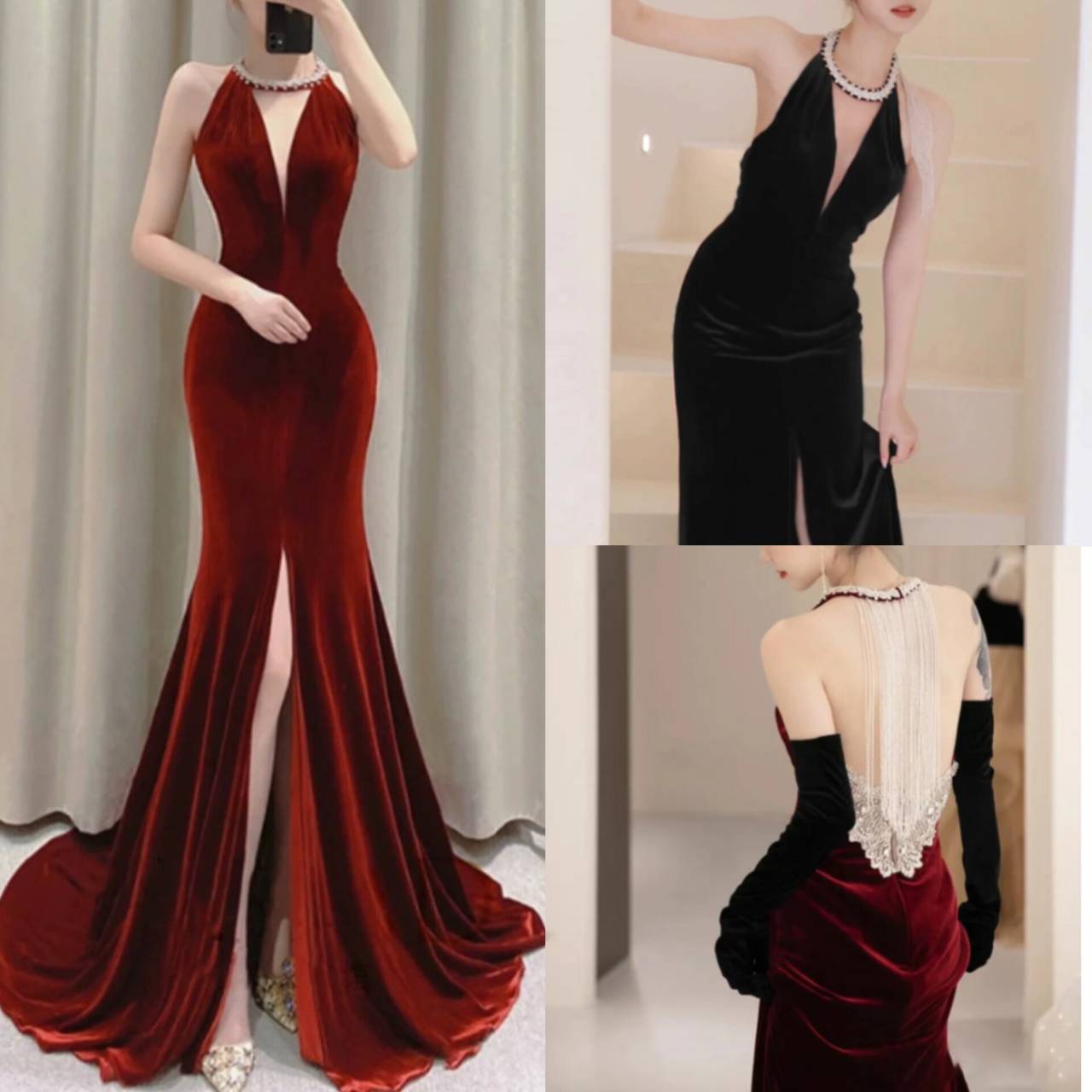 全2色 バックシャン ドレス イブニングドレス 韓国ドレス ホルターネック ビジュー キラキラ ベルベット バックコンシャス バックレス ハイウエスト マーメイド フロントスリット ハイスリット ロング 異素材ミックス クラシック 美シルエット エレガント S/2XL 韓国【K11295】