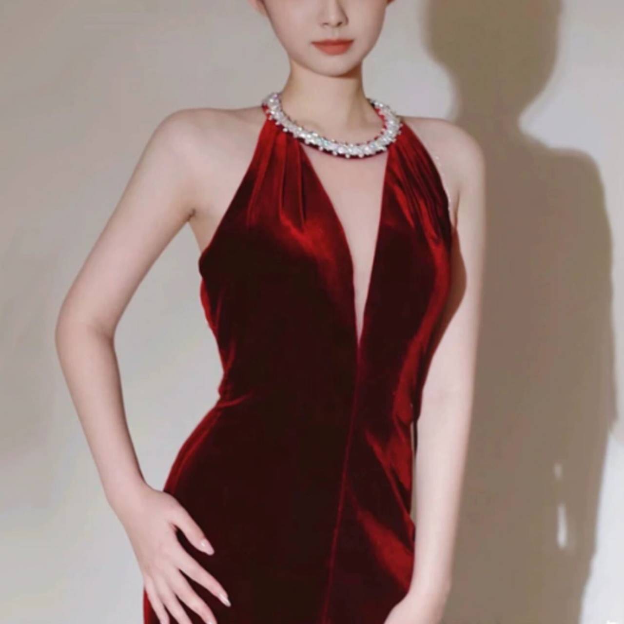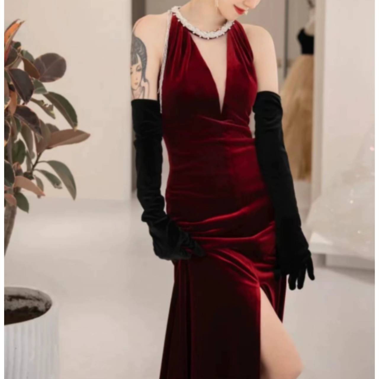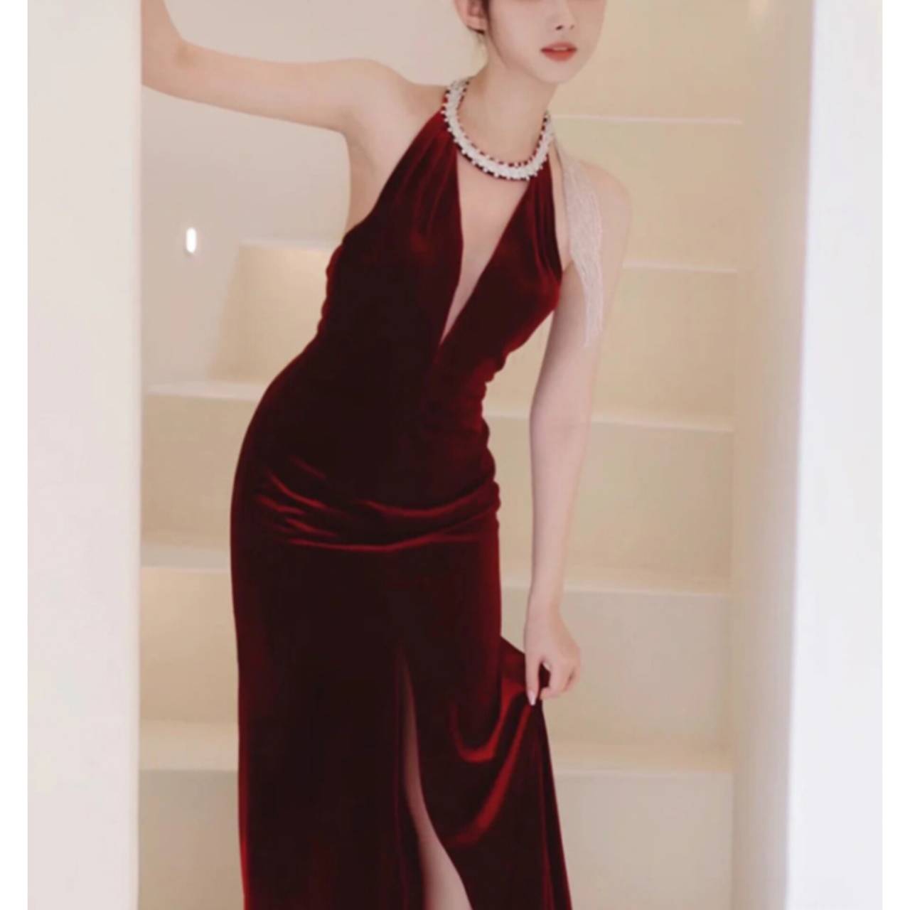 光を受けるたびに表情を変える深みのあるベルベットドレスが、肌を美しく引き立て、圧倒的な高級感を演出します。