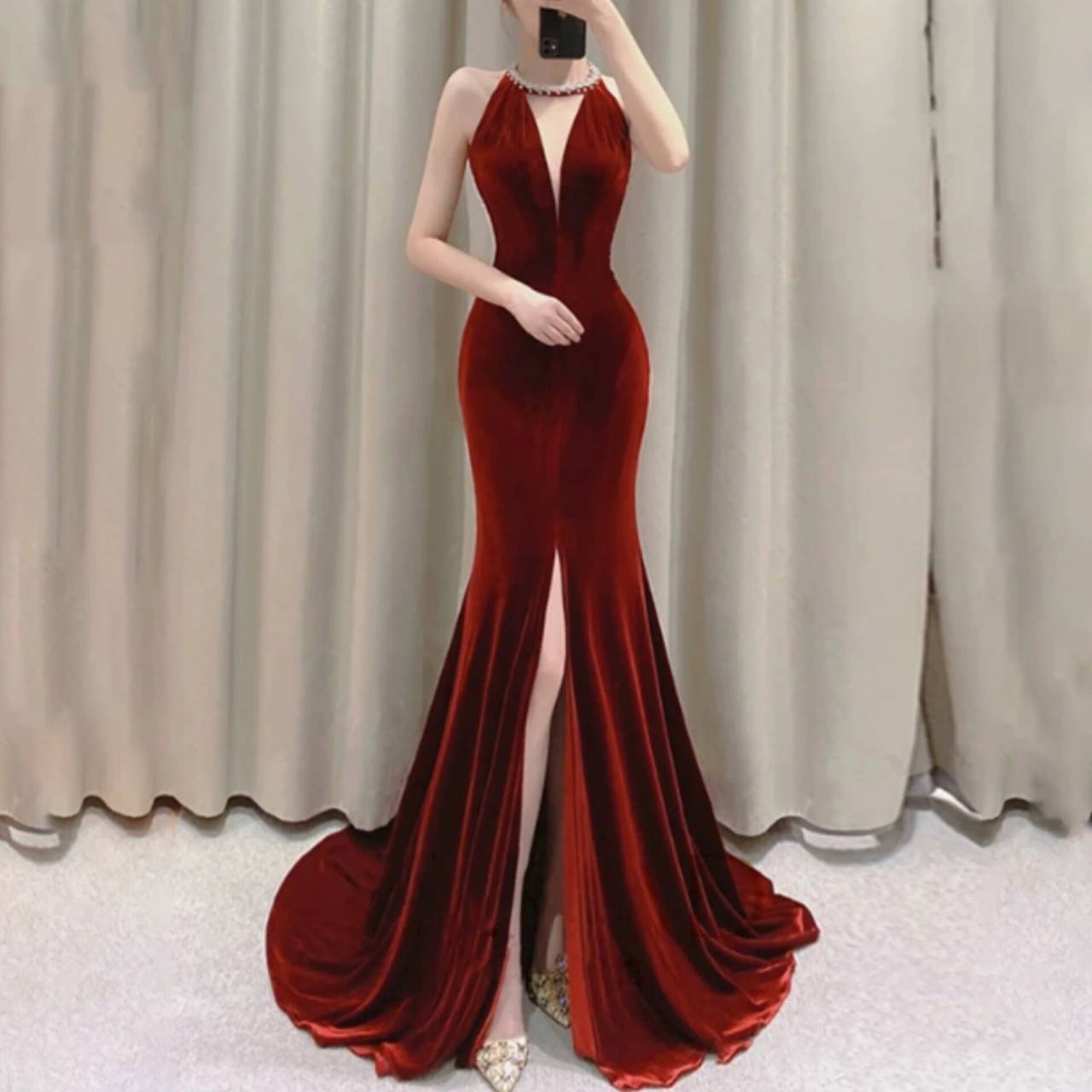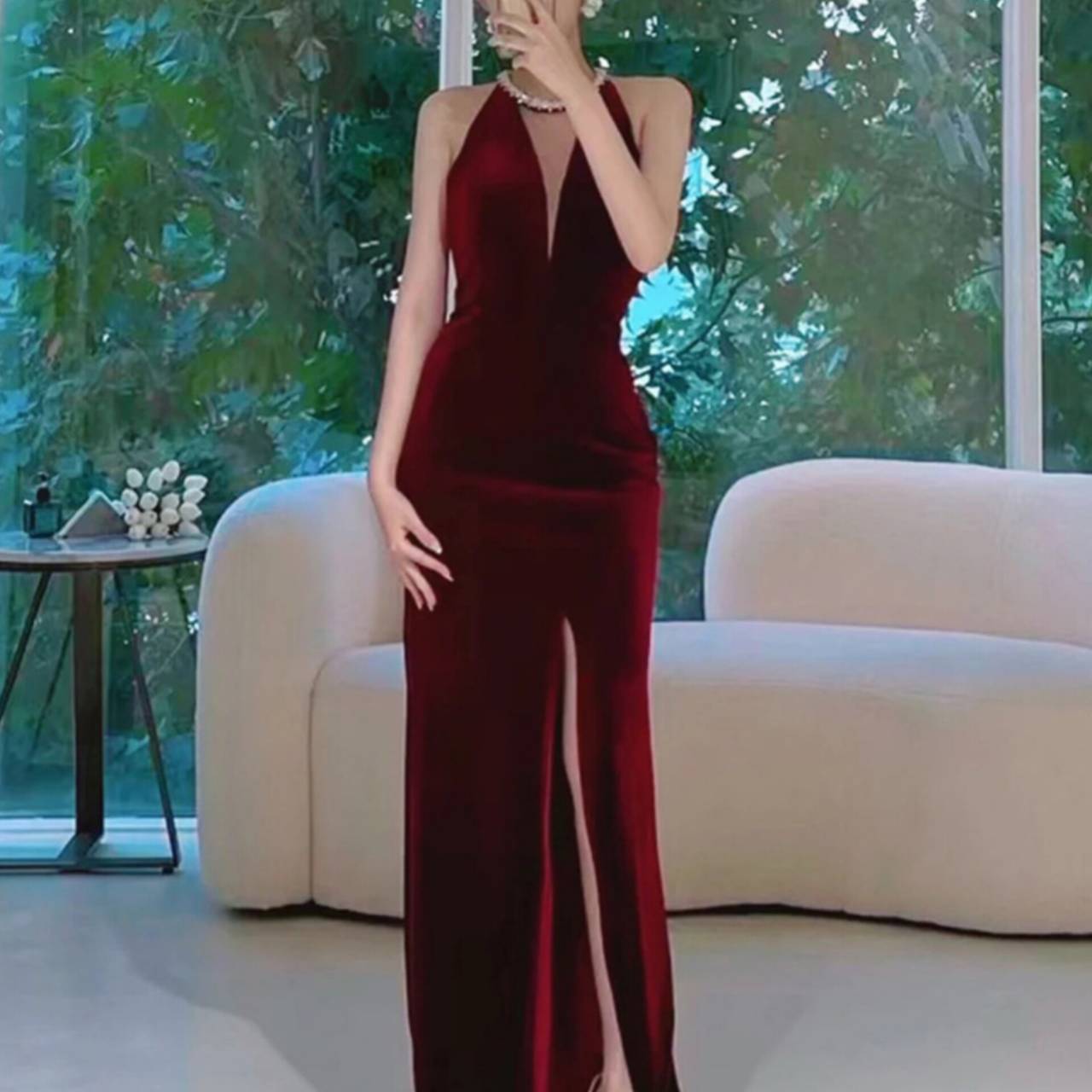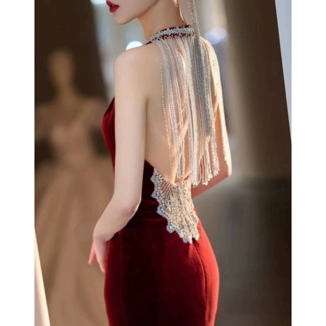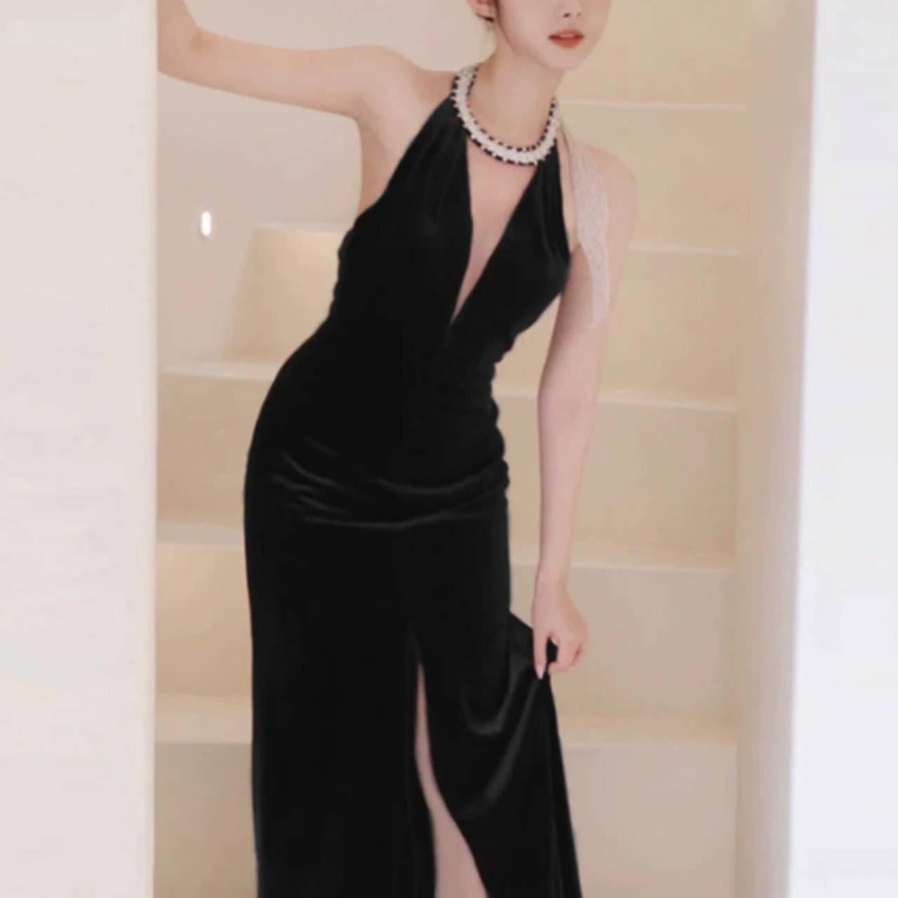 光を受けるたびに表情を変える深みのあるベルベットドレスが、肌を美しく引き立て、圧倒的な高級感を演出します。