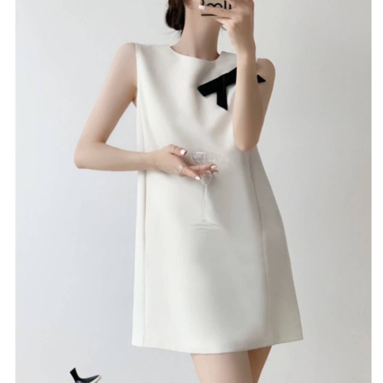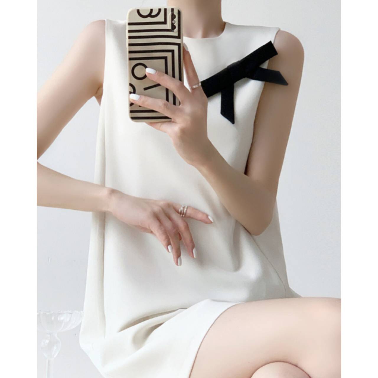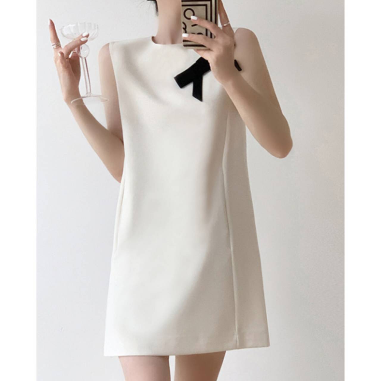 ノースリーブ ドレス ワンピース 韓国ドレス クルーネック 胸元リボン リボン バイカラー ミニ丈 ショート丈 スリム 体型カバー モノトーン バイカラー S/L 韓国【K11007】