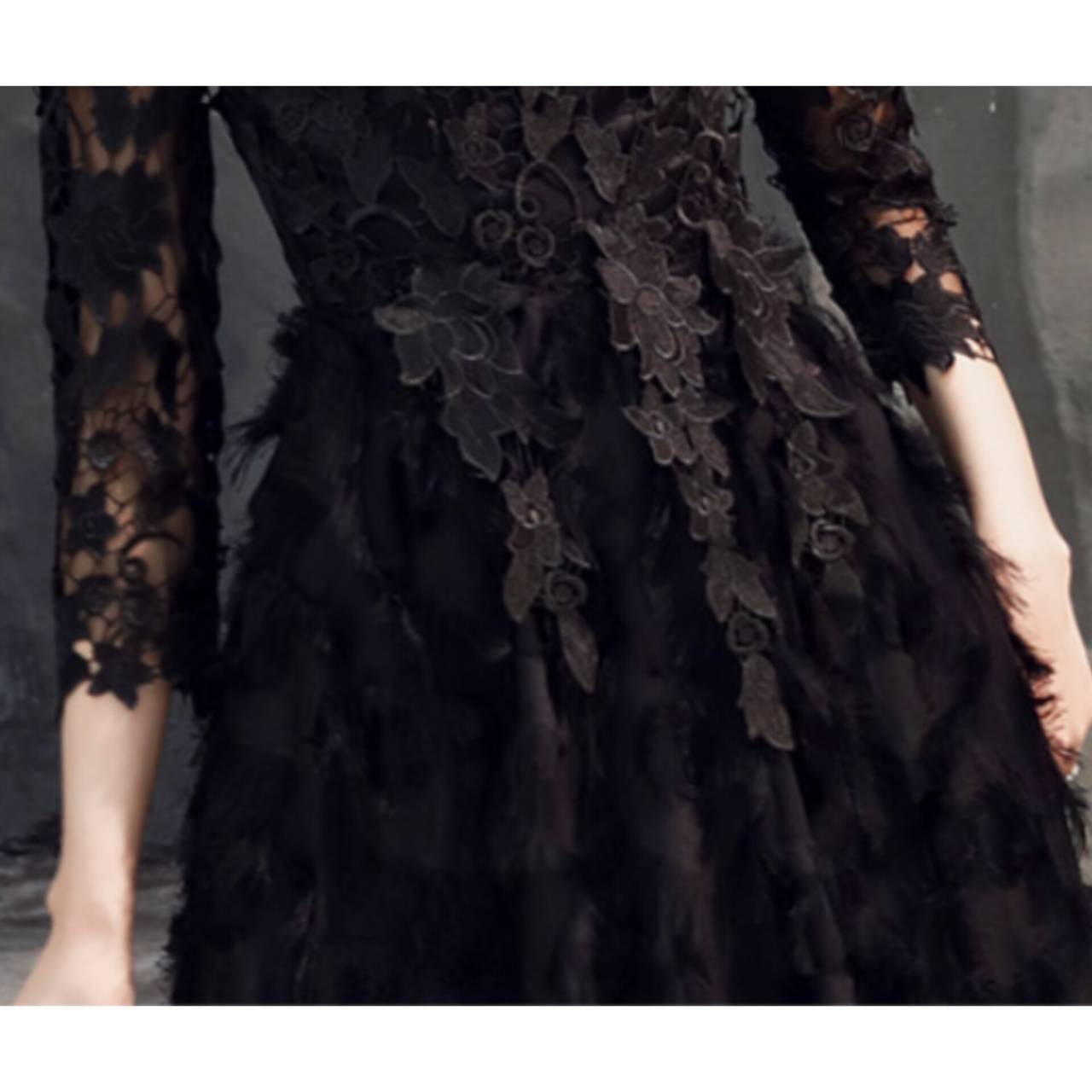 全4色 ドレス イブニングドレス 韓国ドレス レース 7分袖 クルーネック シアー ハイウエスト Aライン フレア フェザー ふわふわ ロング 体型カバー エレガント XS/2XL 韓国【B3717】