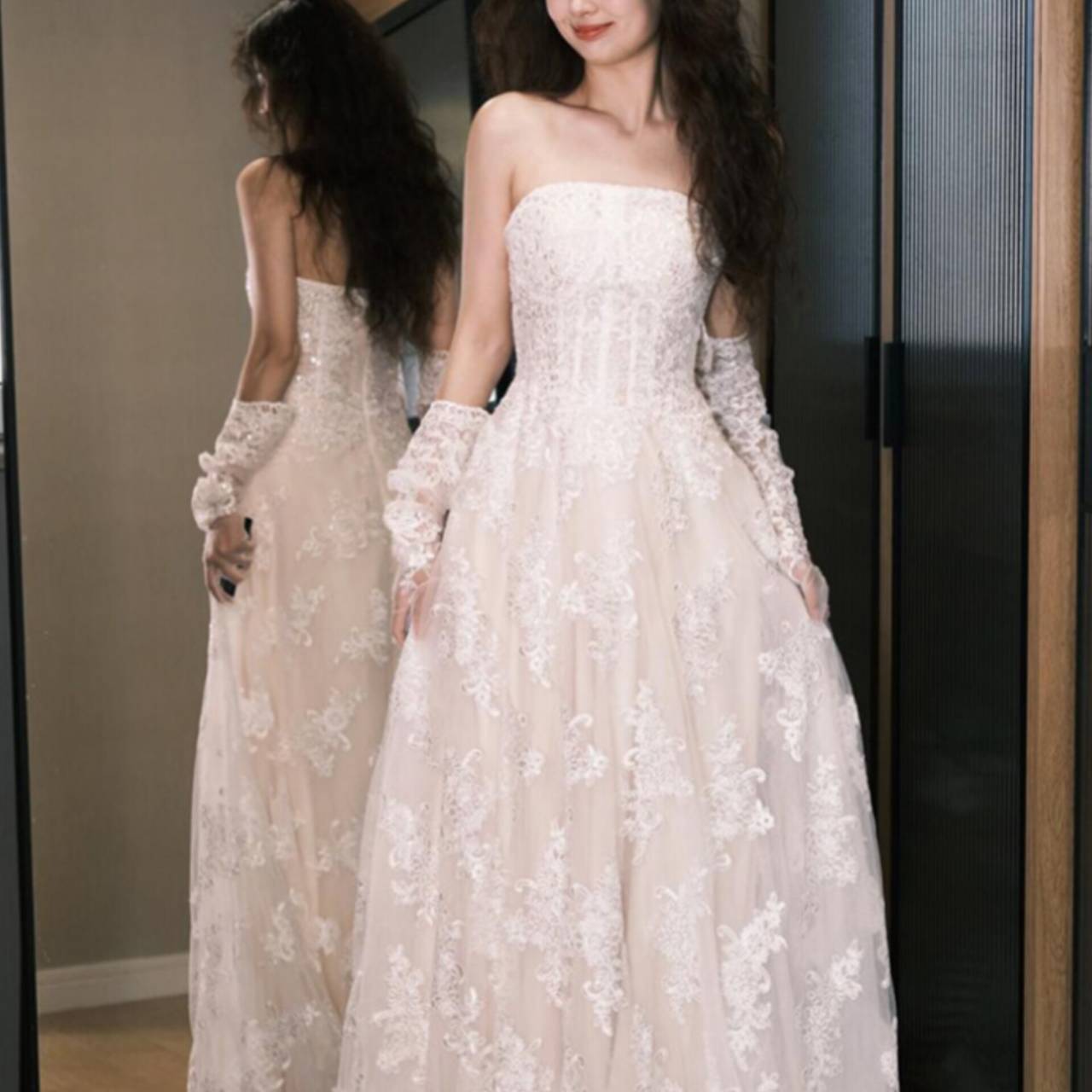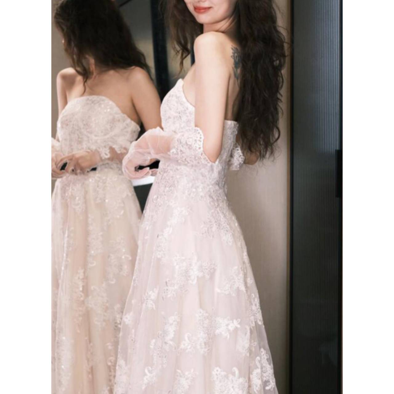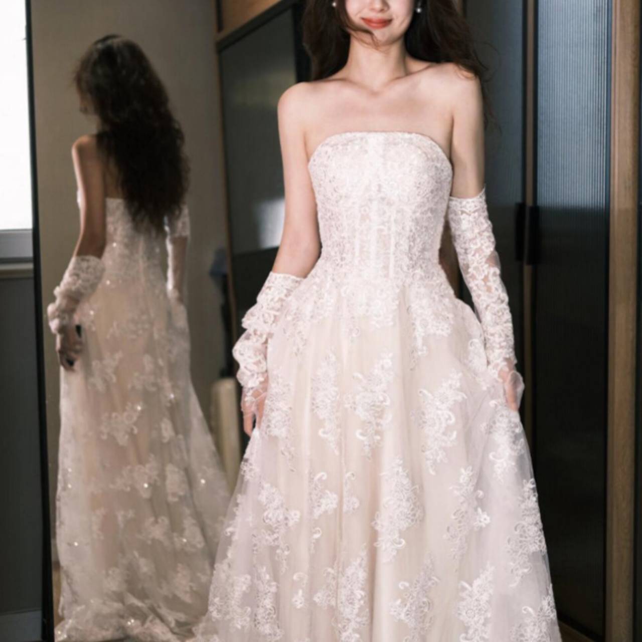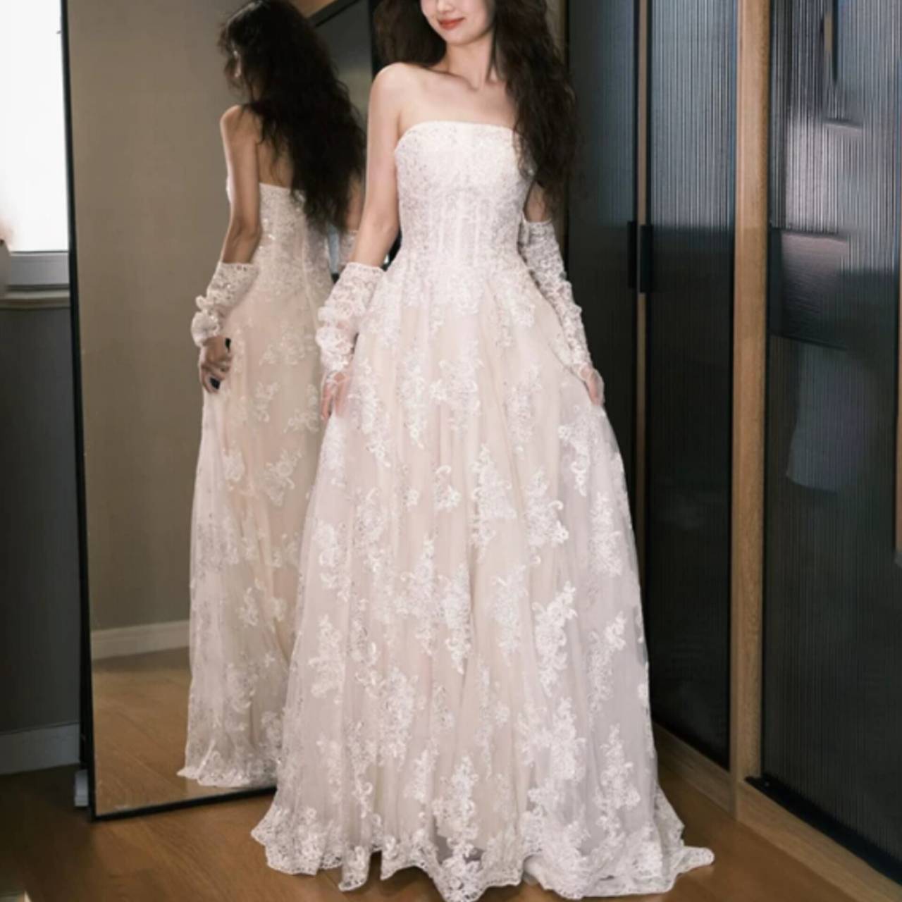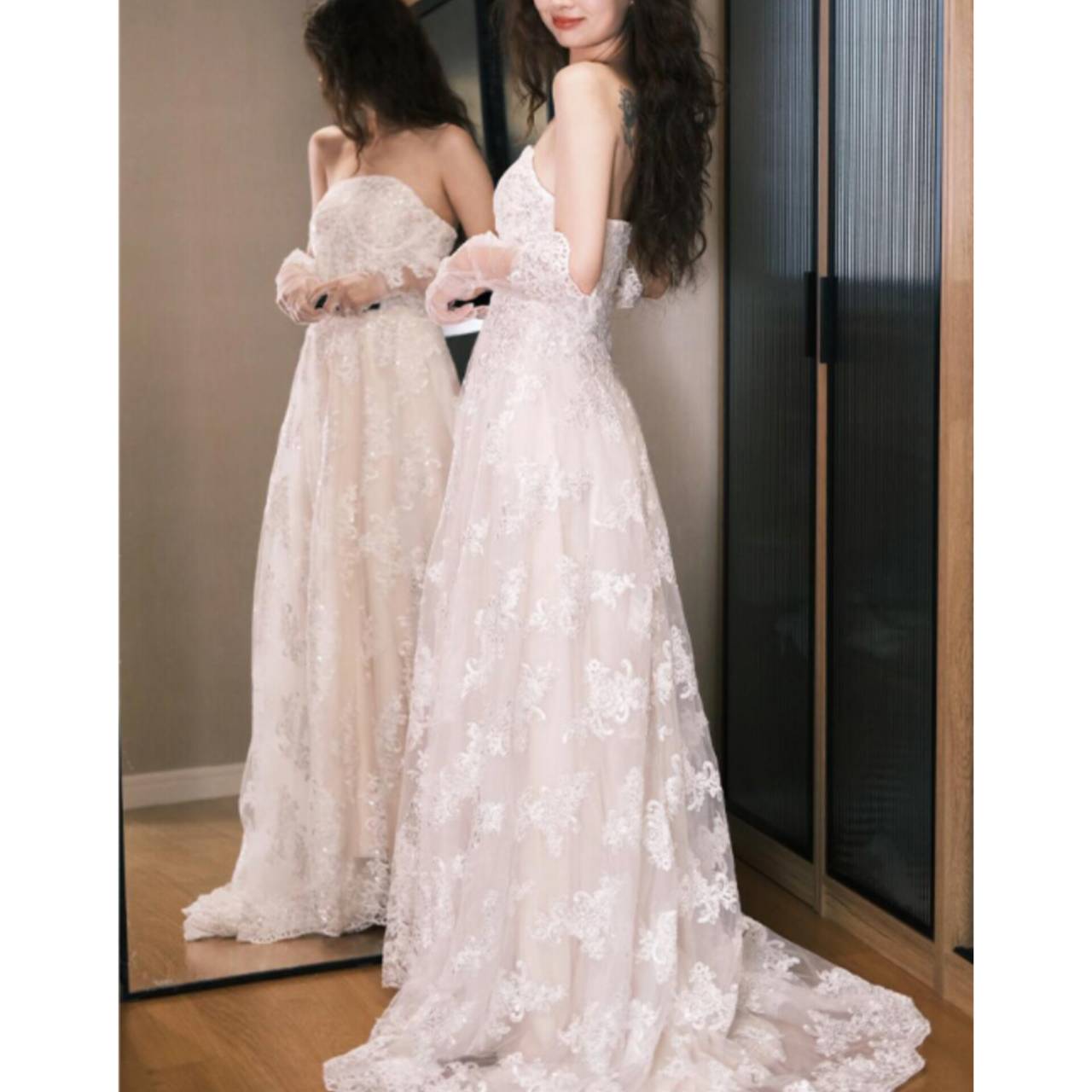 “私が一番美しい”を叶える、繊細レースのストラップレスウェディングドレス。上質な繊細レース×チュール素材を贅沢に重ねた、インポートならではの存在感あふれるウェディングドレス。