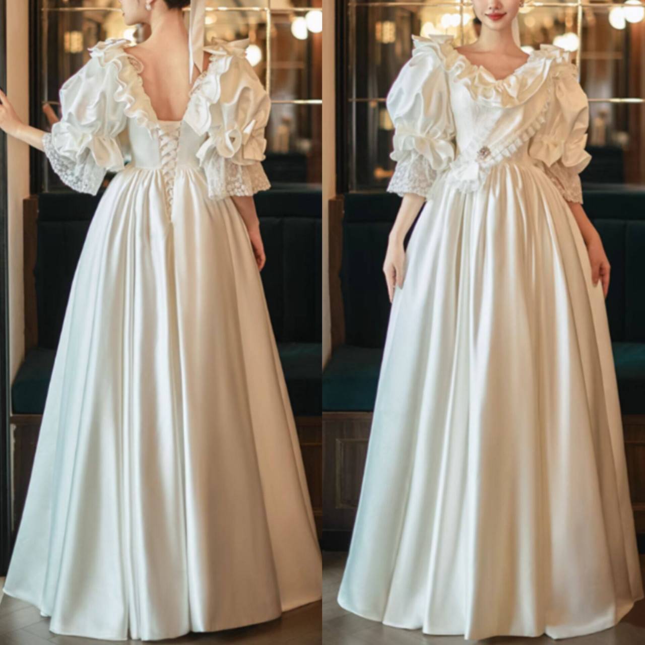 身頃には上質なマットサテン×繊細レース素材を使用し、光を柔らかく受け止めることで、写真でも実物でも美しい陰影を演出します。胸元はデコルテを綺麗に見せるラッフルフリルデザイン。