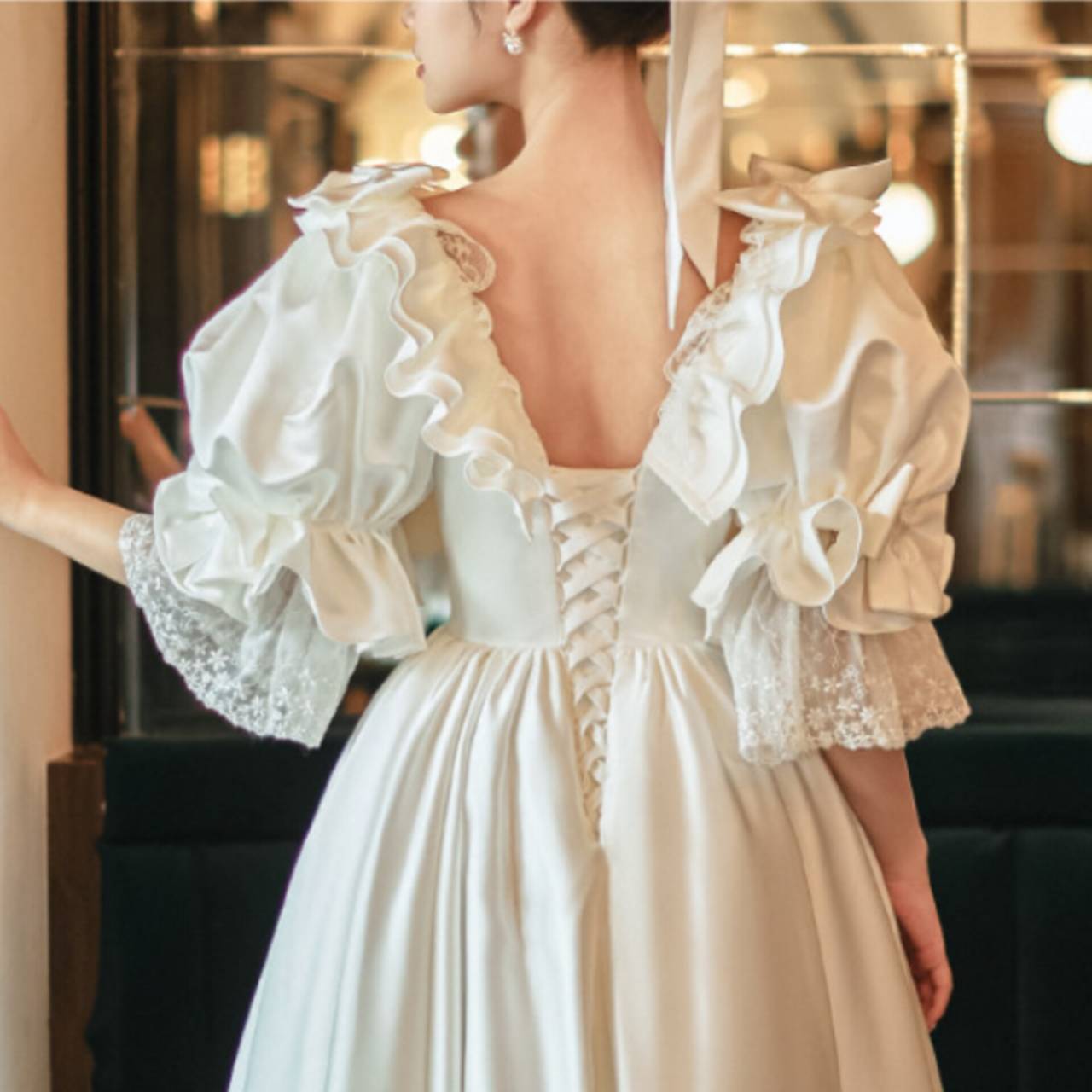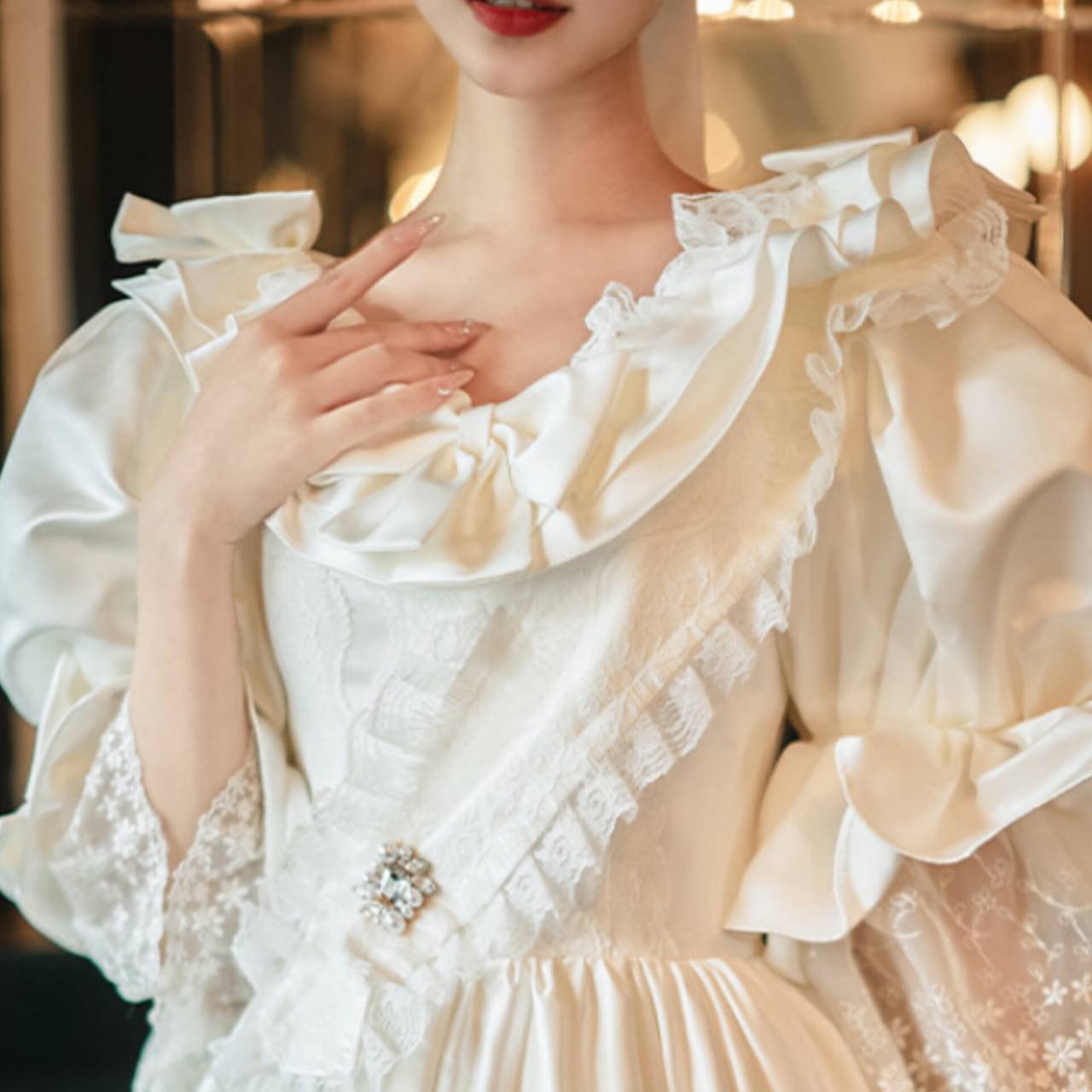 一目で“特別”が伝わる、クラシカルロマンティックドレス。繊細なフリルと立体感のあるパフスリーブが印象的な、クラシカルムード漂うインポートウェディングドレス。
