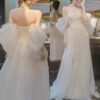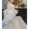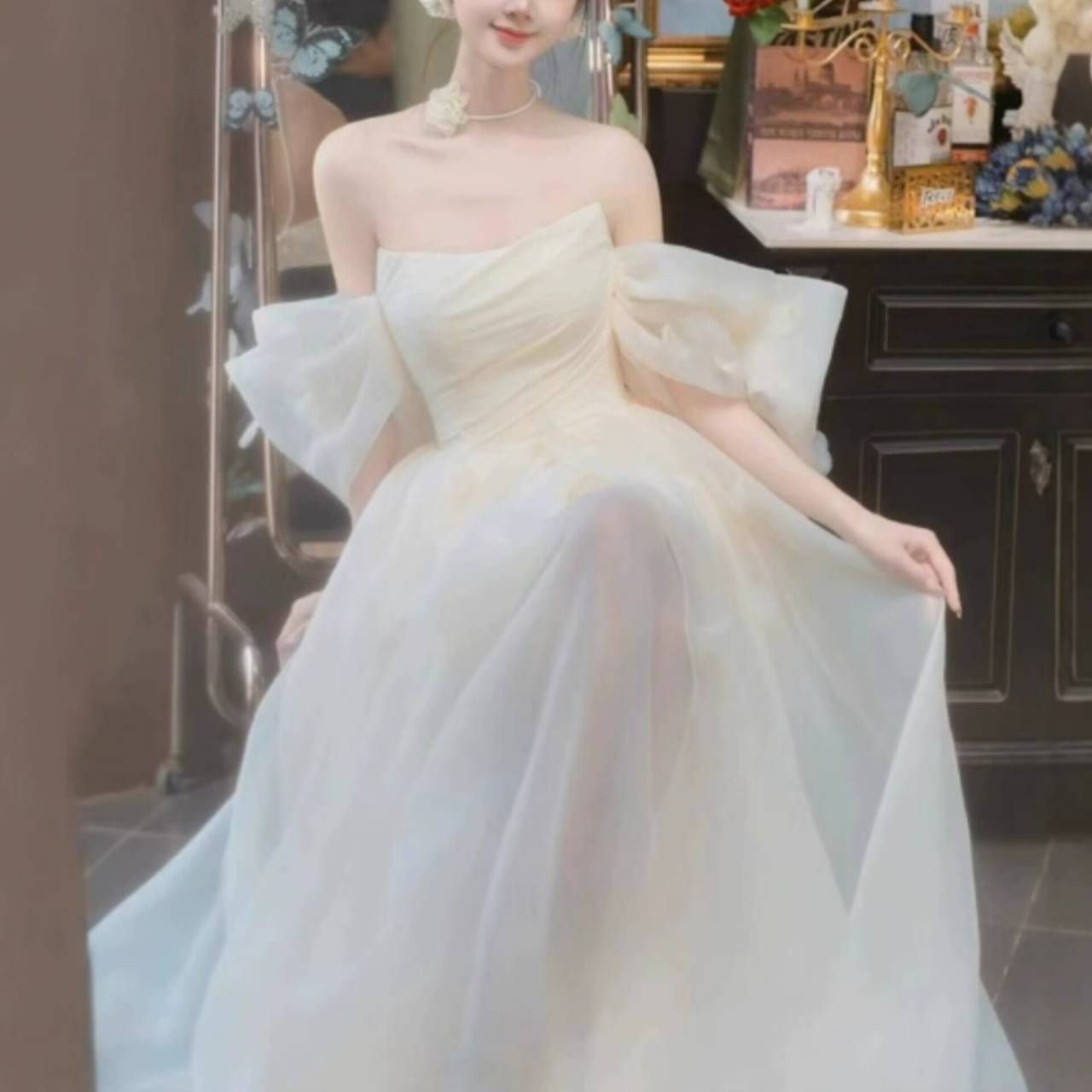 オフショルダー ウェディングドレス 韓国ドレス シアースリーブ 3Dフラワー 立体花 ボリューム袖 ハイウエスト Aライン ロング オーガンジー チュール XS/2XL 韓国【K15250】