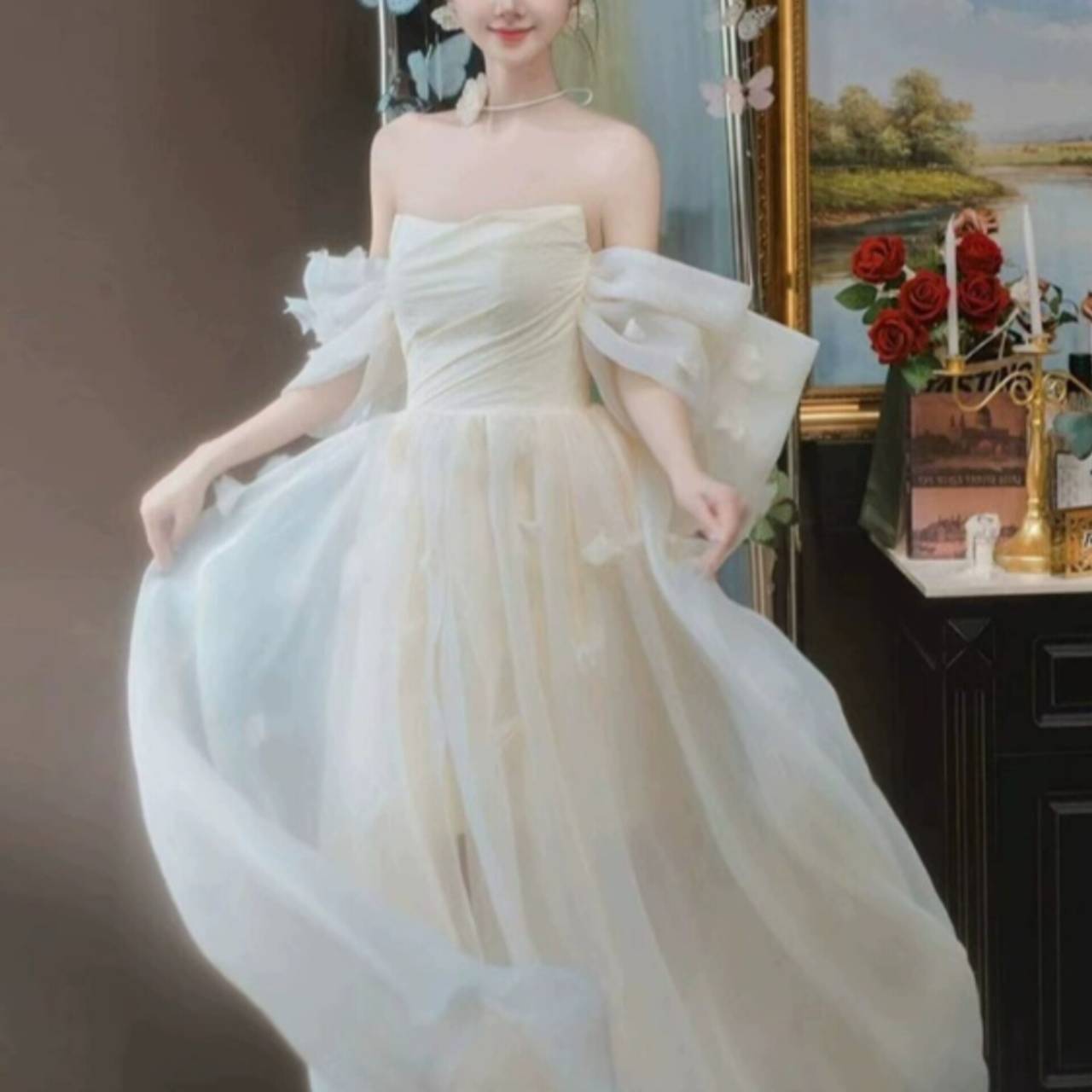 まるで花びらを纏ったような柔らかなチュールが揺れ動く、ロマンティックなホワイトドレス。軽やかで透明感のあるオーガンジー素材を贅沢に使用し、ふんわり広がるシルエットは気になる二の腕やウエストラインを美しくカバーしつつ、スタイルアップ効果も抜群です。歩くたびに空気を含んで広がる裾は、脚をより長く見せてくれる計算されたデザイン。XS〜2XLまでの幅広いサイズ展開で、自分にぴったりの一着が見つかります。