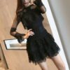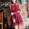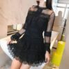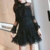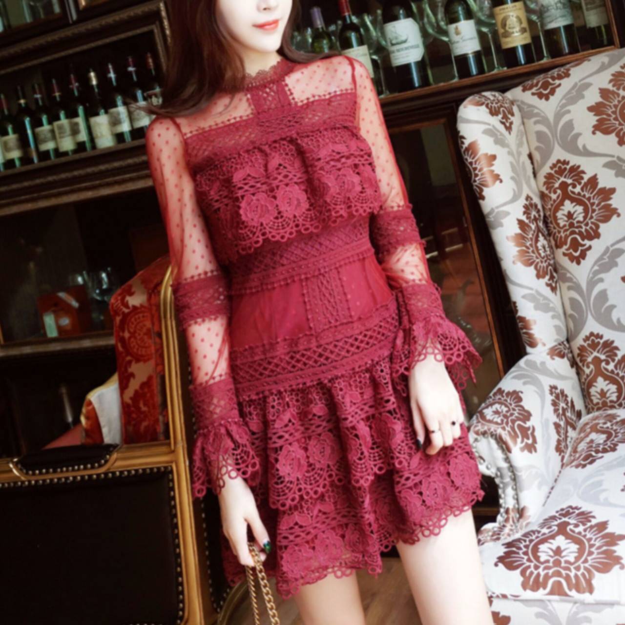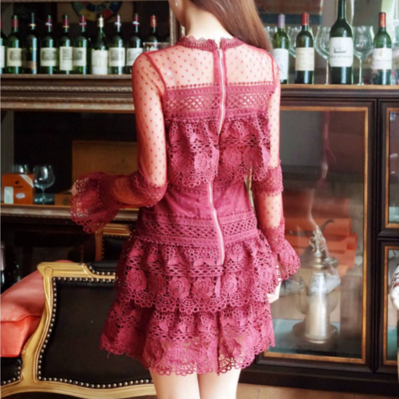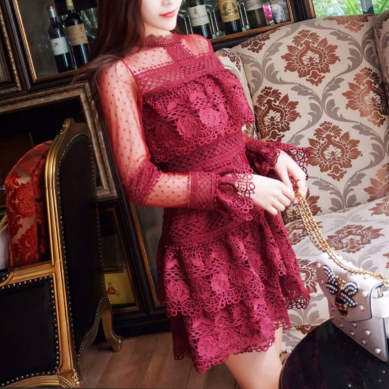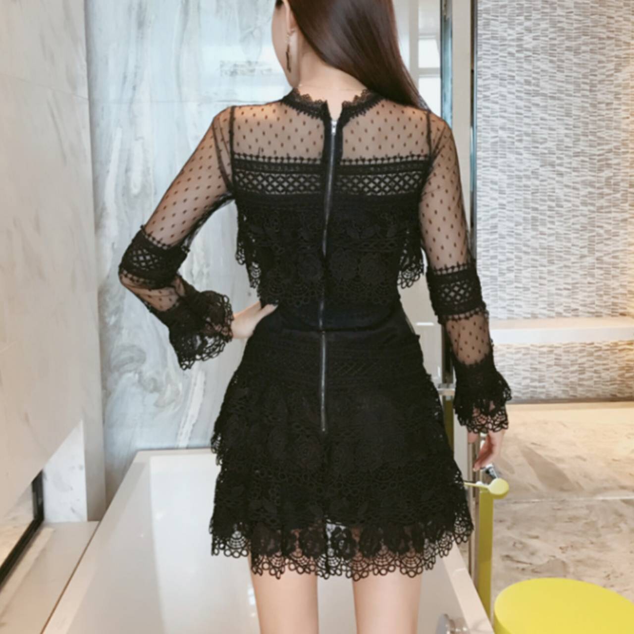 全2色 ドレス 韓国ドレス 長袖 シアー 総レース パンチングレース ドット 水玉 フリル ハイウエスト ティアード ミニ丈 ショート丈 フレア Aライン お花 フェミニン S/L 韓国【K10419】