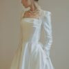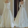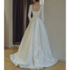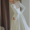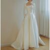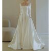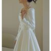 長袖 ウェディングドレス 韓国ドレス スクエアネック パワーショルダー パワショル バックリボン バックシャン ハイウエスト Aライン フレア ロング サテン クラシック XS/XL 韓国【K15593】