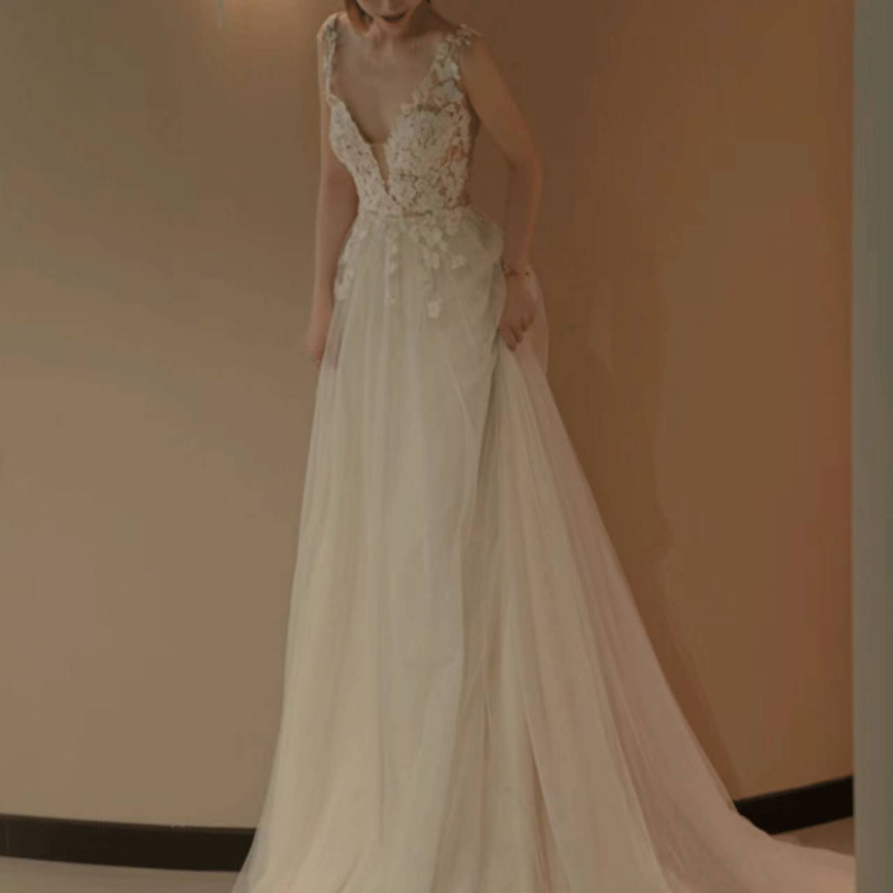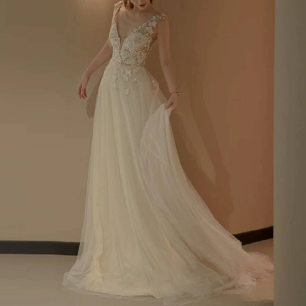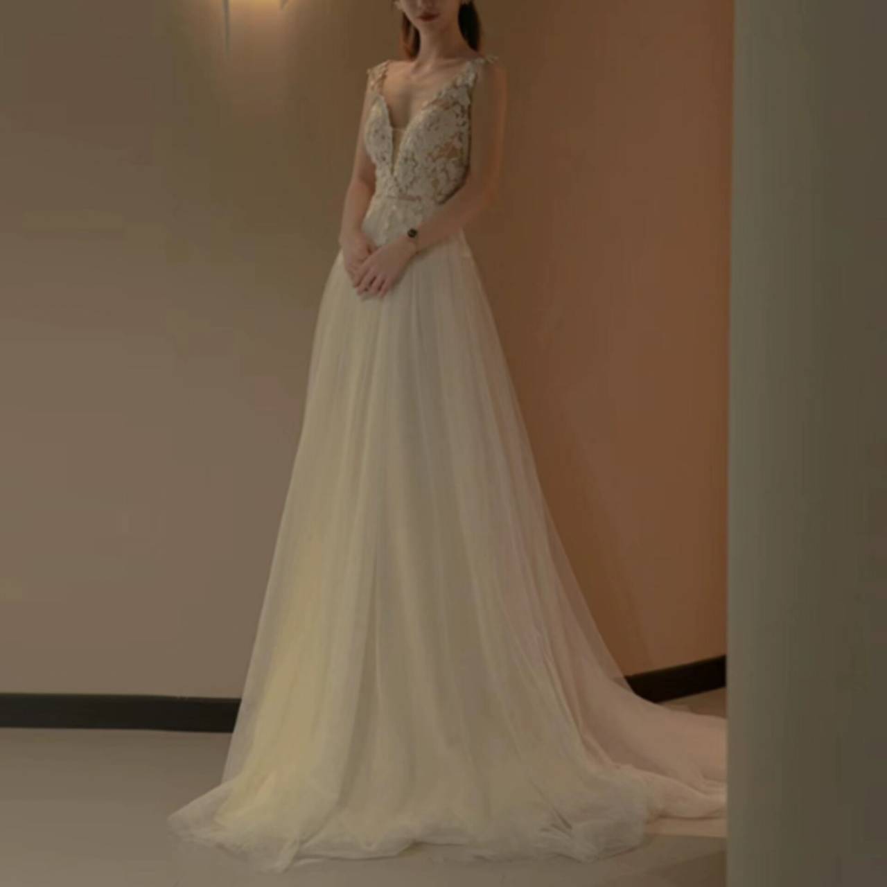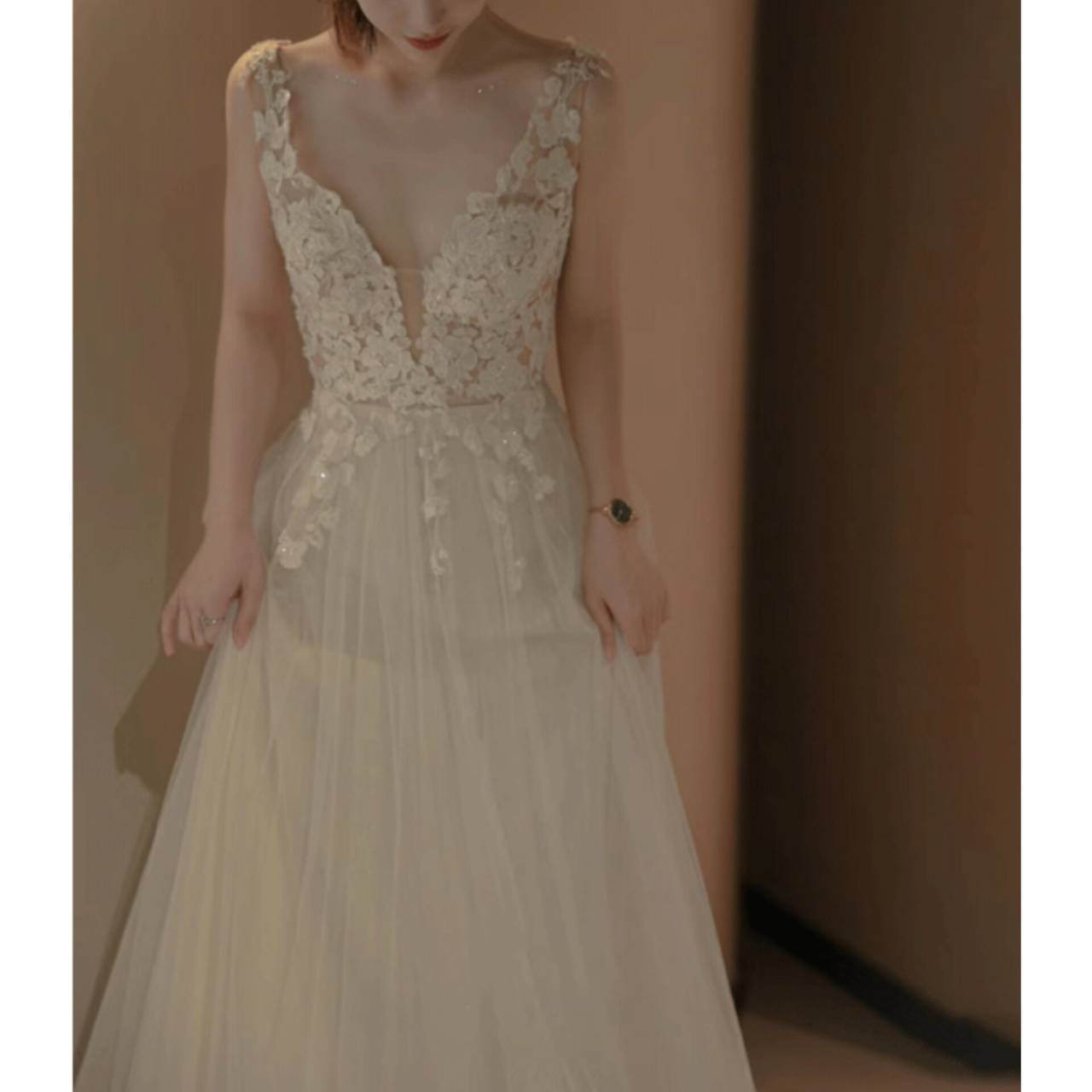 ノースリーブ ウェディングドレス 韓国ドレス お花 刺繍 レース 花柄 深Vネック ハイウエスト バックレス くるみボタン Aライン チュール ロング シアー フェアリー エレガント XS/XL 韓国【K15747】
