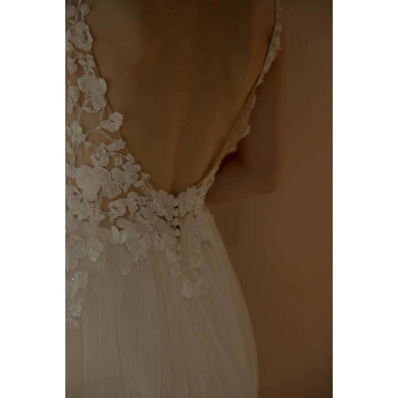 透け感レース×柔光チュールが叶える、儚く美しいウェディングドレス。繊細な立体フラワーレースを贅沢にあしらったトップスは、肌に溶け込むようなシアーデザインで上半身を華奢に魅せるシルエット。