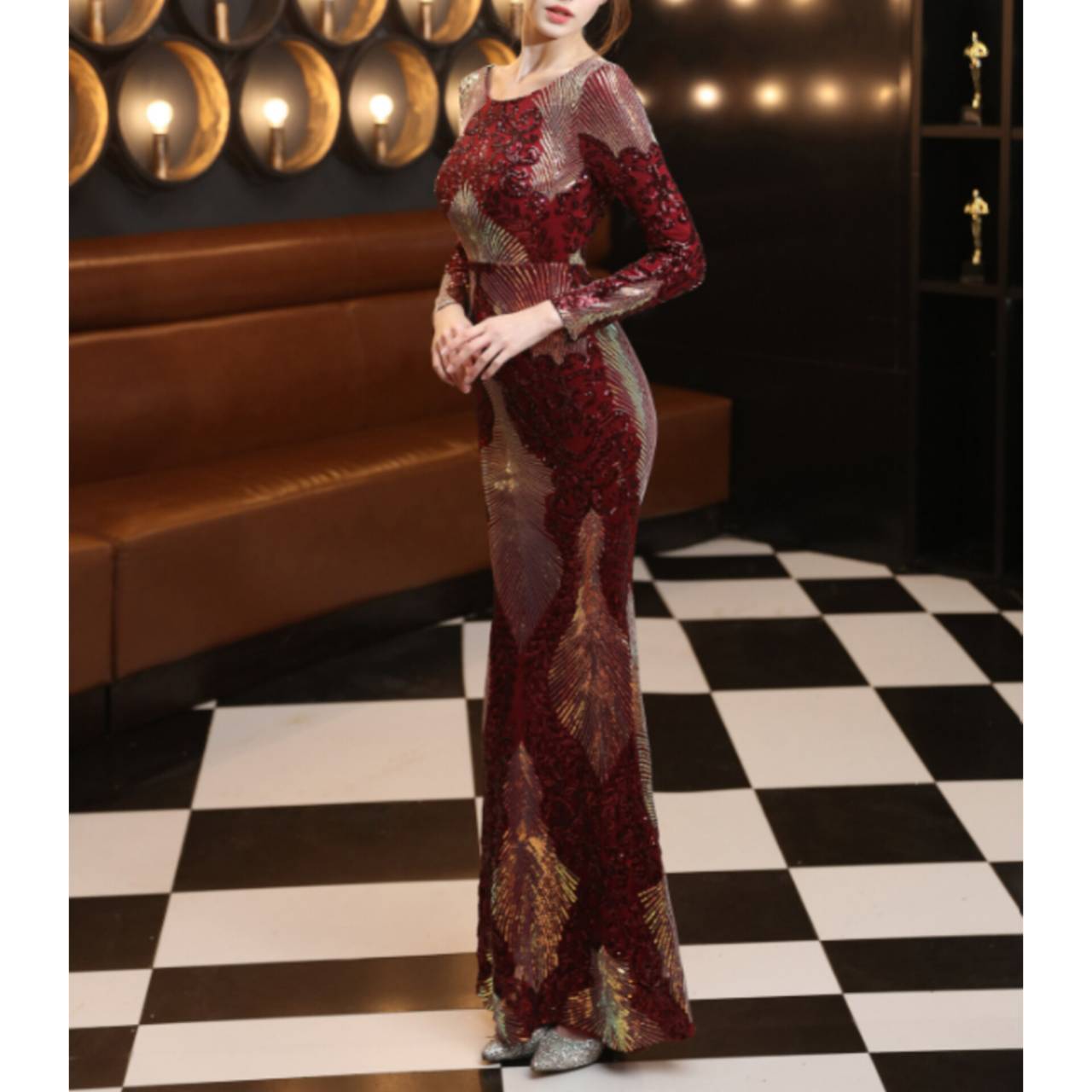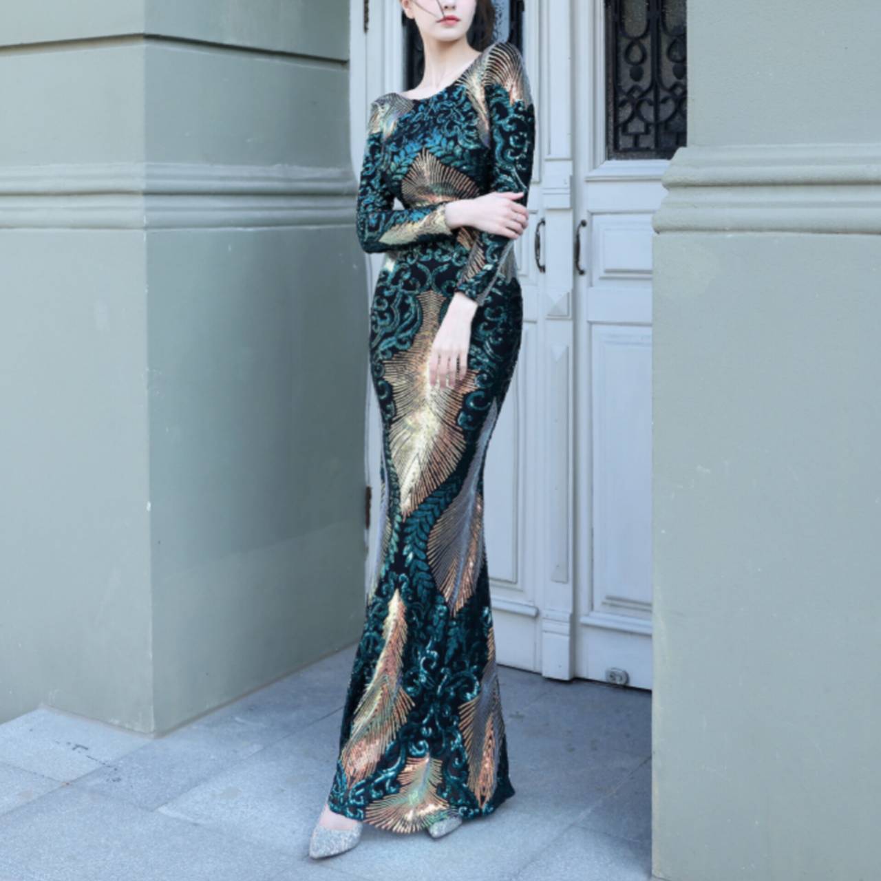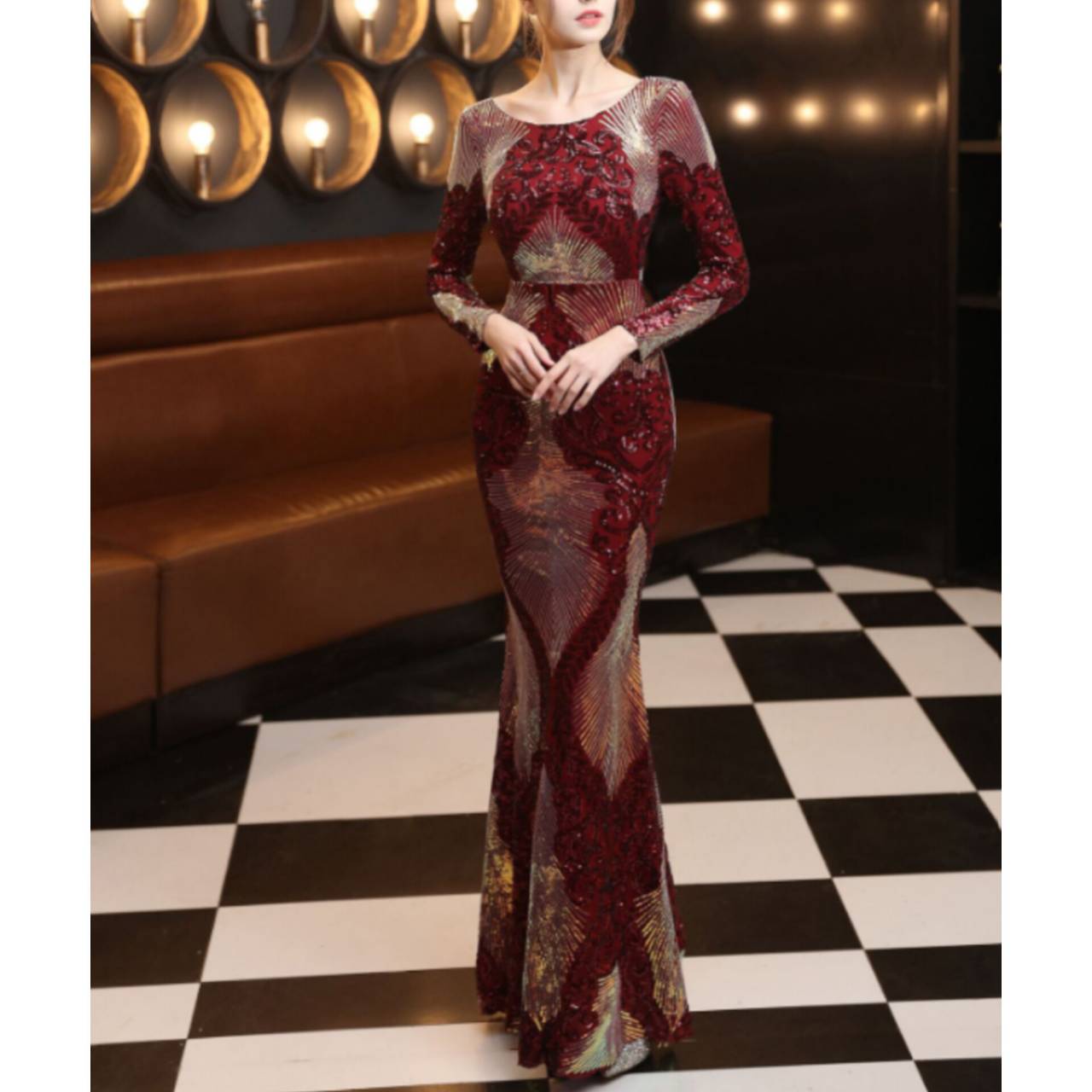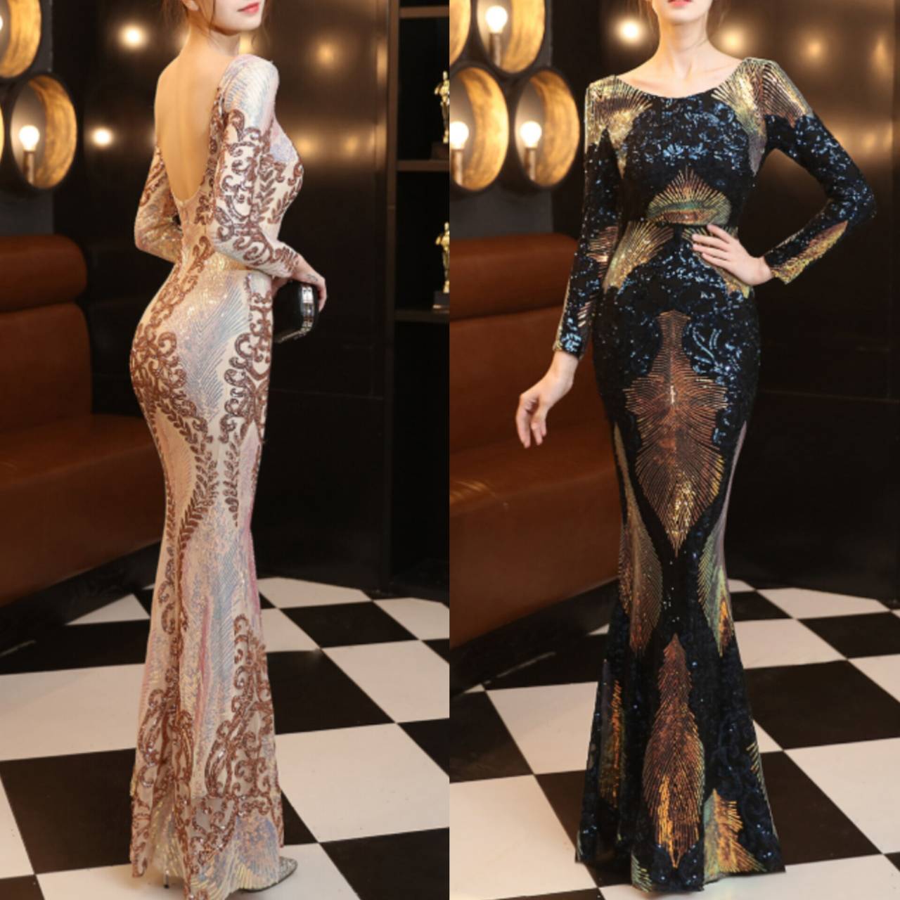 全6色 ドレス イブニングドレス 韓国ドレス キラキラ クルーネック 長袖 スパンコール ハイウエスト エンボス柄 バックレス マーメイド ロング 総柄 グリッター 美シルエット スタイルアップ ゴージャス リュクス エレガント S/2XL 韓国【B8662】