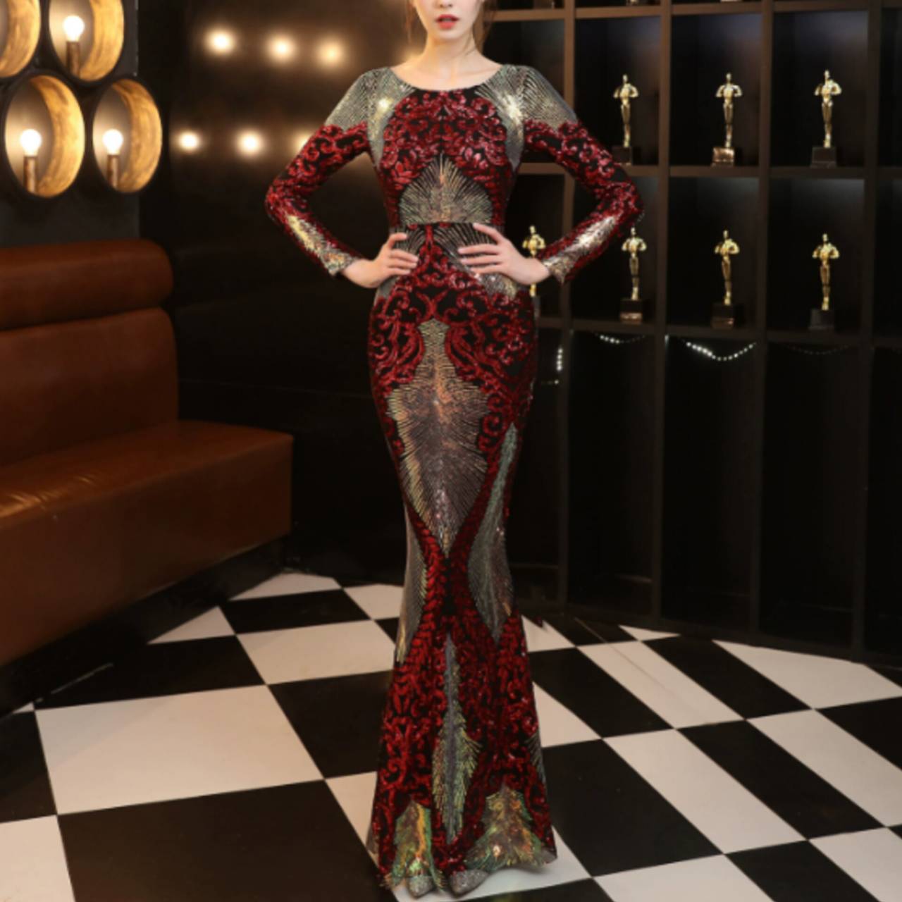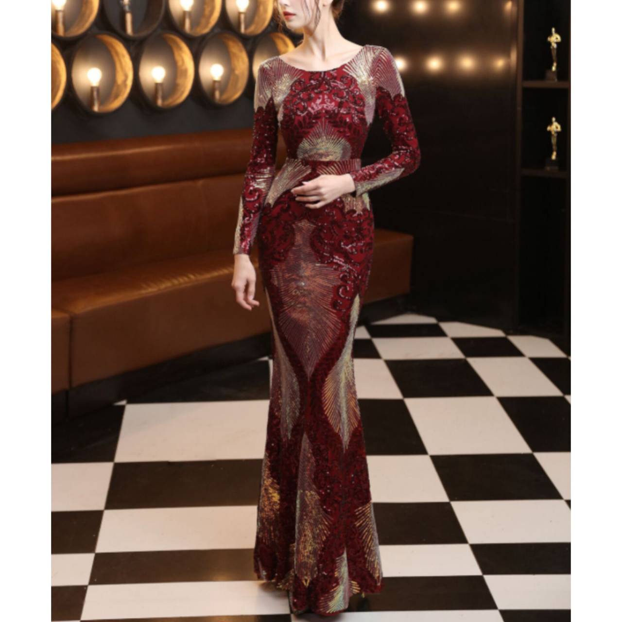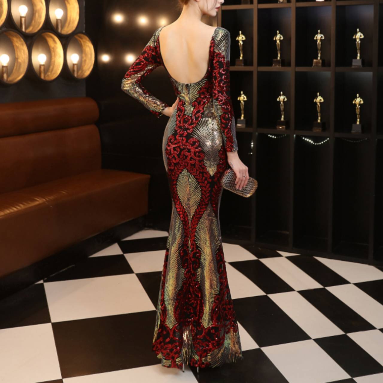 全6色 ドレス イブニングドレス 韓国ドレス キラキラ クルーネック 長袖 スパンコール ハイウエスト エンボス柄 バックレス マーメイド ロング 総柄 グリッター 美シルエット スタイルアップ ゴージャス リュクス エレガント S/2XL 韓国【B8662】