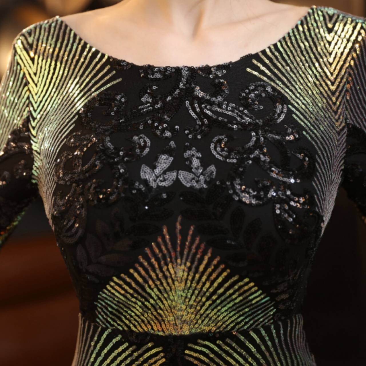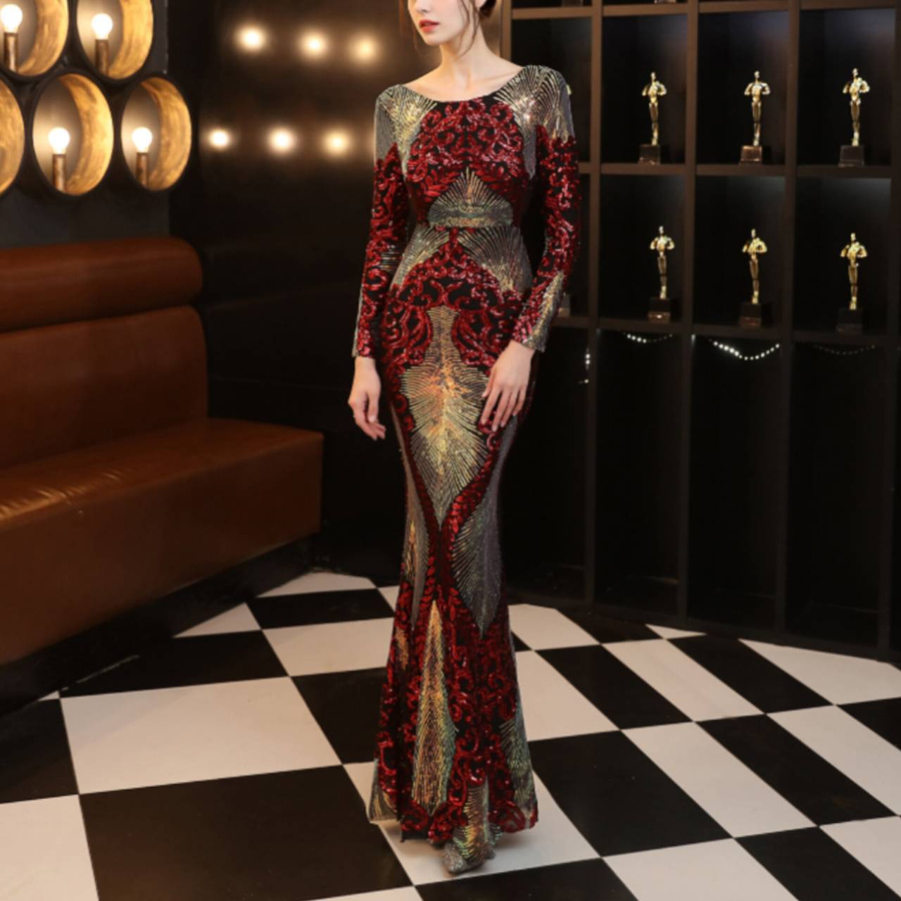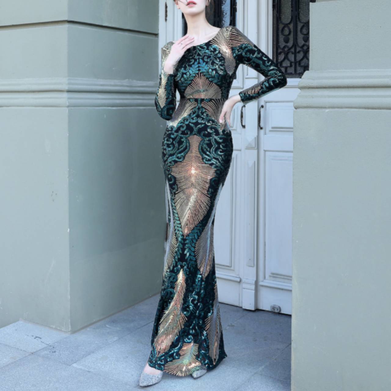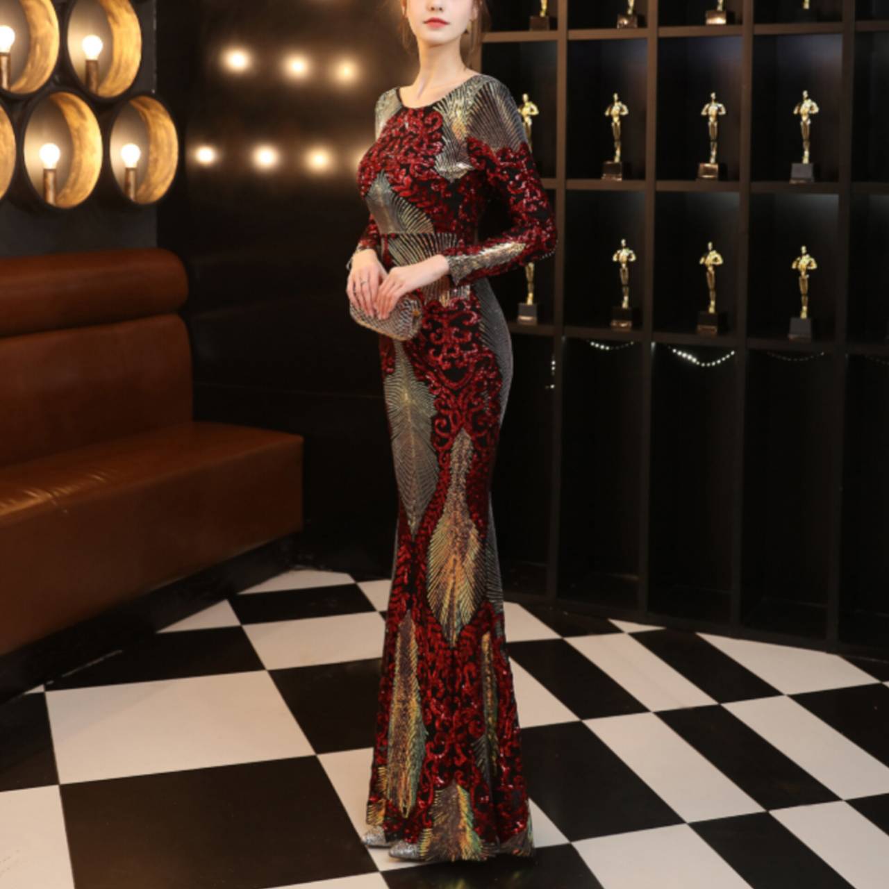 全6色 ドレス イブニングドレス 韓国ドレス キラキラ クルーネック 長袖 スパンコール ハイウエスト エンボス柄 バックレス マーメイド ロング 総柄 グリッター 美シルエット スタイルアップ ゴージャス リュクス エレガント S/2XL 韓国【B8662】