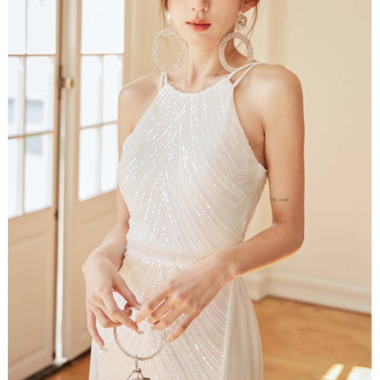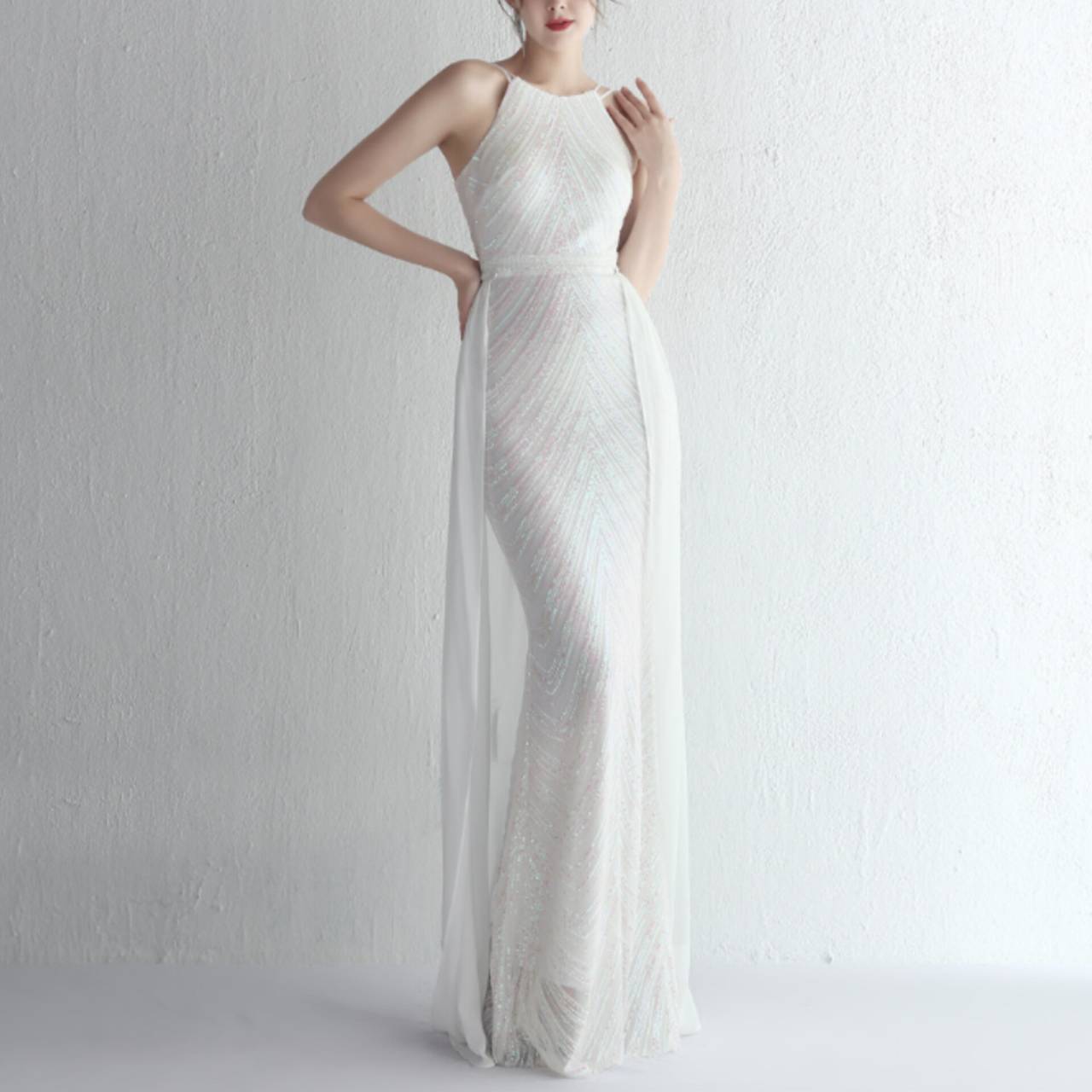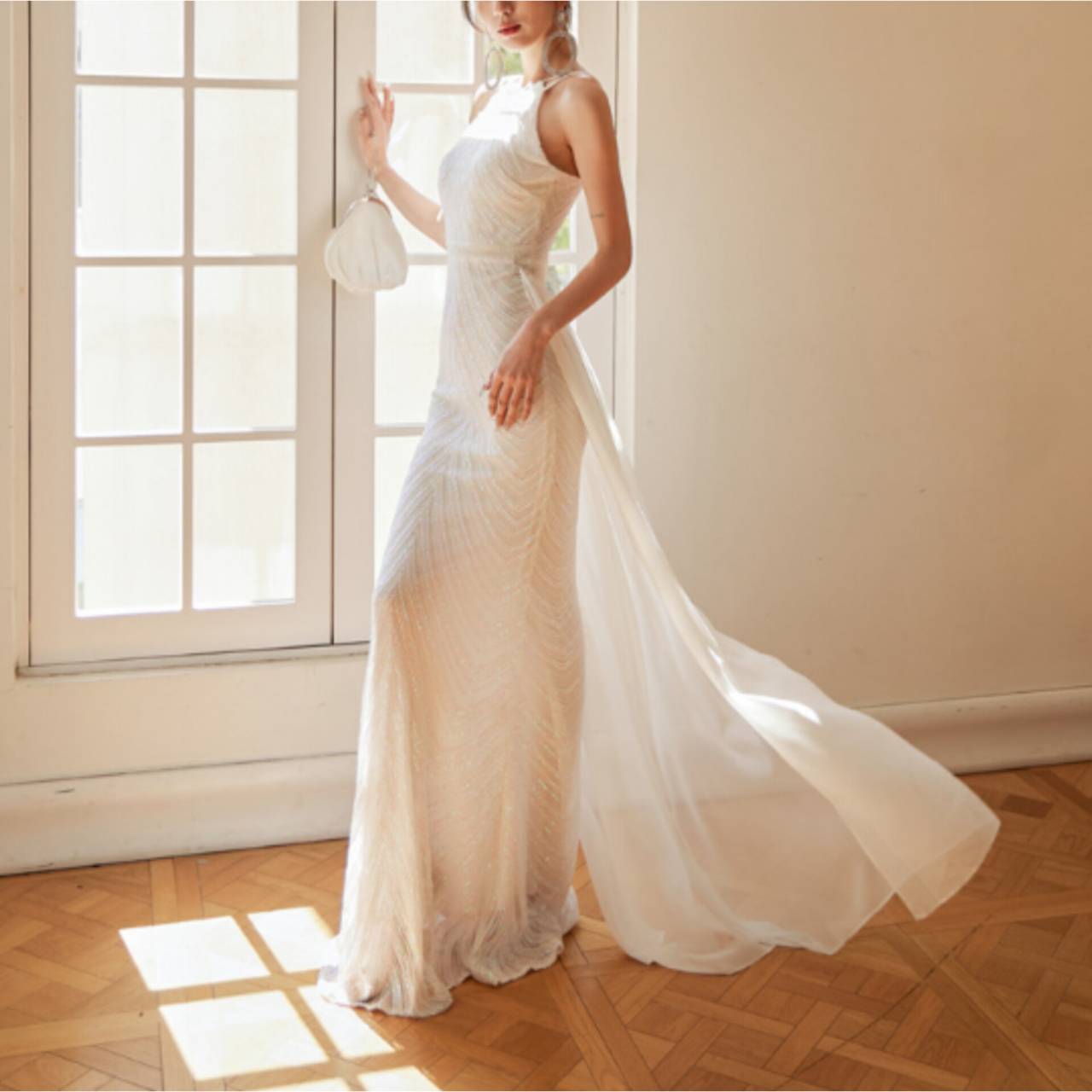 放射状に計算されたビーディングデザインが、光を受けるたびに美しく輝き、立体感と奥行きを演出します。首元は上品なホルターネックデザイン。