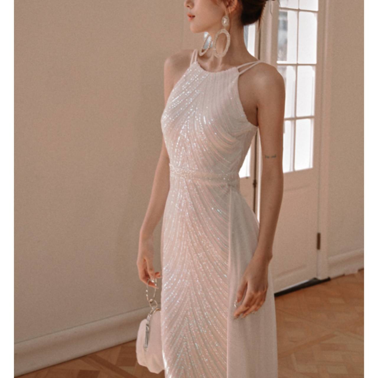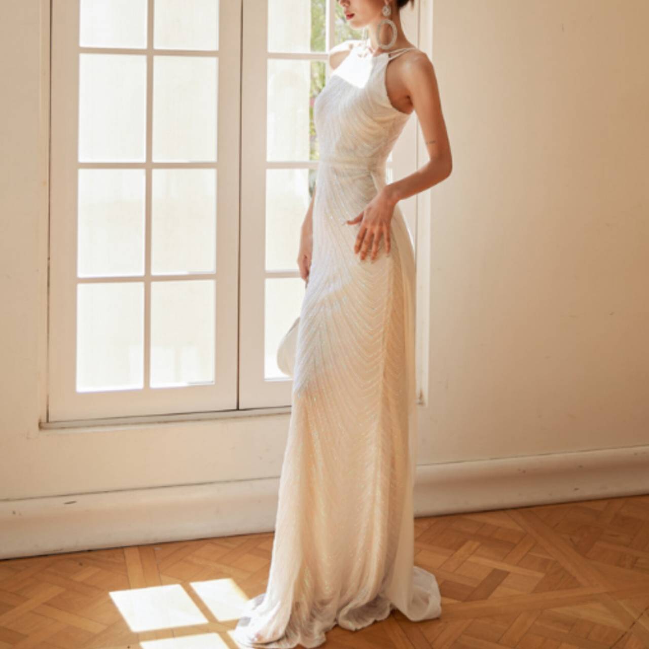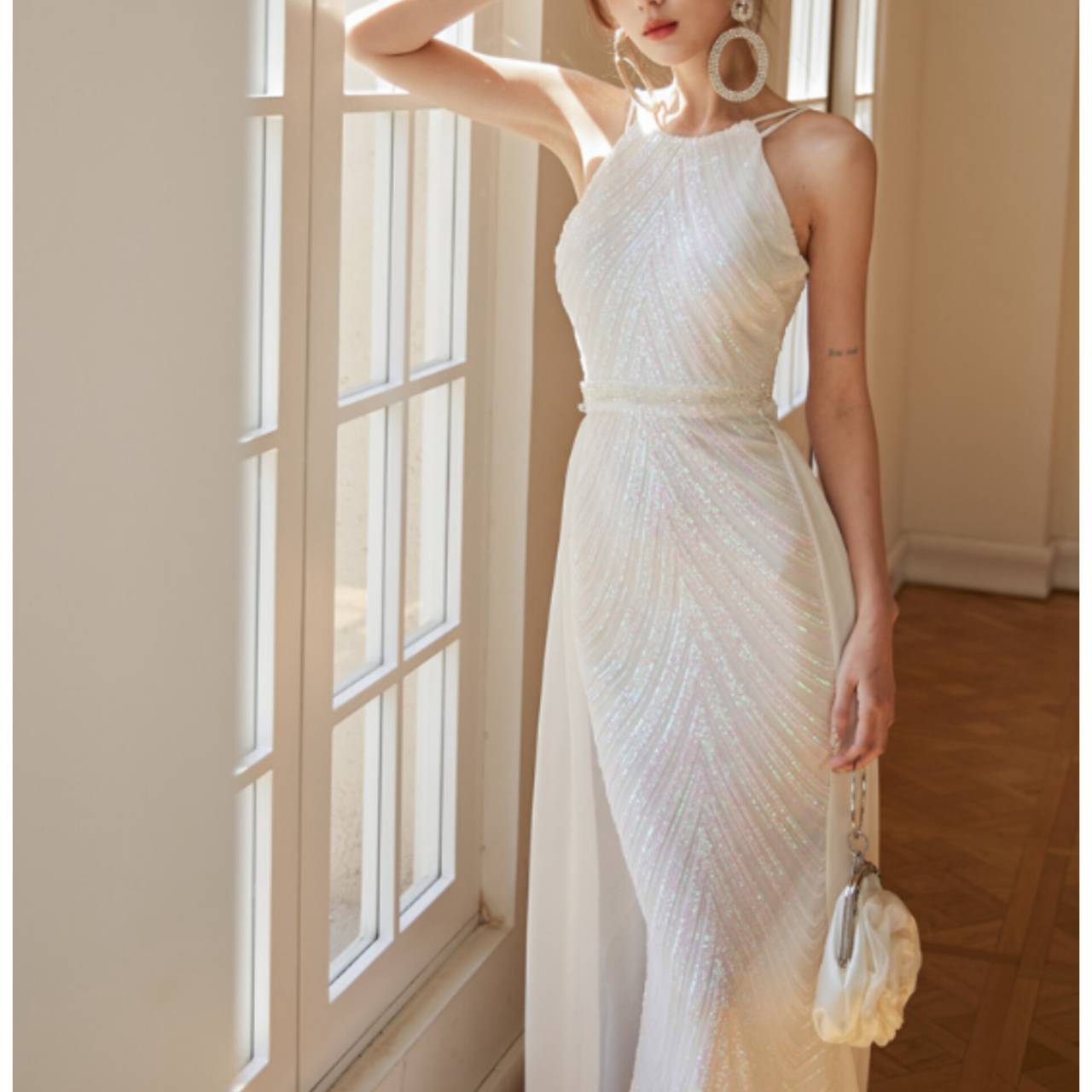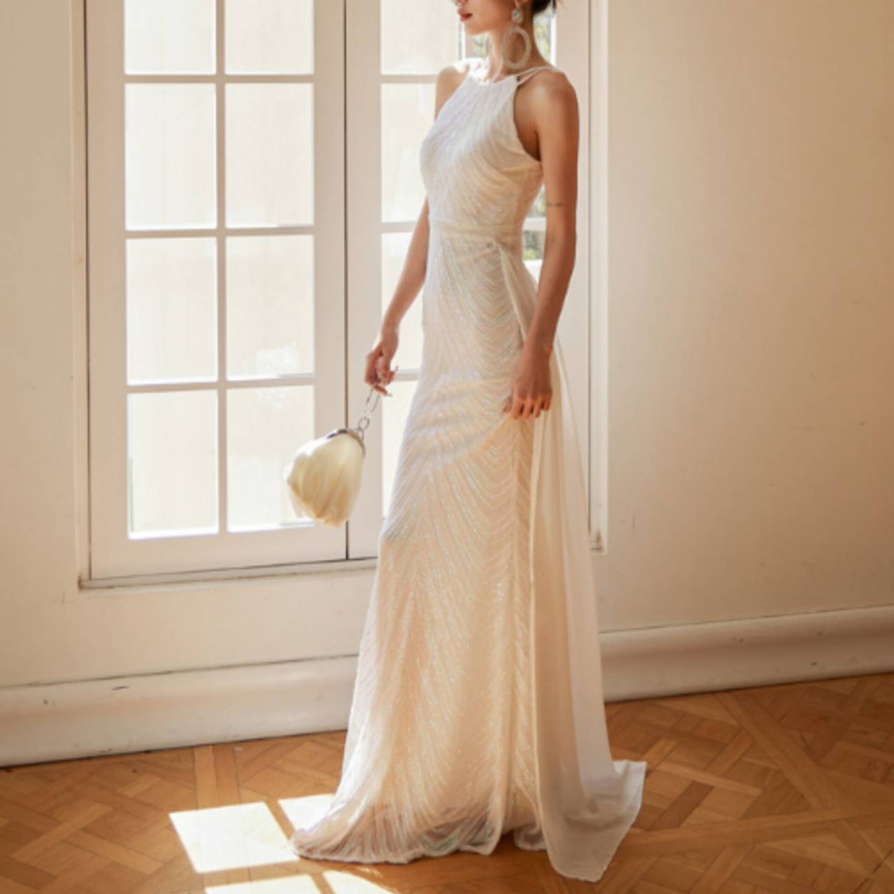 放射状に計算されたビーディングデザインが、光を受けるたびに美しく輝き、立体感と奥行きを演出します。首元は上品なホルターネックデザイン。