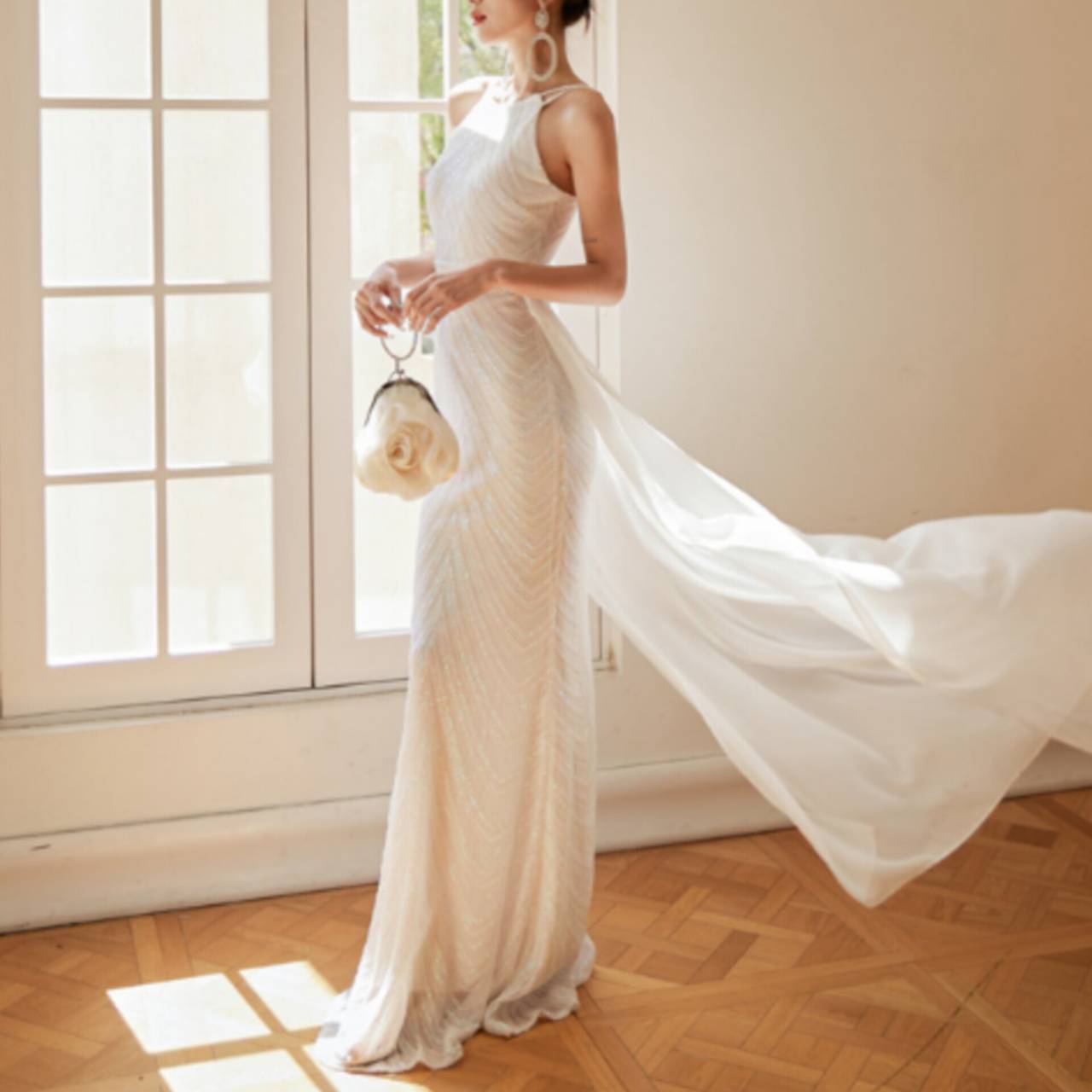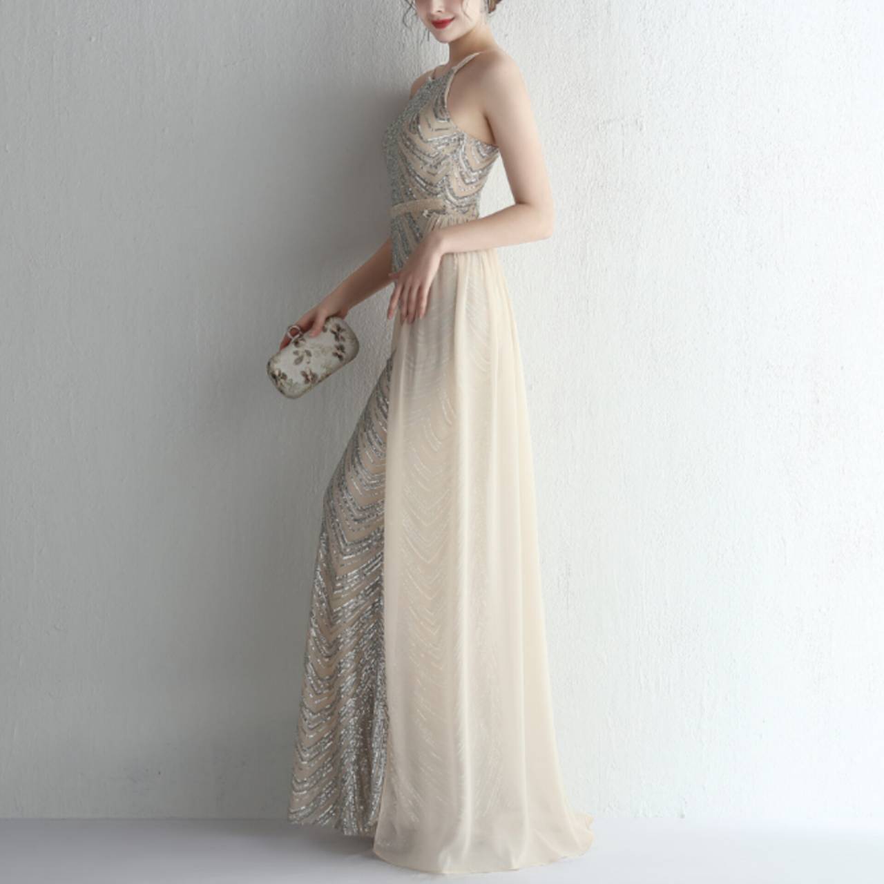 流れるような輝きで“完成された大人の美”をまとう一着。繊細にきらめく高品質ビーズ×チュール素材を贅沢に使用した、エレガントなロングドレス。