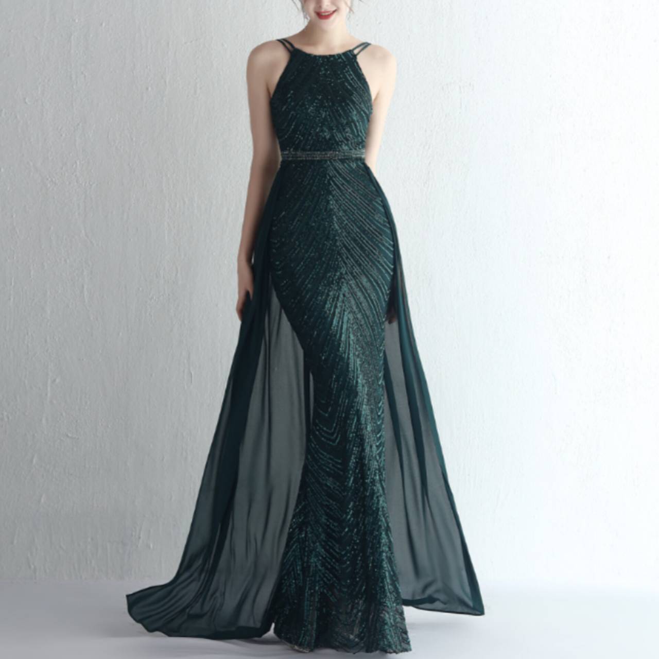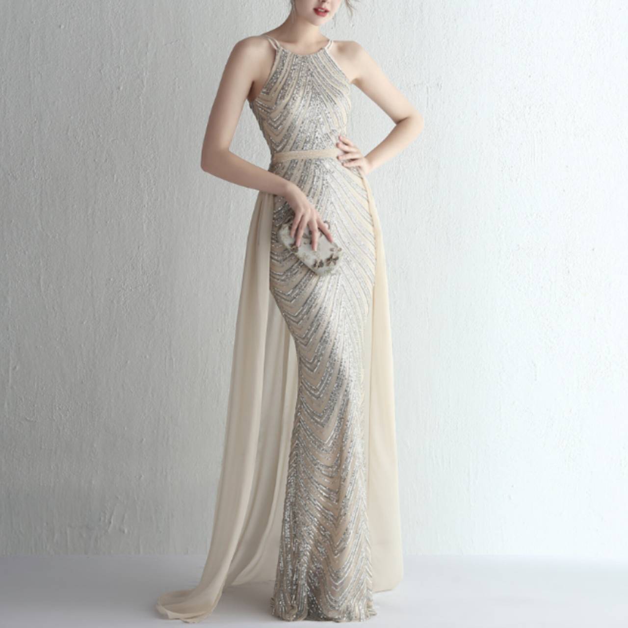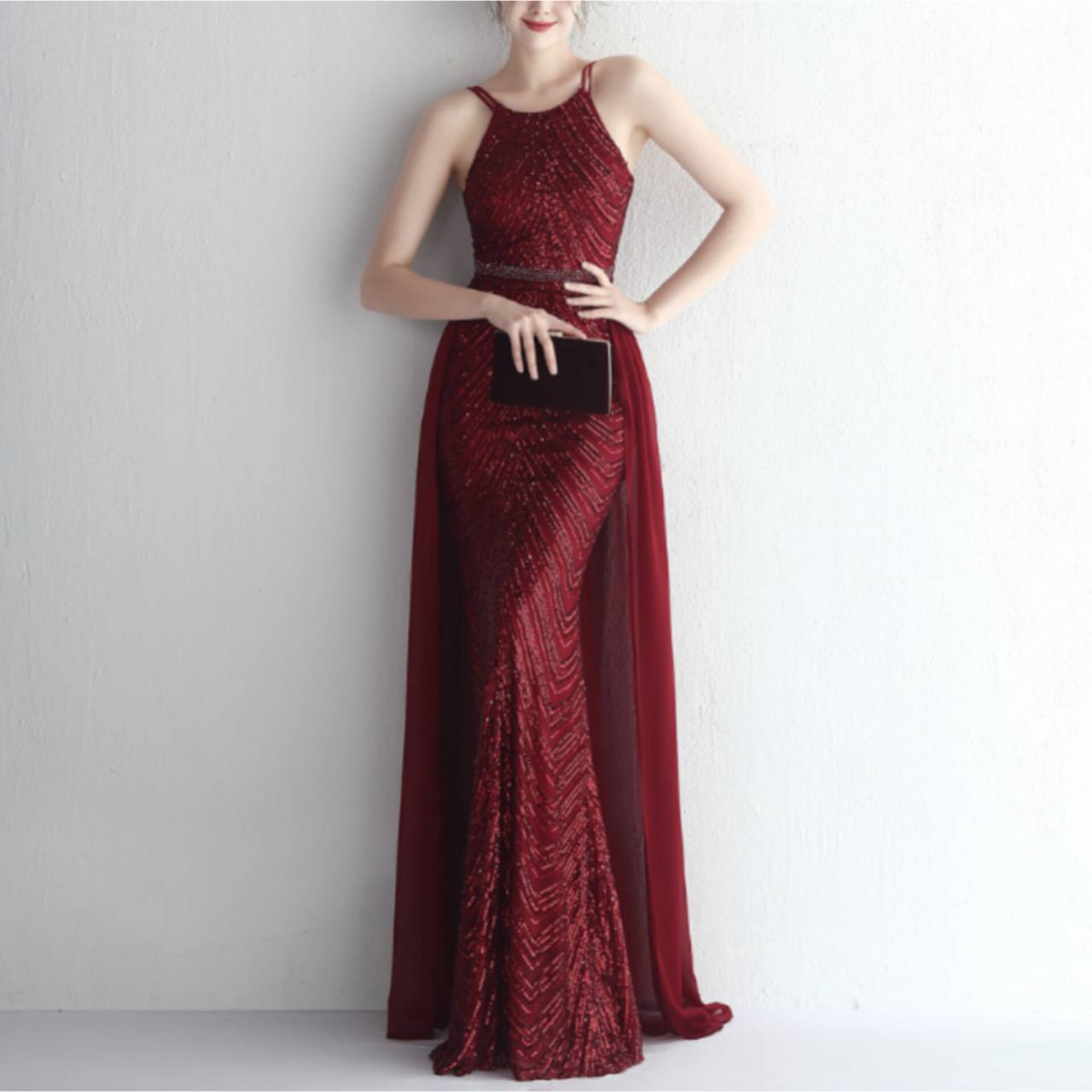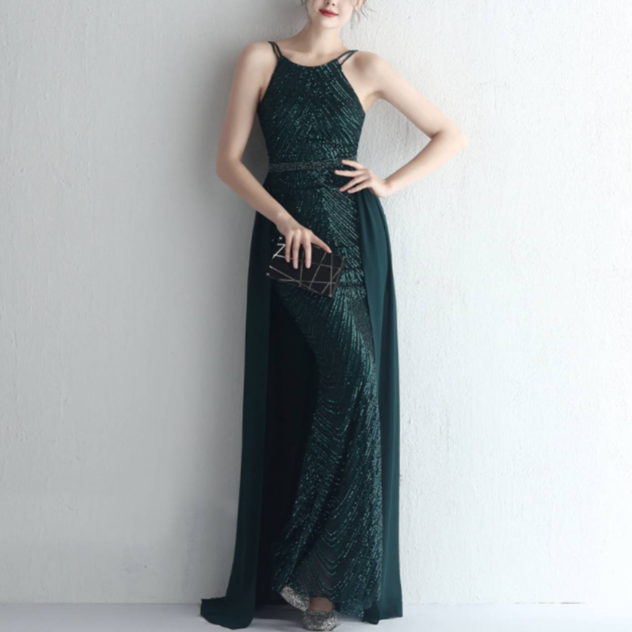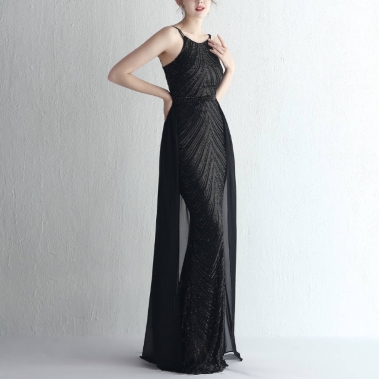 2way 全6色 ドレス イブニングドレス 韓国ドレス キャミドレス キラキラ スパンコール アメリカンスリーブ スパゲティストラップ ダブルストラップ ハイウエスト ウエストマーク ビジュー マーメイド ロング オーバースカート オーガンジー シフォン シアー 美シルエット 個性的 スタイルアップ S/2XL 韓国【K13396】