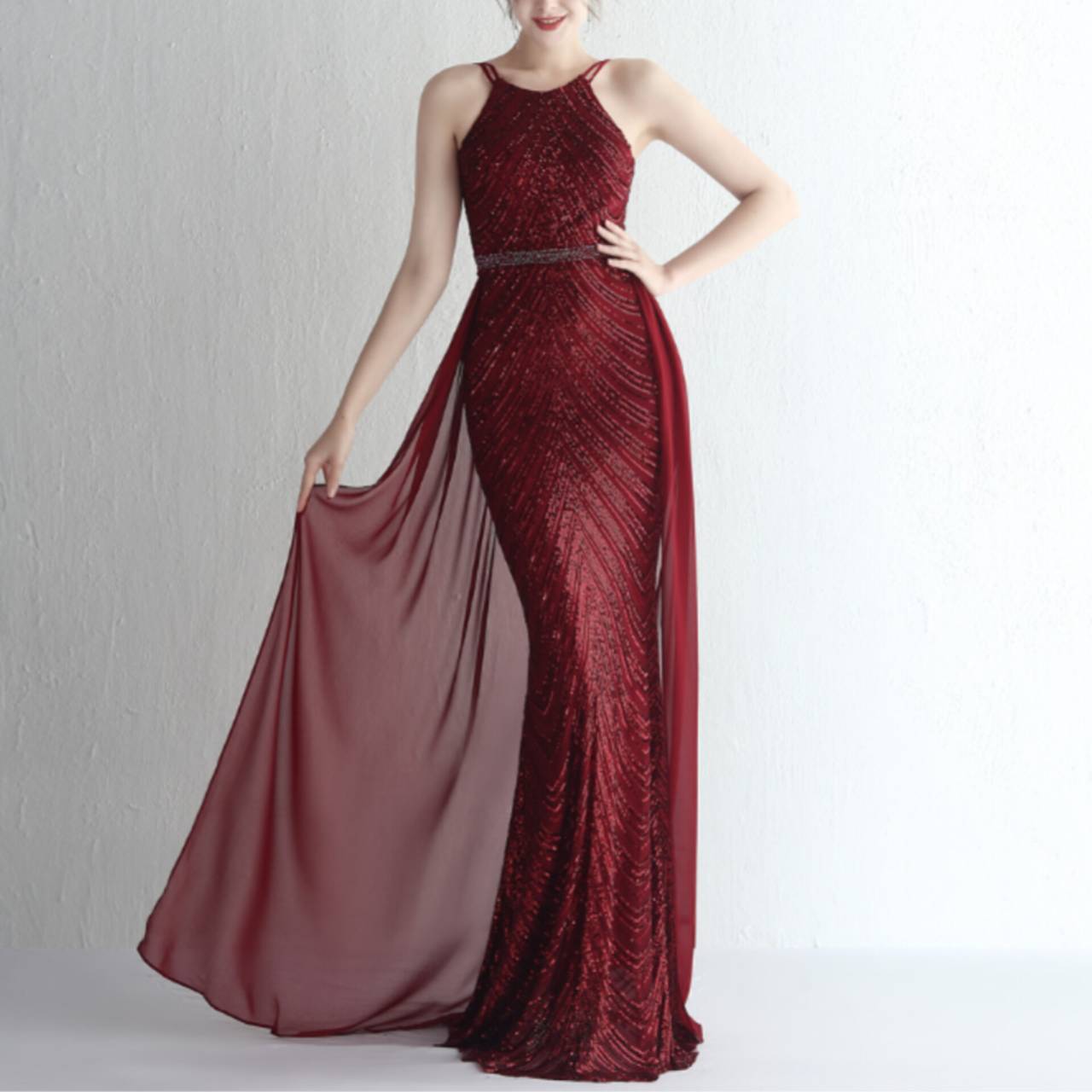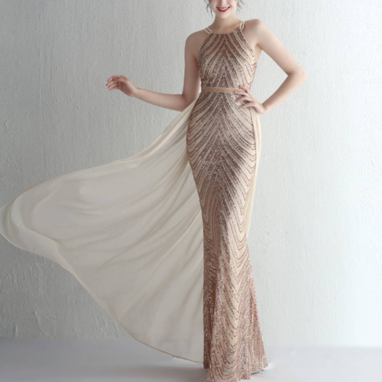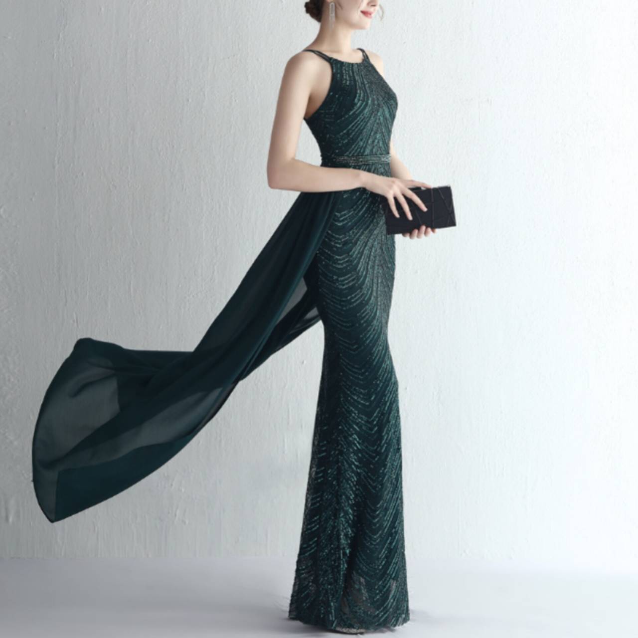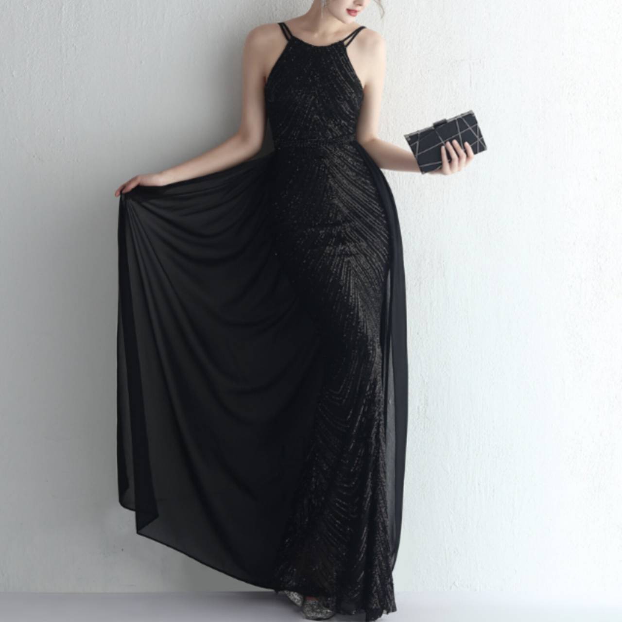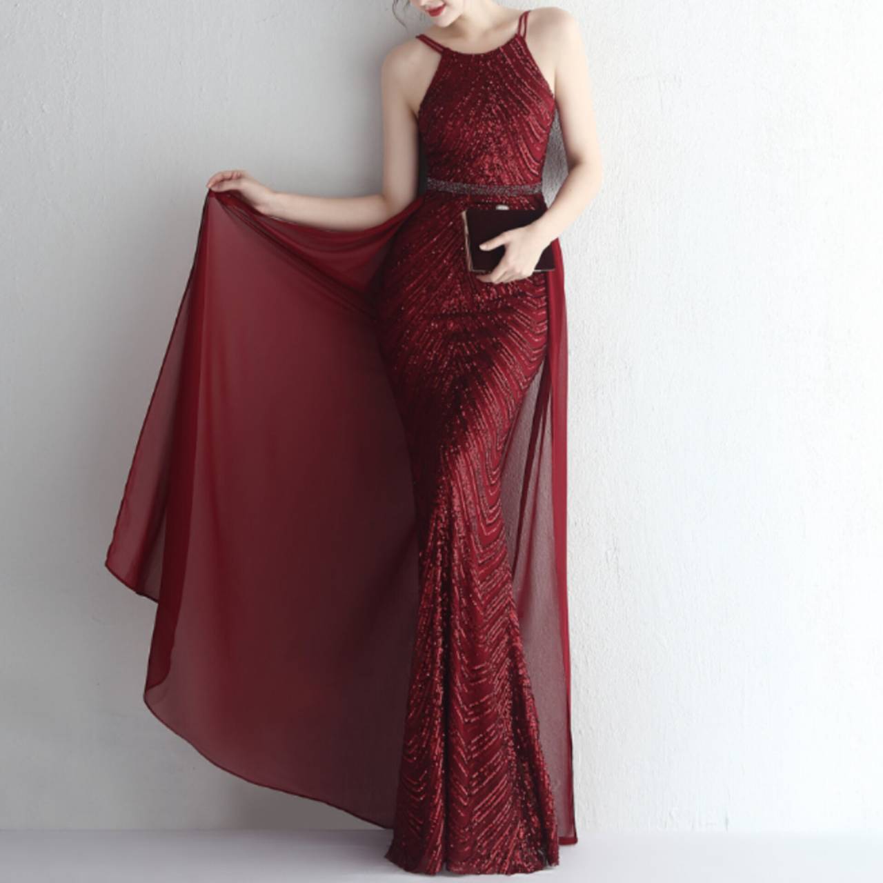 2way 全6色 ドレス イブニングドレス 韓国ドレス キャミドレス キラキラ スパンコール アメリカンスリーブ スパゲティストラップ ダブルストラップ ハイウエスト ウエストマーク ビジュー マーメイド ロング オーバースカート オーガンジー シフォン シアー 美シルエット 個性的 スタイルアップ S/2XL 韓国【K13396】