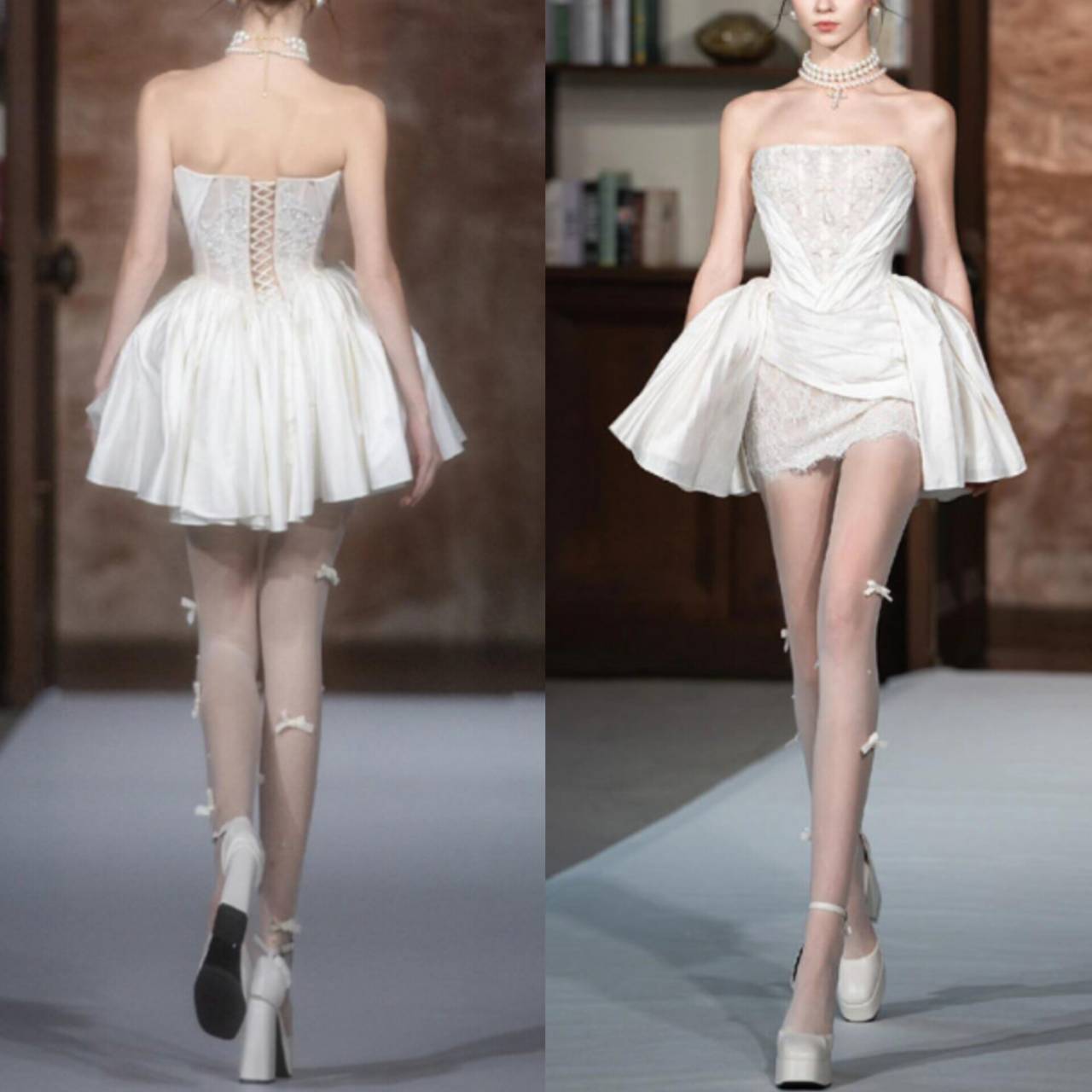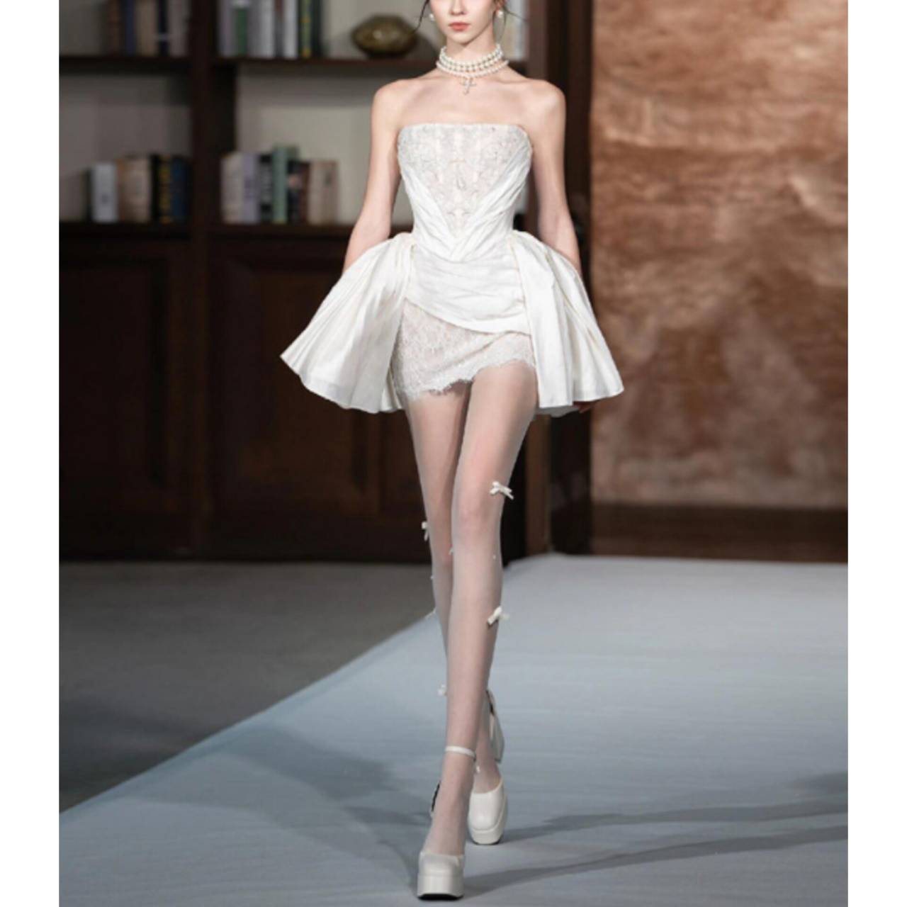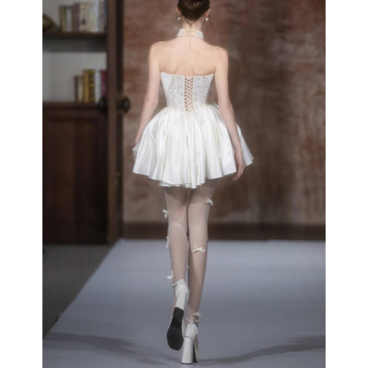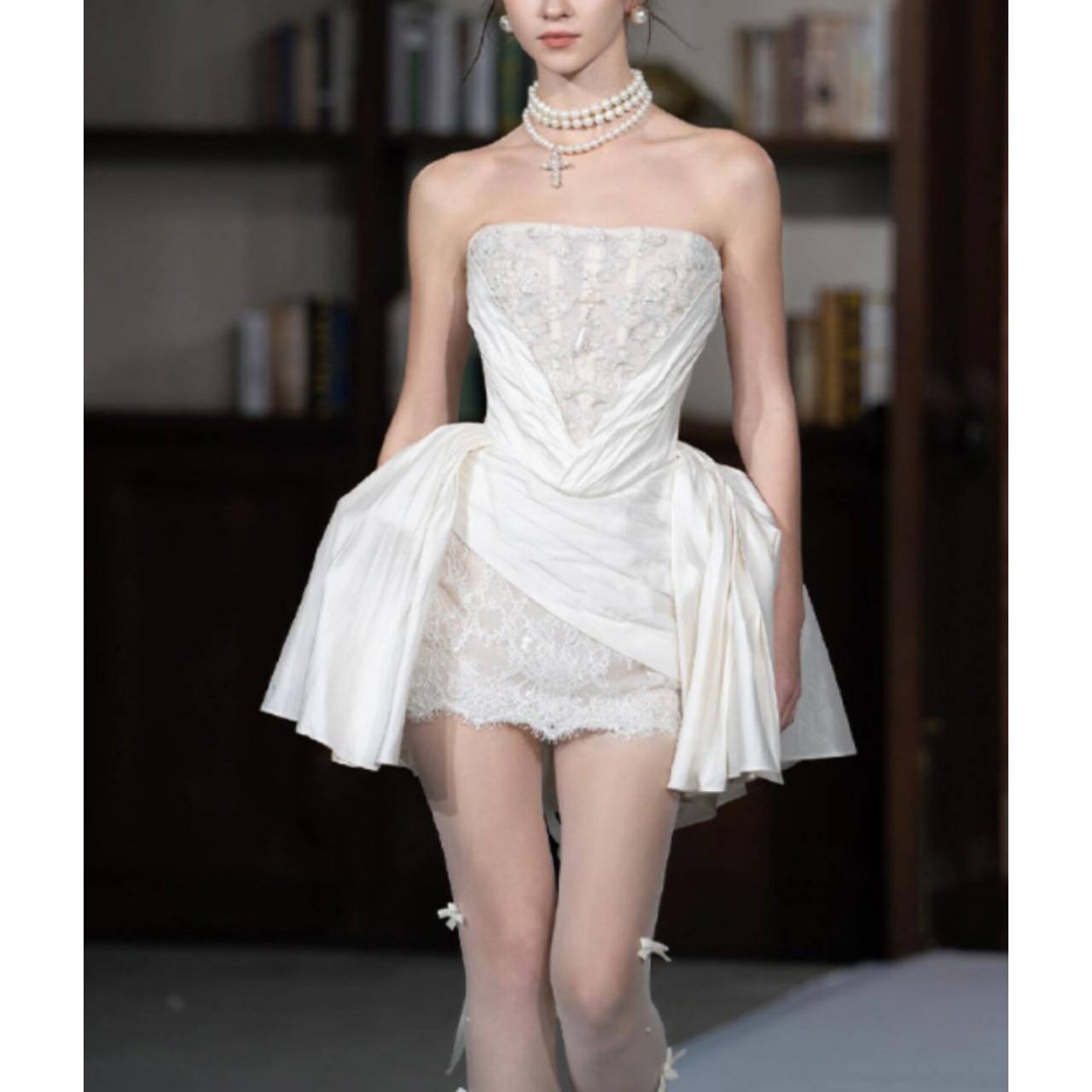 ビスチェ ウェディングドレス 韓国ドレス ビジュー キラキラ レース ハイウエスト バックレースアップ ミニ丈 ショート丈 オーバースカート サテン ドレープ タイト 異素材ミックス スタイルアップ 脚長効果 個性的 XS/2XL 韓国【K15872】