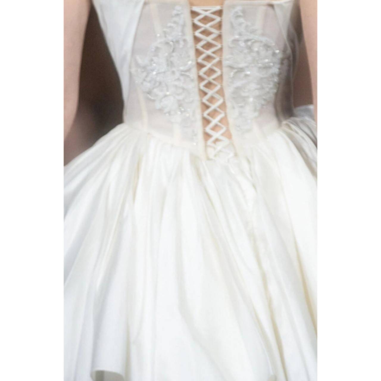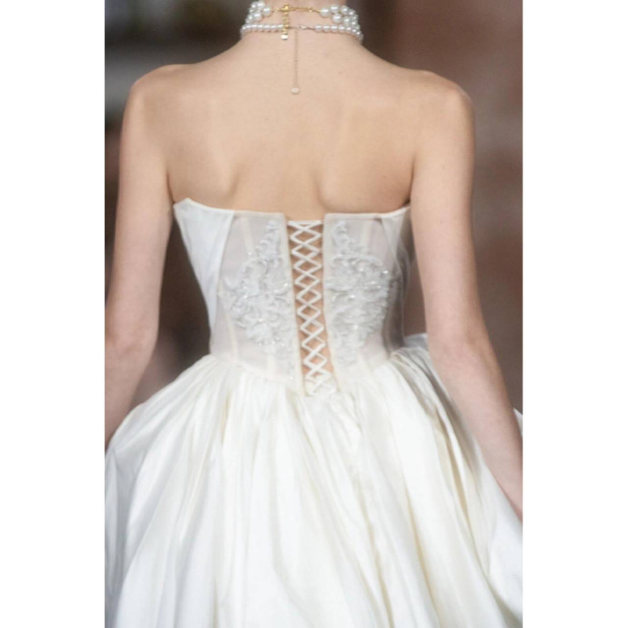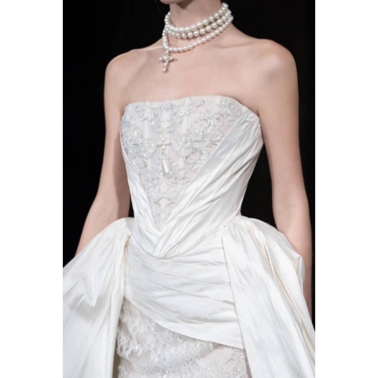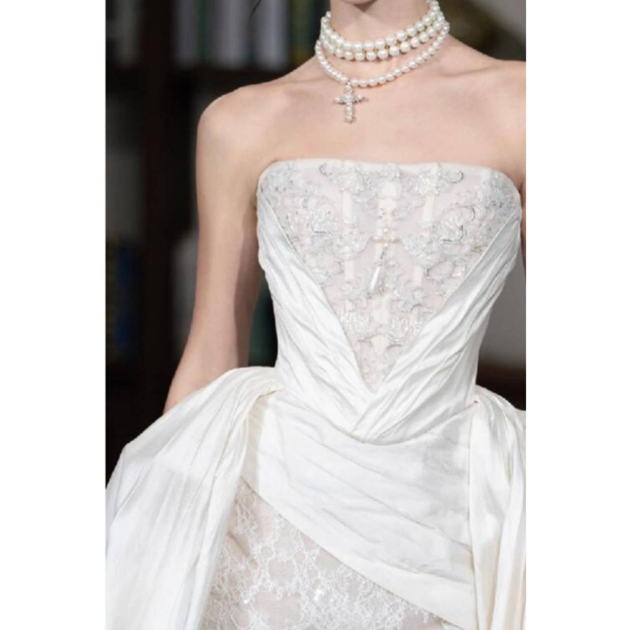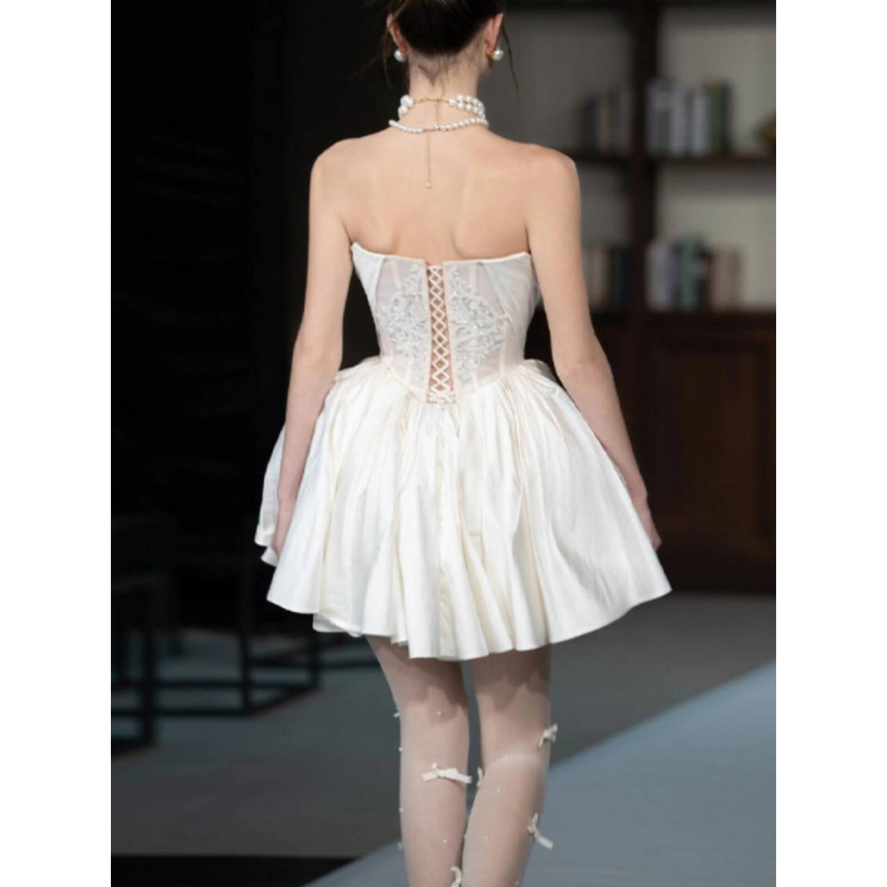 ビスチェ ウェディングドレス 韓国ドレス ビジュー キラキラ レース ハイウエスト バックレースアップ ミニ丈 ショート丈 オーバースカート サテン ドレープ タイト 異素材ミックス スタイルアップ 脚長効果 個性的 XS/2XL 韓国【K15872】