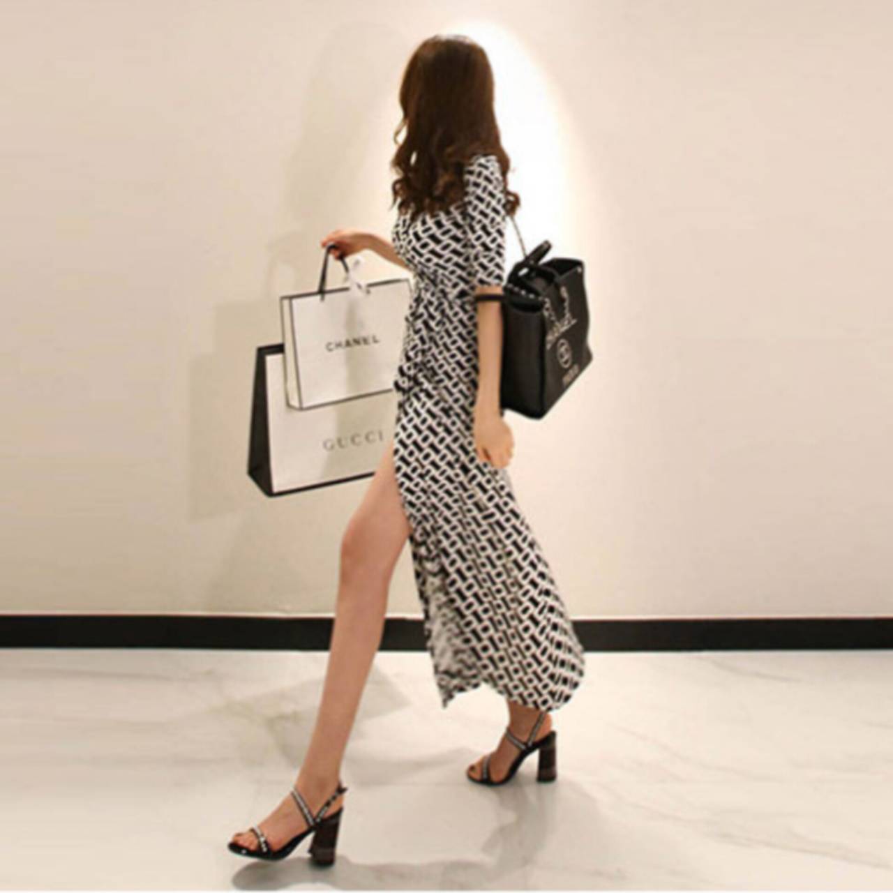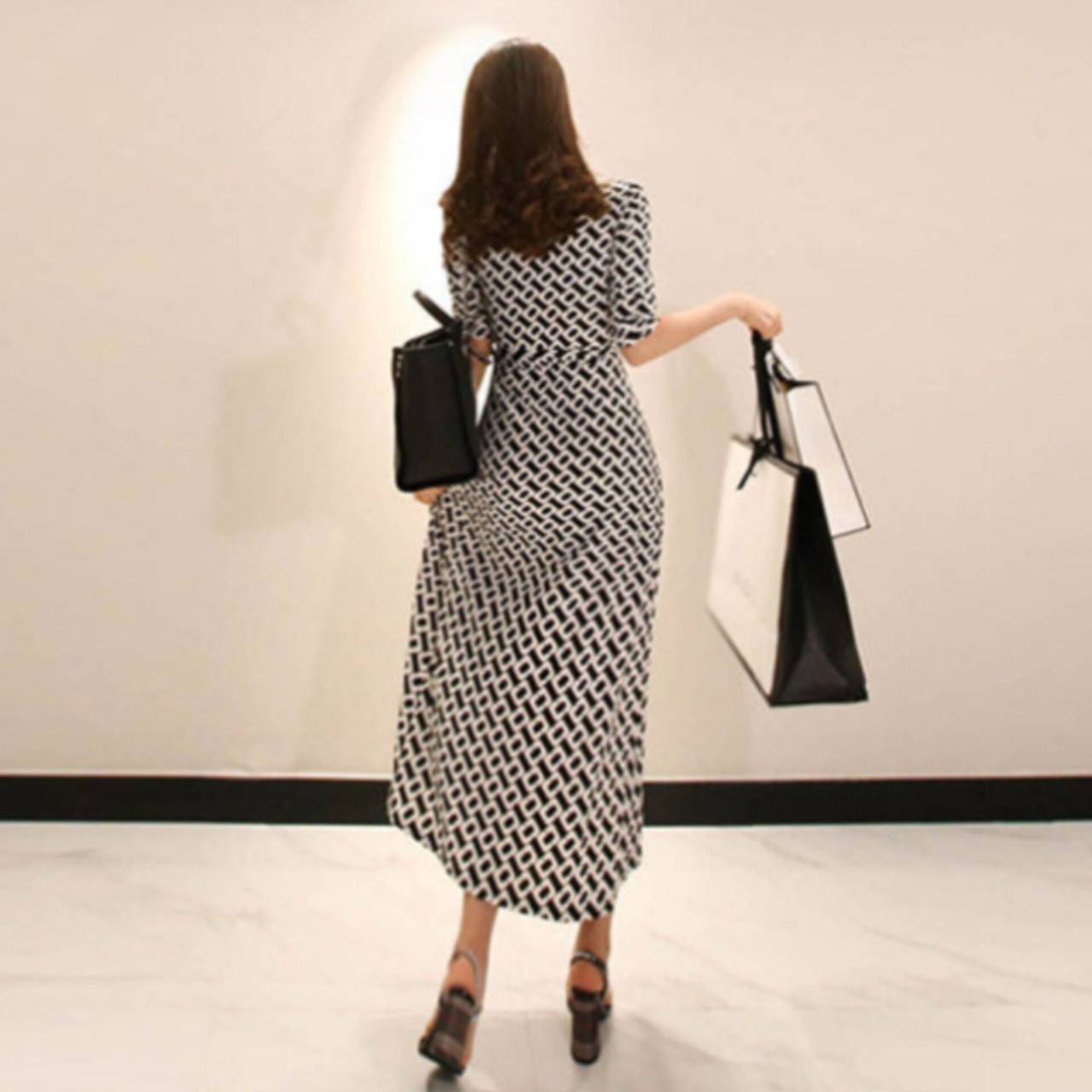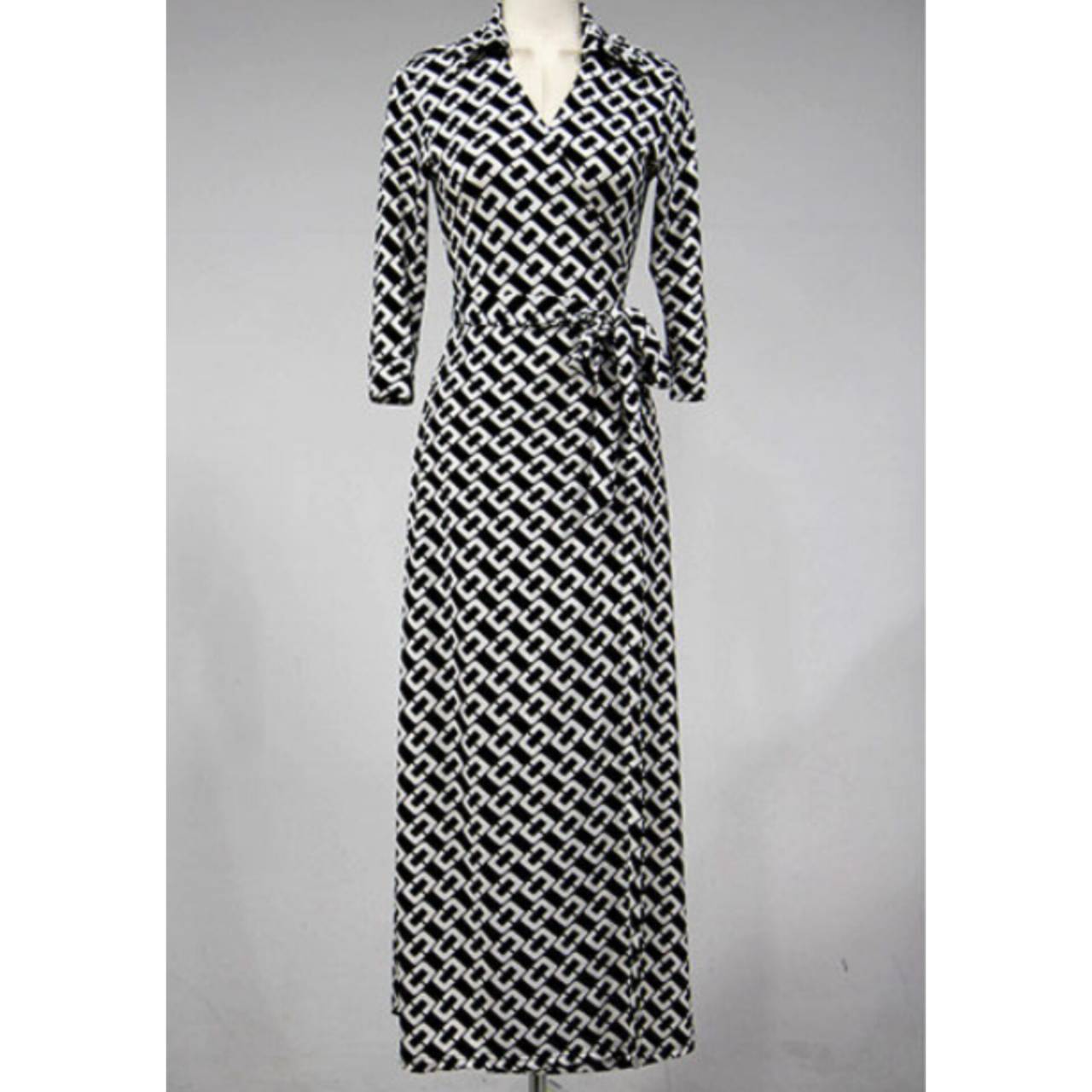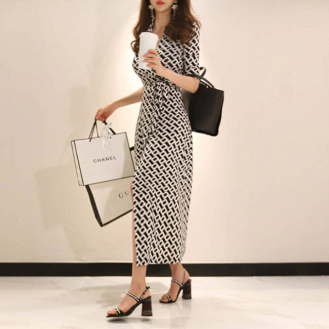 総柄 ワンピース ラップドレス ドレス 襟付き 5分袖 カシュクール ウエストリボン ハイウエスト スリット ロング 美脚効果 S/2XL 韓国【B414】