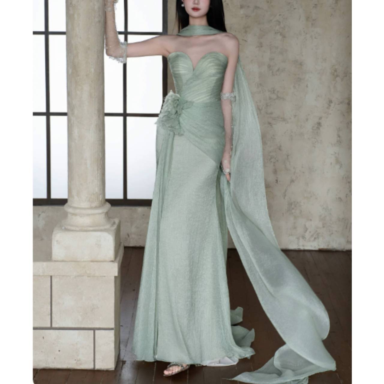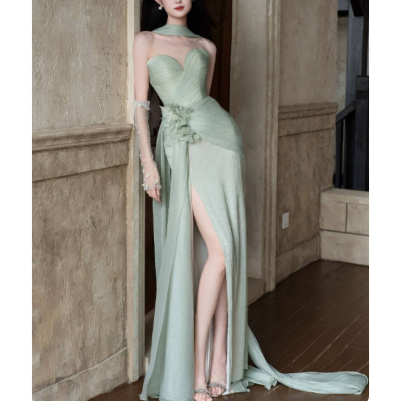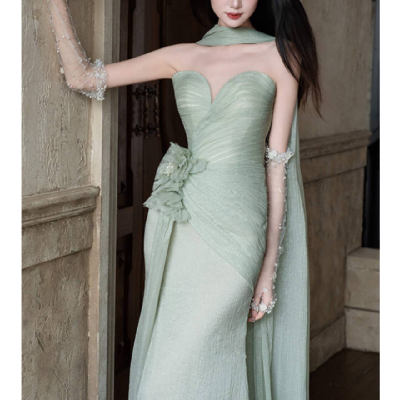 透明感あふれるライトグリーンが、あなたの肌を美しく引き立て、上品で凛とした存在感を放つ一着。