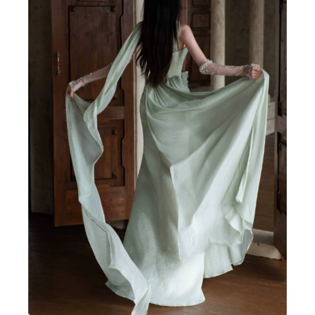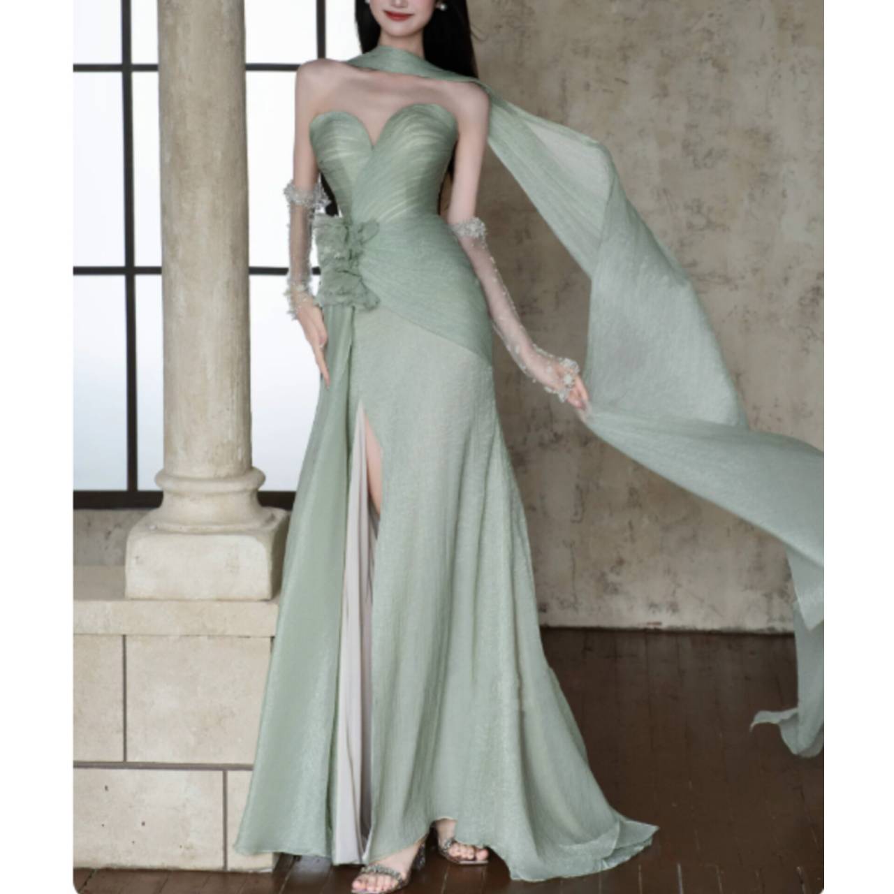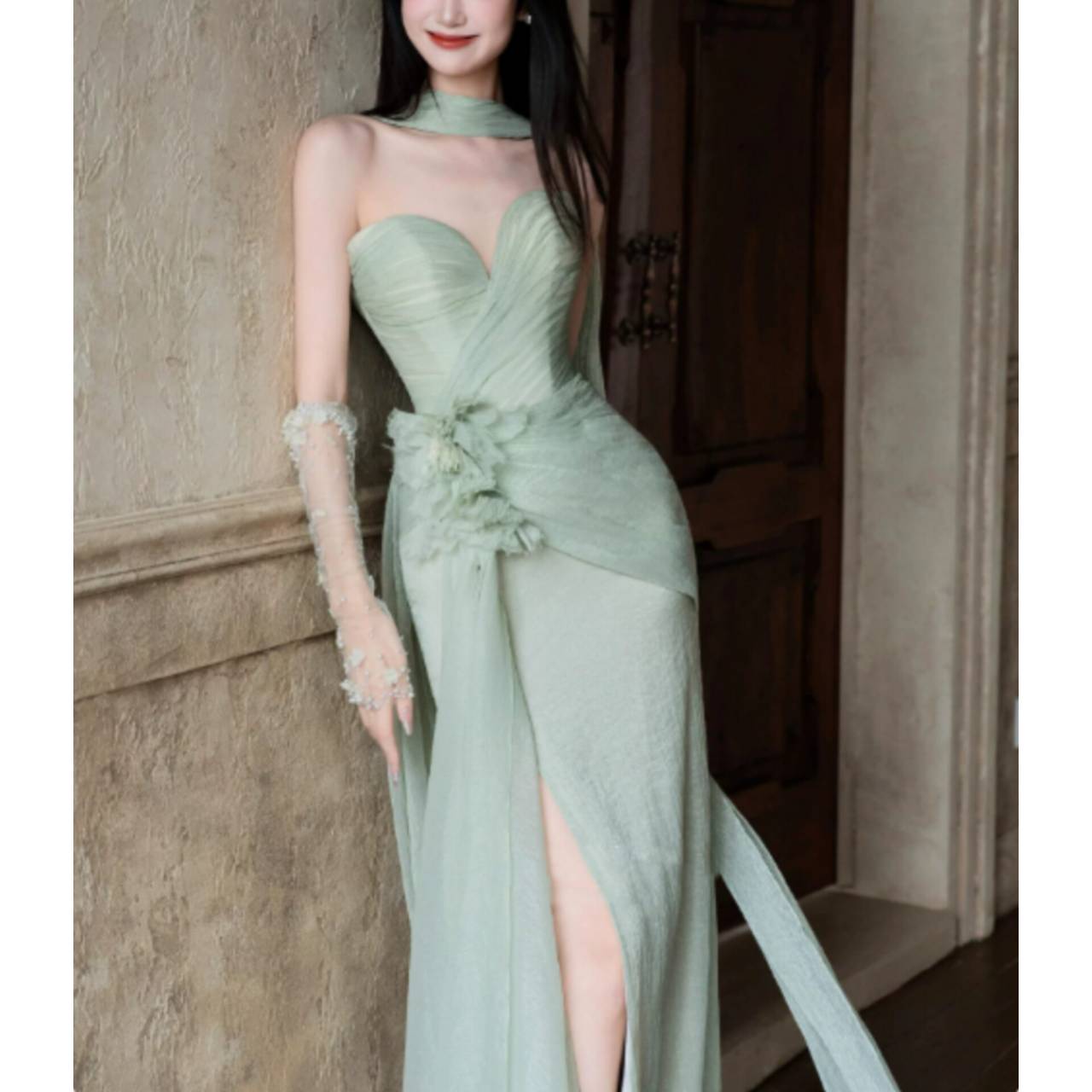 透明感あふれるライトグリーンが、あなたの肌を美しく引き立て、上品で凛とした存在感を放つ一着。