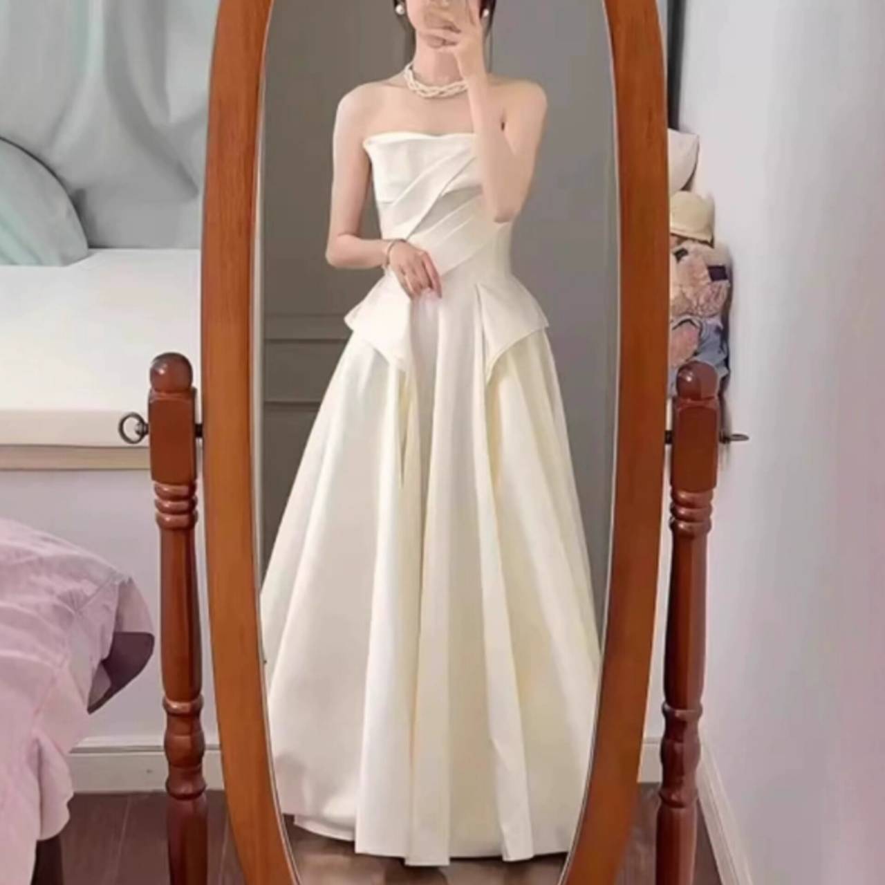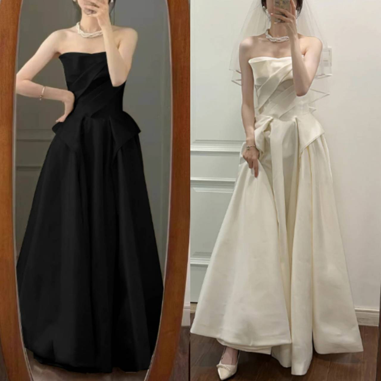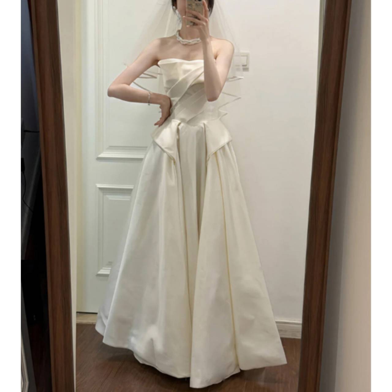 全2色 ウェディングドレス 韓国ドレス ビスチェ ハートカット ストラップレス ドレープ ハイウエスト ペプラムライク Aライン フレア ロング エレガント 体型カバー XS/3XL 韓国【B18344】