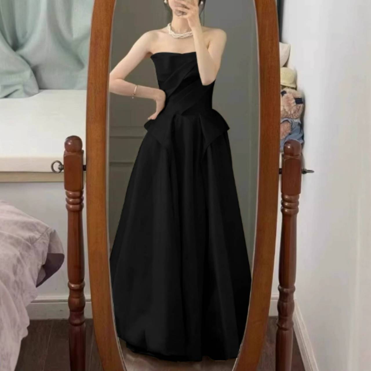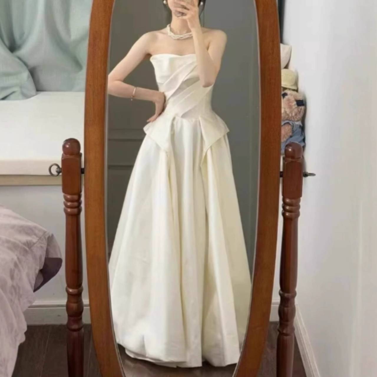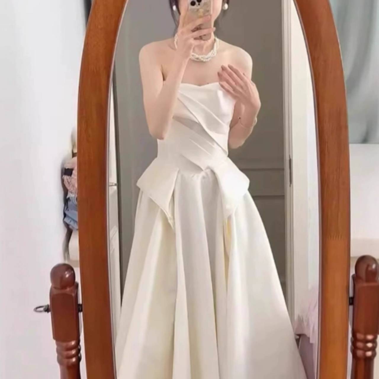全2色 ウェディングドレス 韓国ドレス ビスチェ ハートカット ストラップレス ドレープ ハイウエスト ペプラムライク Aライン フレア ロング エレガント 体型カバー XS/3XL 韓国【B18344】