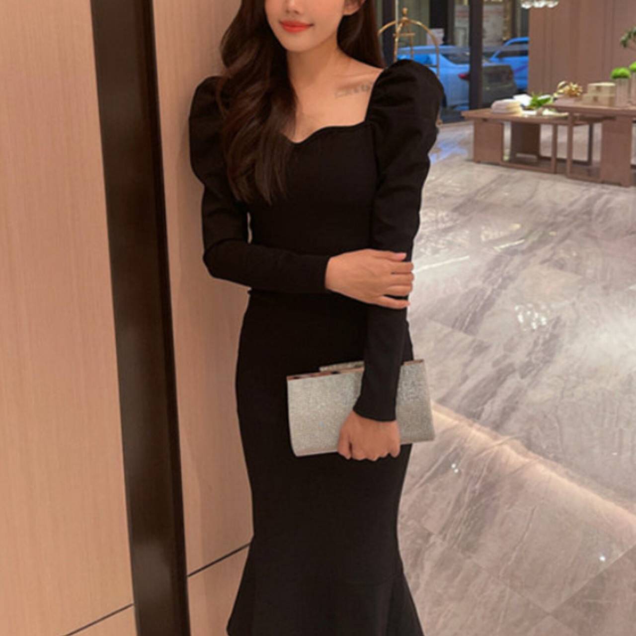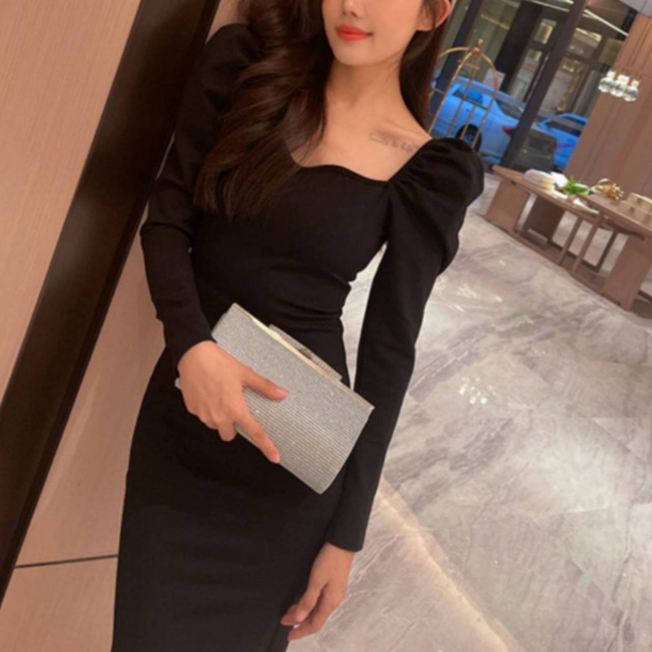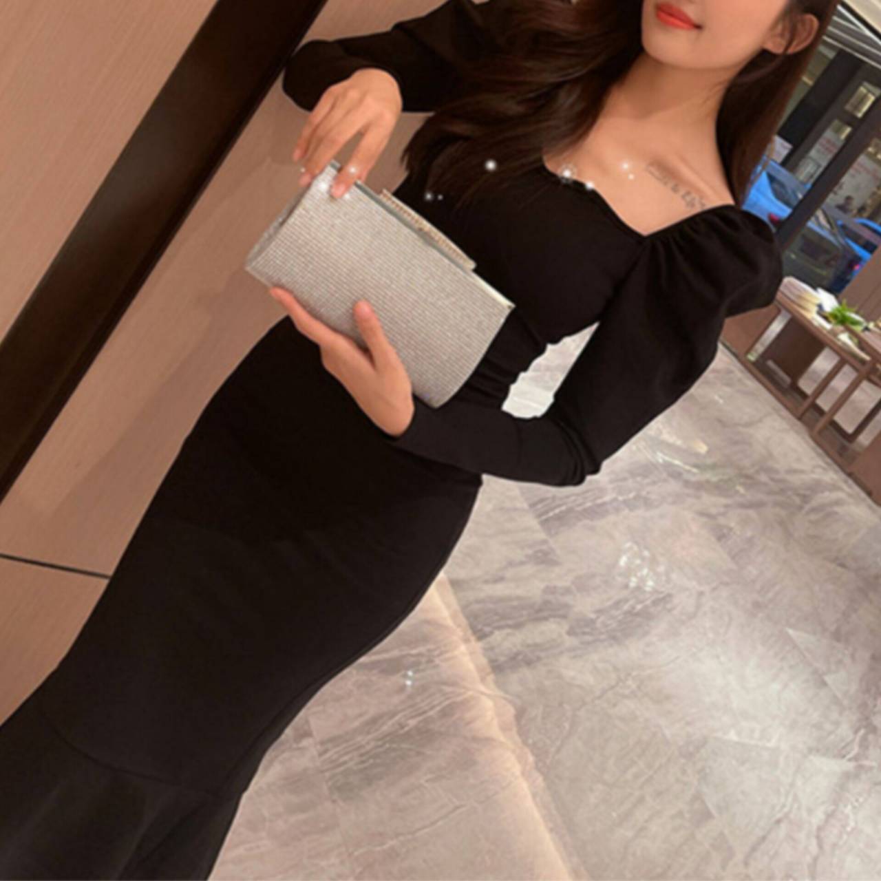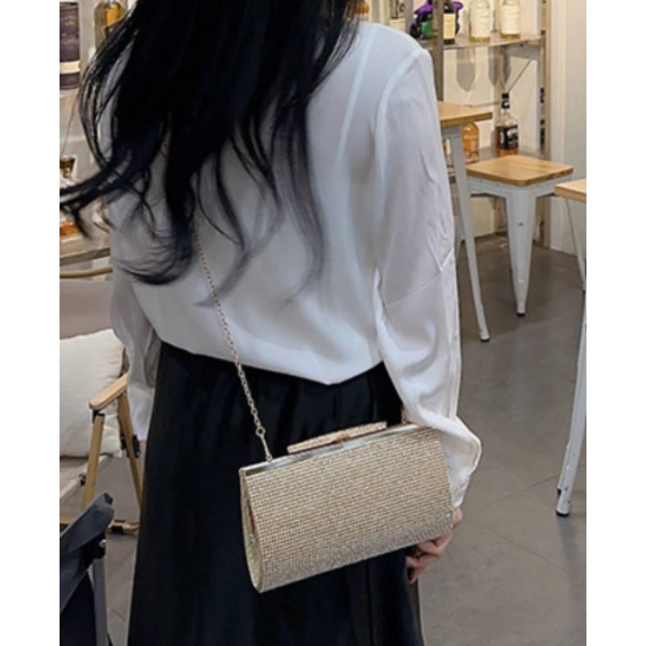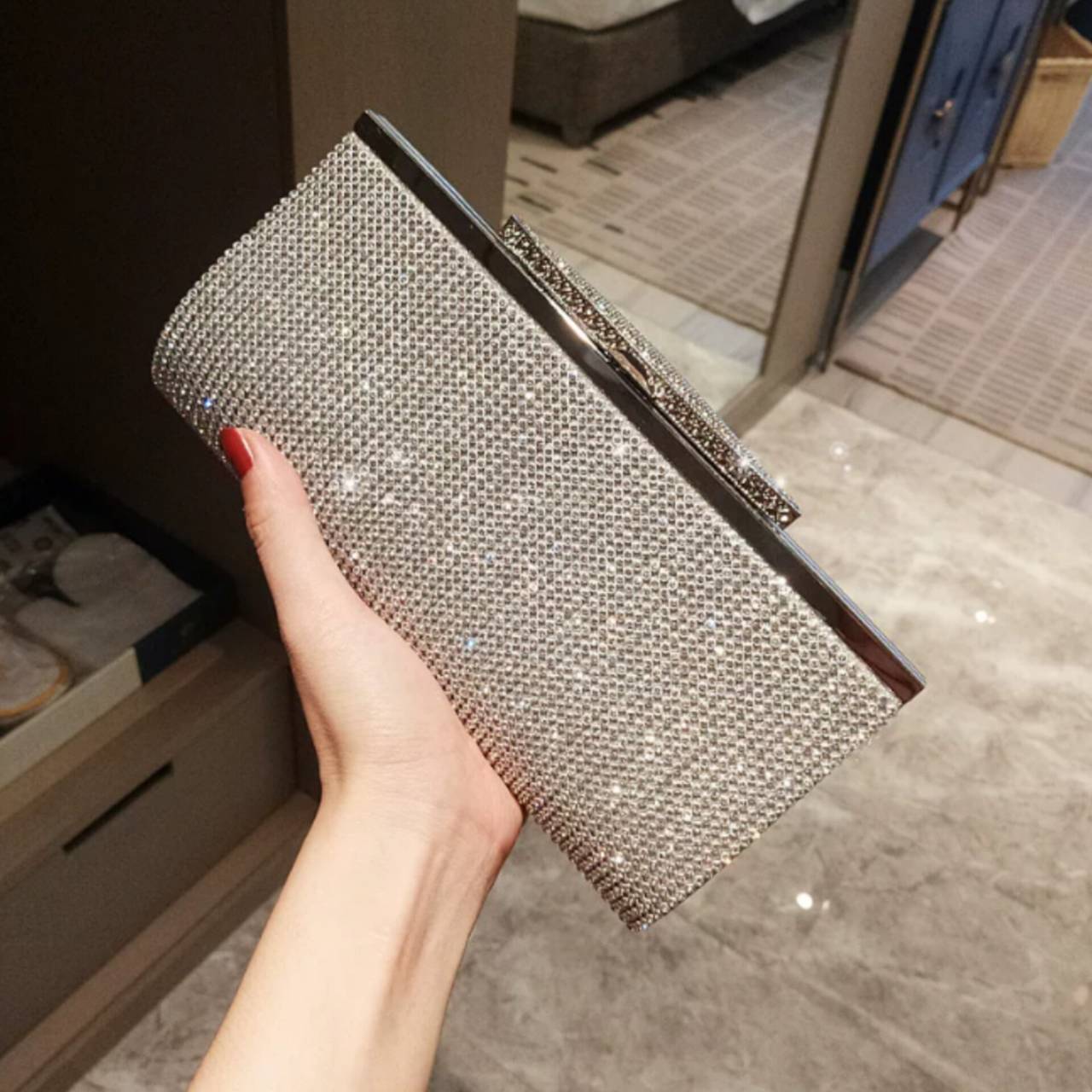 光を受けるたび細やかに反射し、会場の照明やフラッシュ撮影でも美しく存在感を放ちます。硬質フレーム仕様のしっかりとしたフォルムは型崩れしにくく、ドレススタイルを上品に格上げ。
