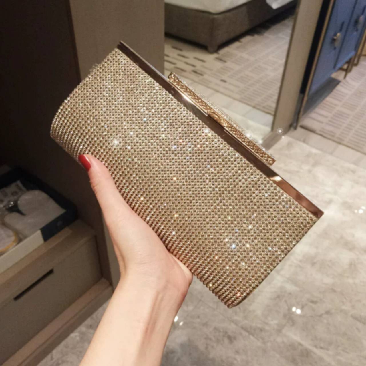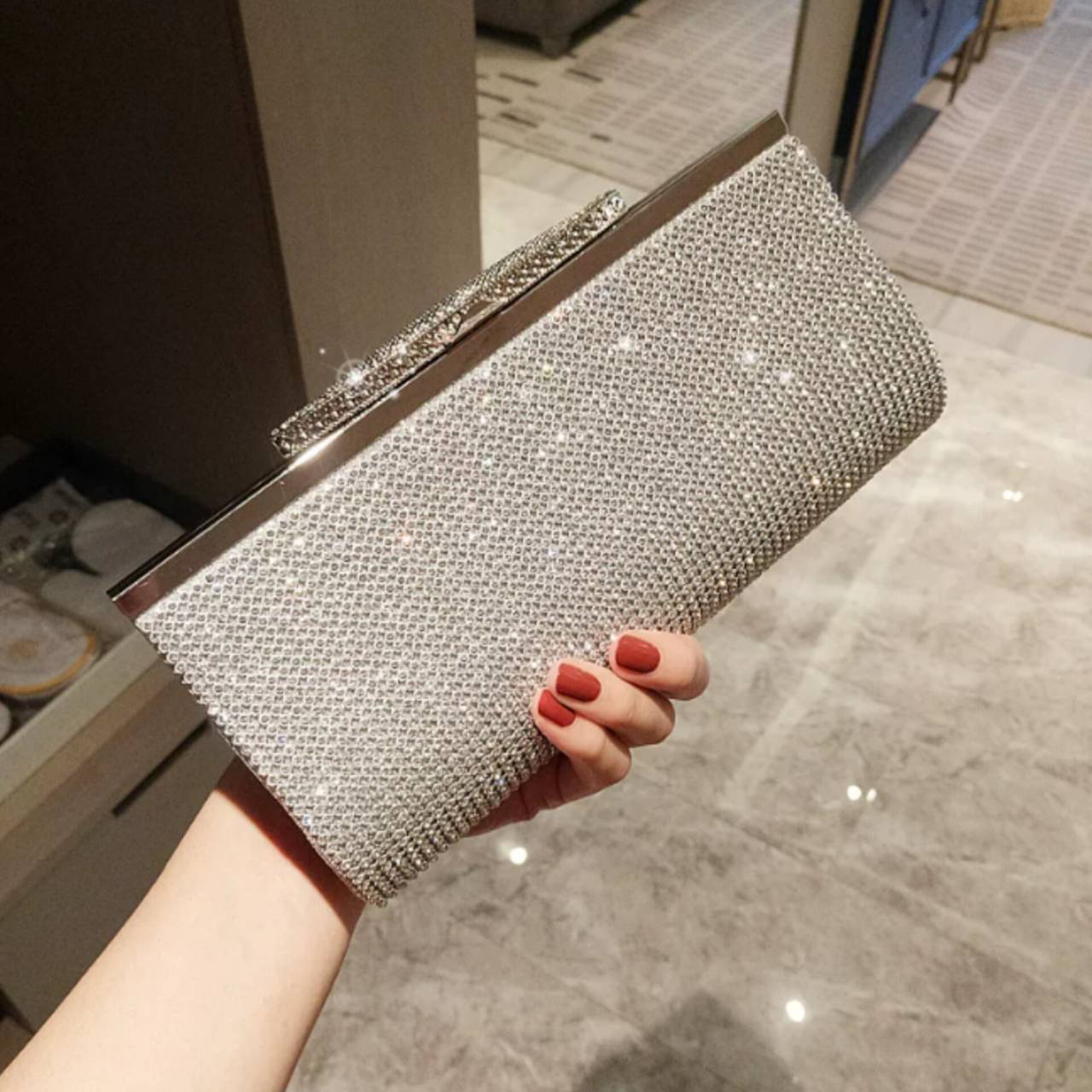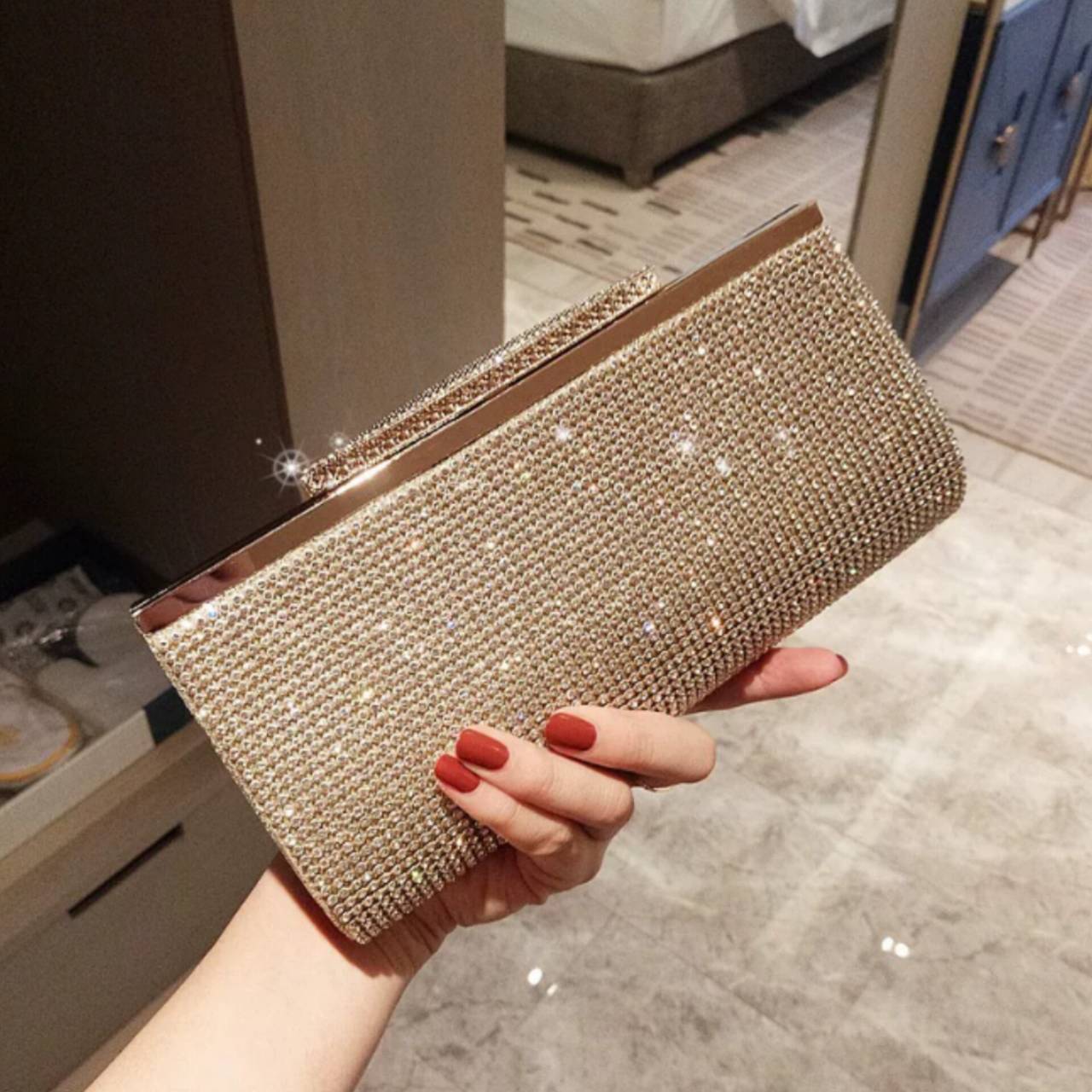 持った瞬間、いつもの装いがパーティースタイルへ変わるラグジュアリークラッチバッグ。全面に繊細なラインストーンを贅沢に敷き詰めた、高級感あふれるパーティーバッグ。