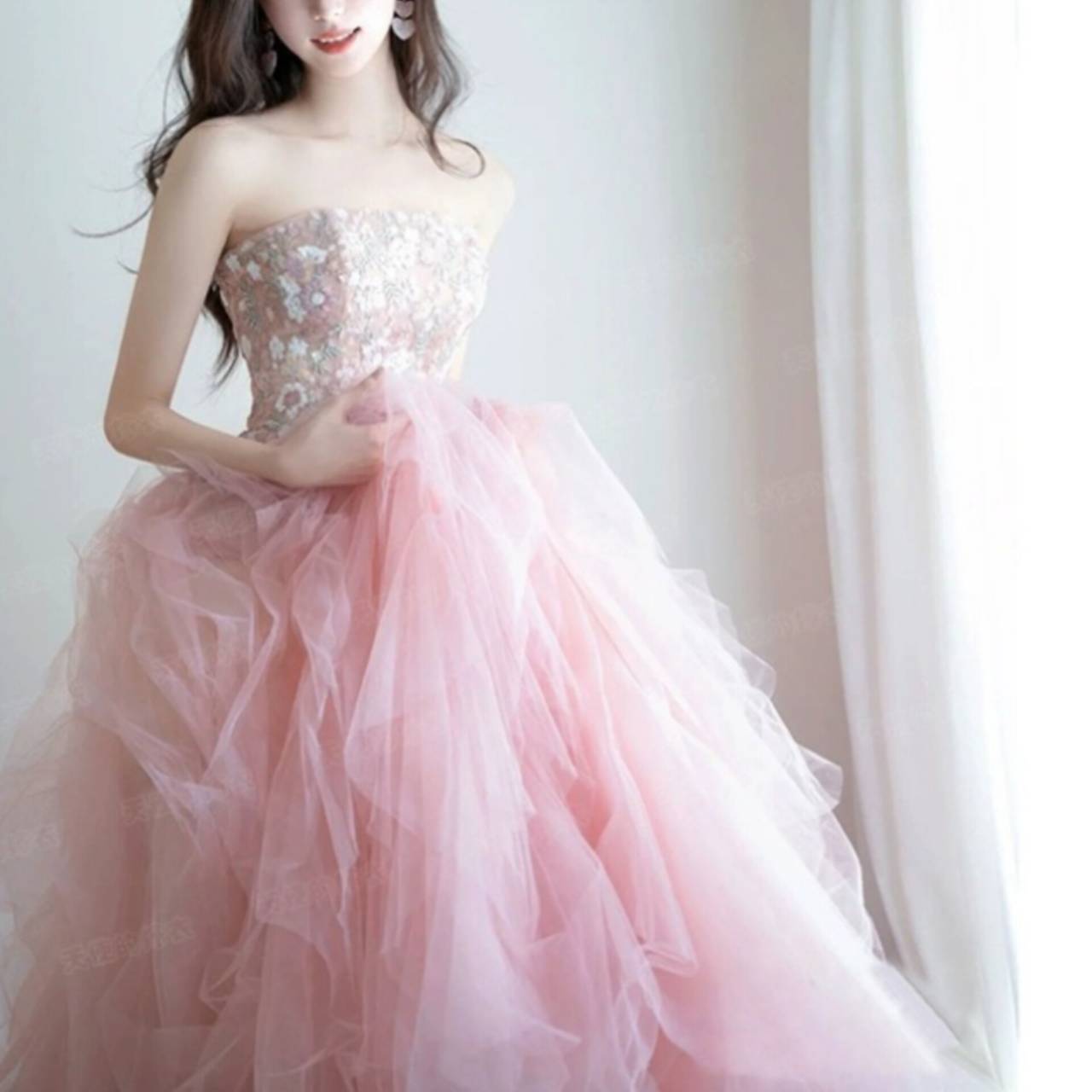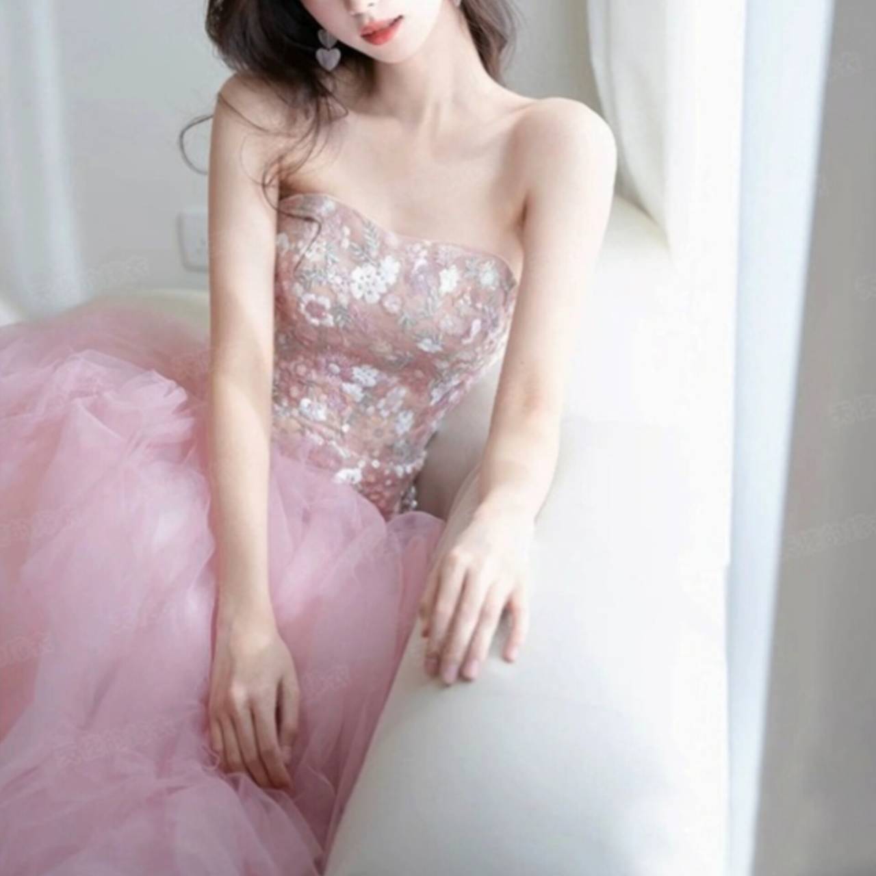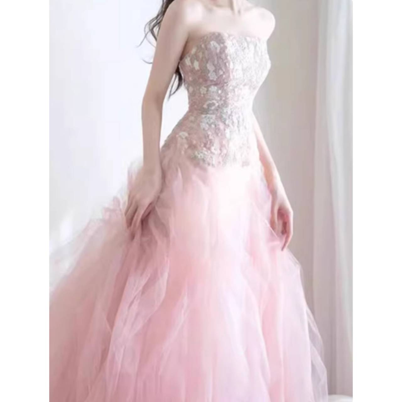 ビスチェ ハートカット ドレス イブニングドレス 韓国ドレス キラキラ お花 花柄 ビジュー スパンコール ハイウエスト チュール Aライン プリンセスライン ボールガウン シアー ボリュームスカート シアー ロング ピンク エレガント 体型カバー リュクス XS/2XL 韓国【B14154】