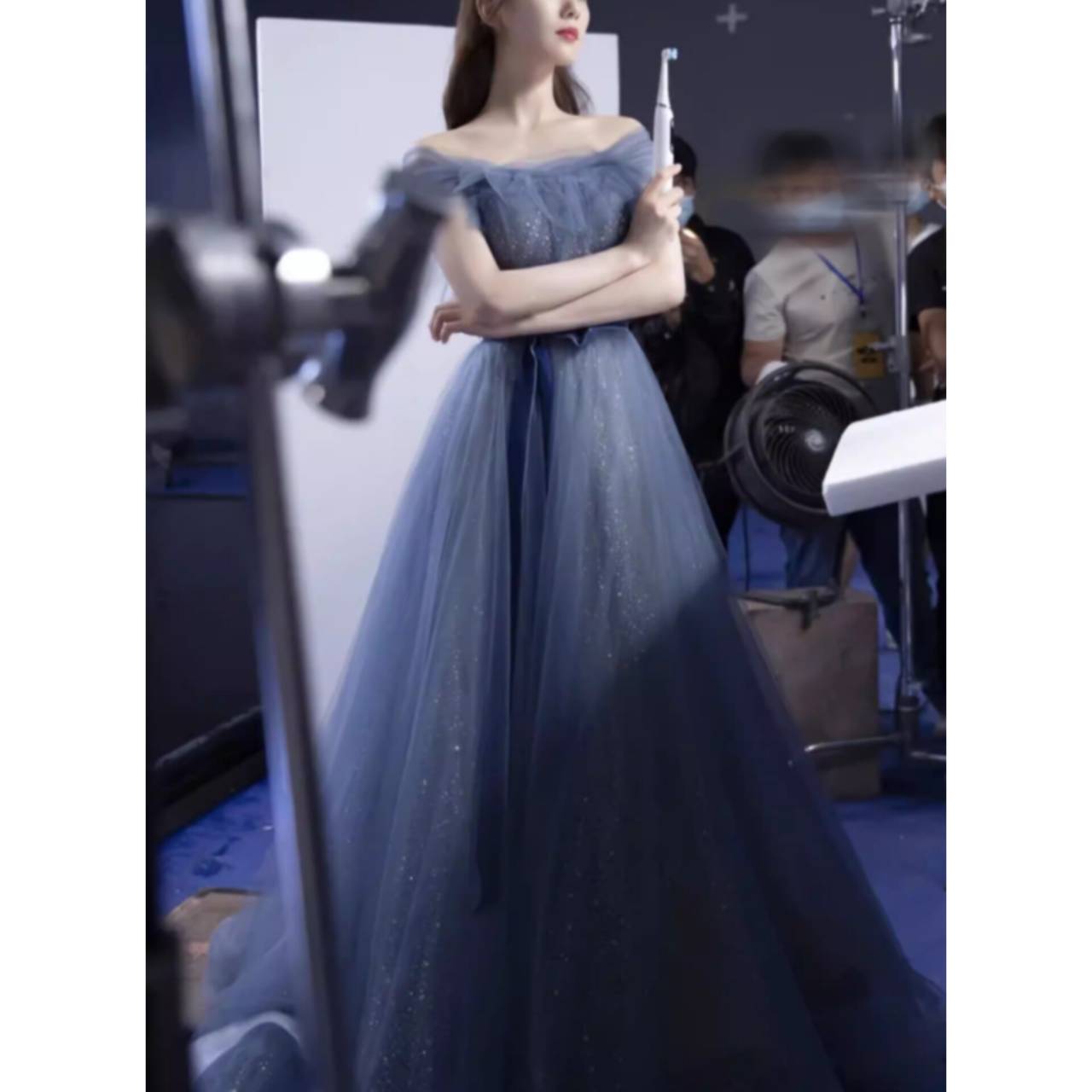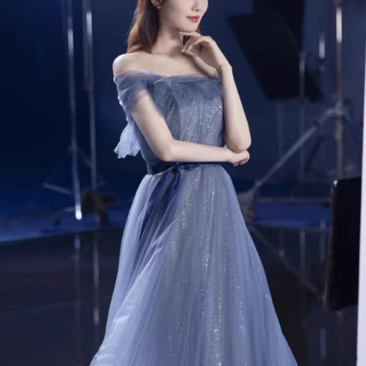 ライトの下でほのかに輝くブルーは、肌を明るく見せ、清楚さと華やかさを同時に叶える絶妙な色味。