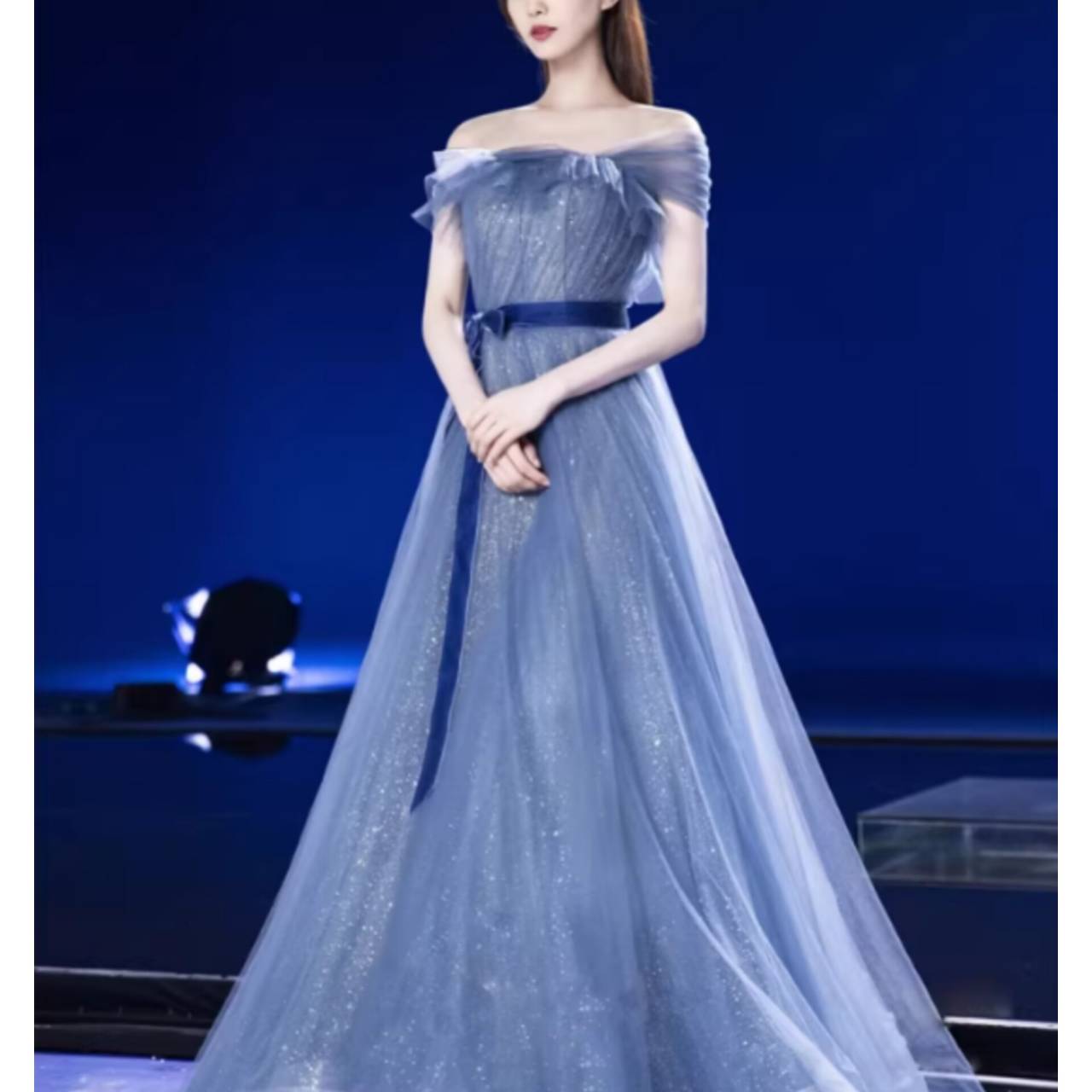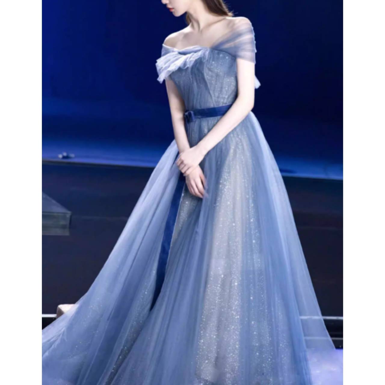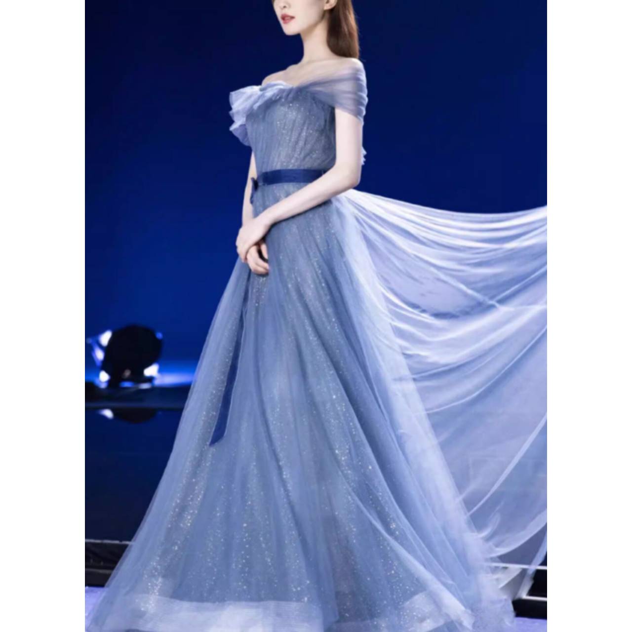 一歩踏み出した瞬間、視線を奪うブルーグリッタードレス。繊細なラメを贅沢に散りばめた上質チュール素材を使用。