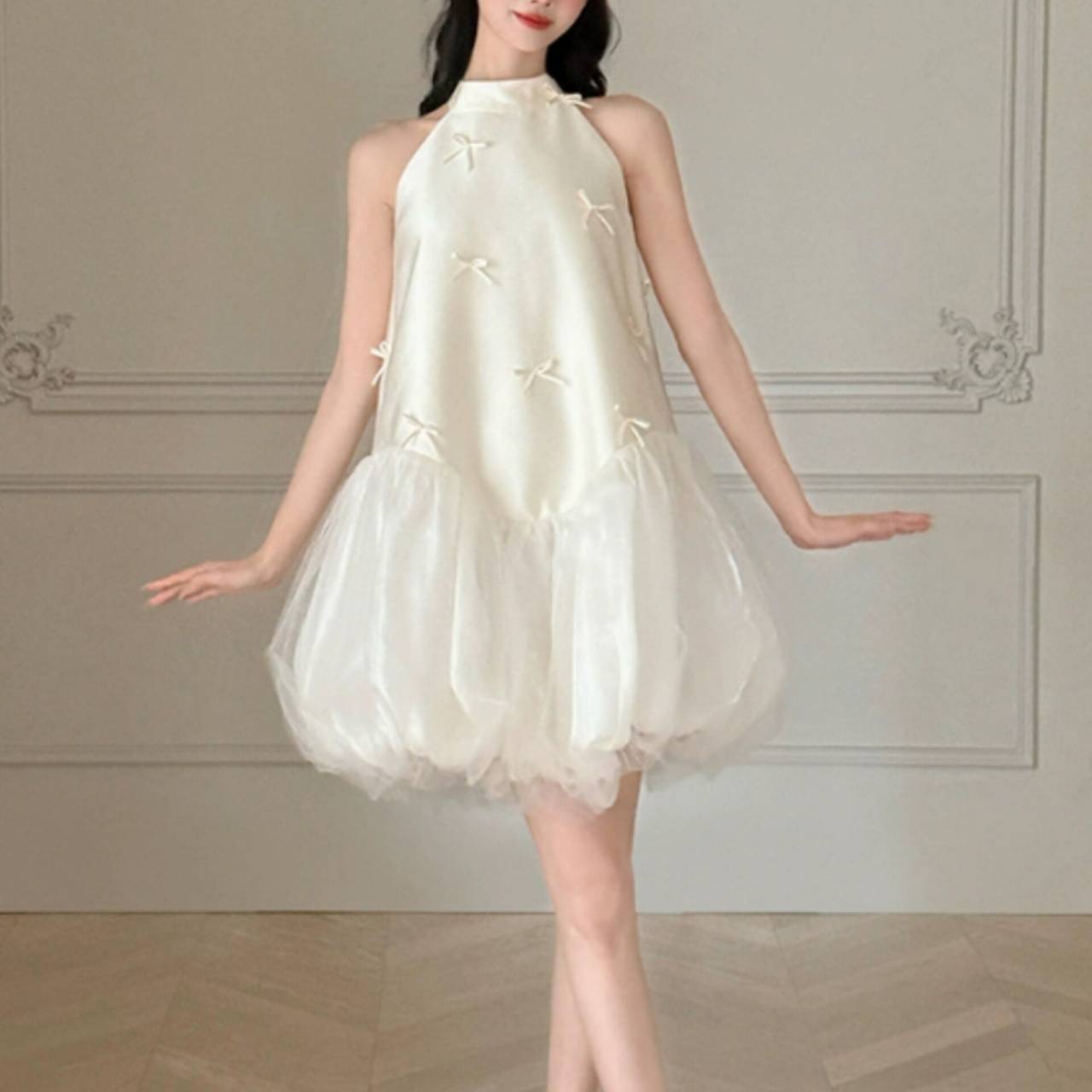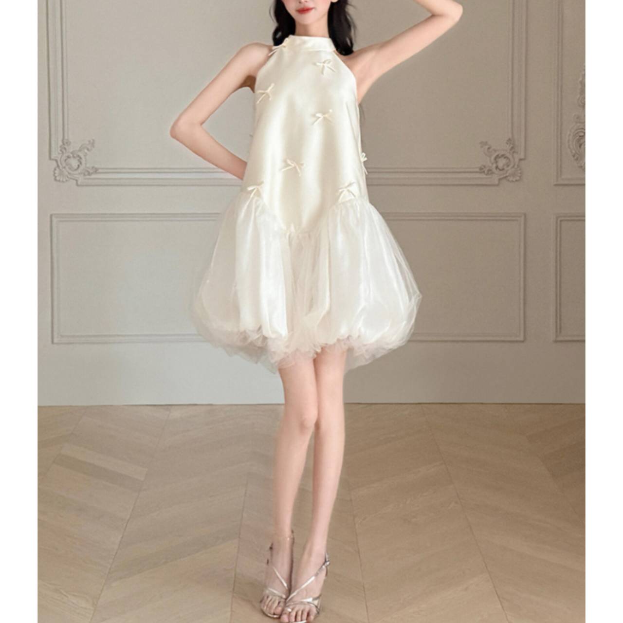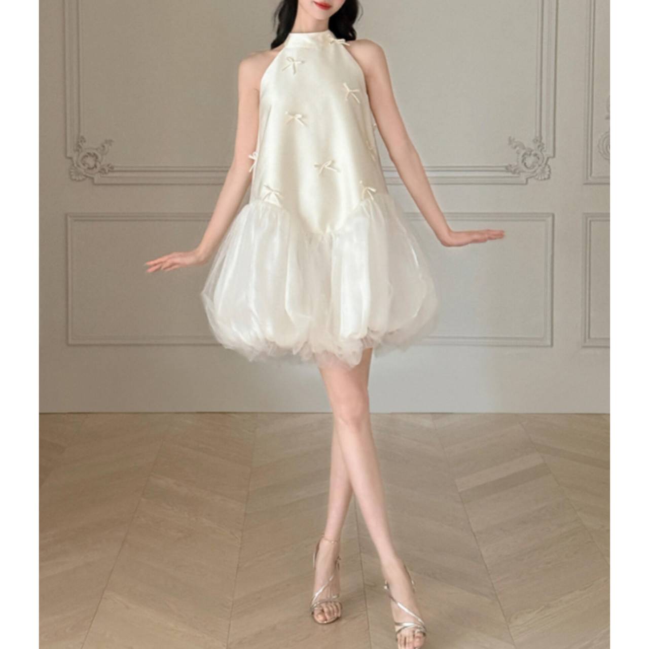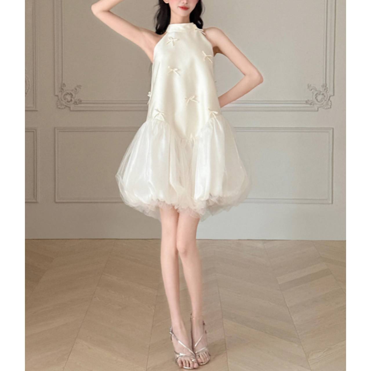 なめらかなサテンが上半身をすっきり見せ、小さなリボンディテールが繊細な可愛らしさを演出します。首元は上品なホルターネック仕様でデコルテを美しく強調し、自然と縦ラインをつくるシルエット設計により脚長効果も抜群。